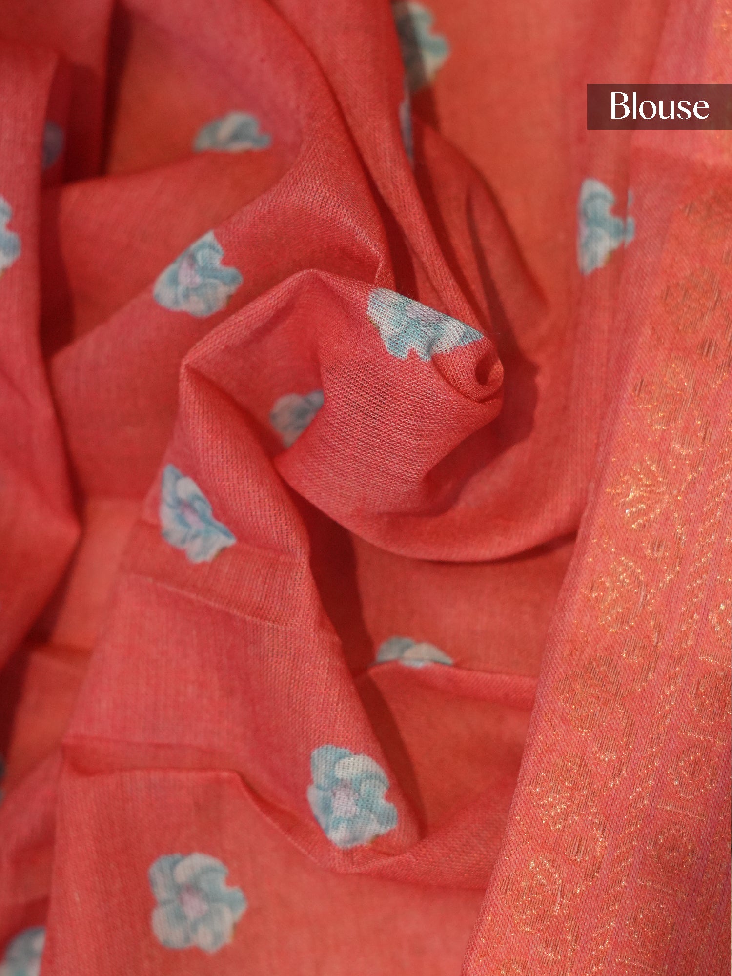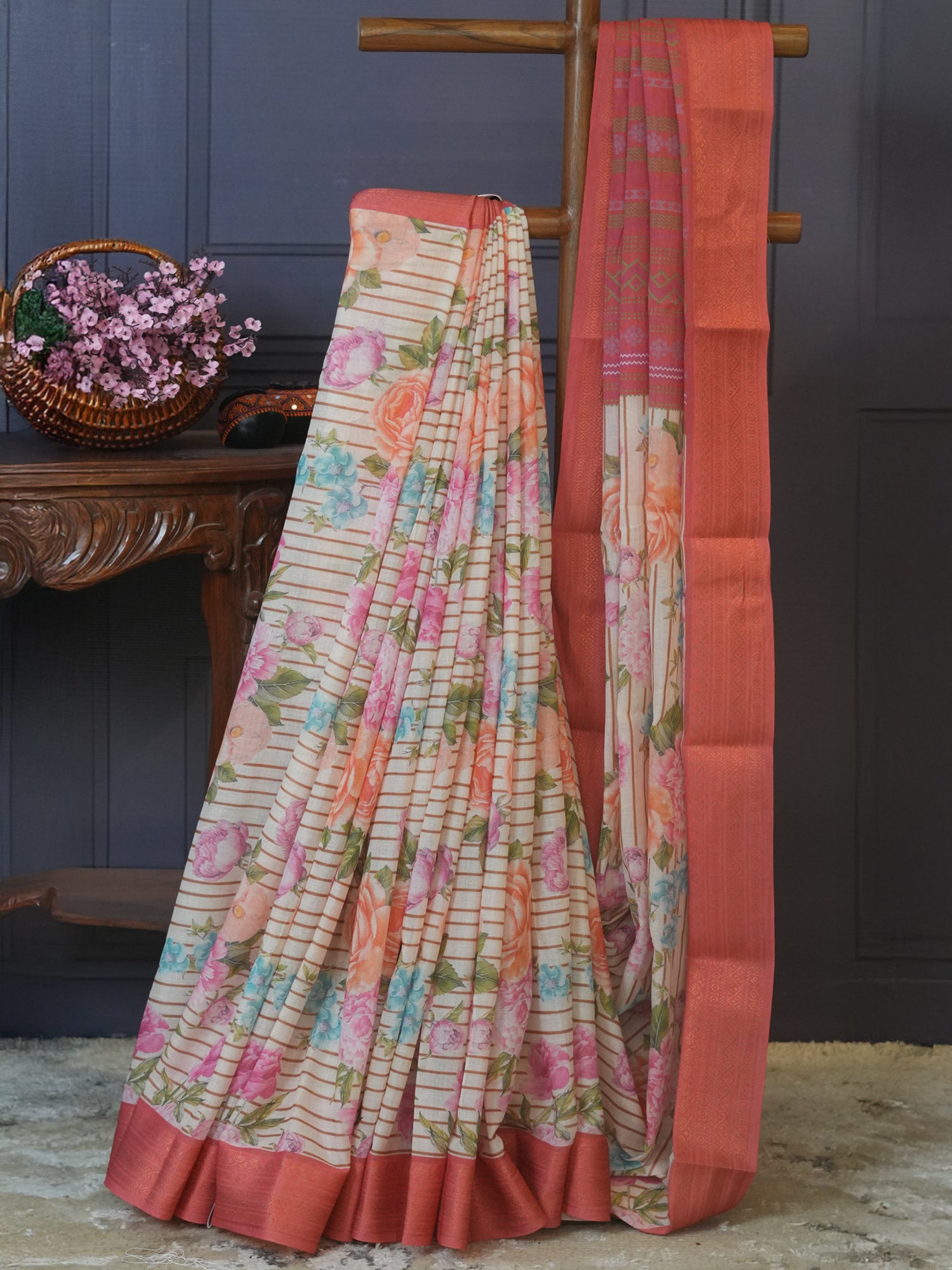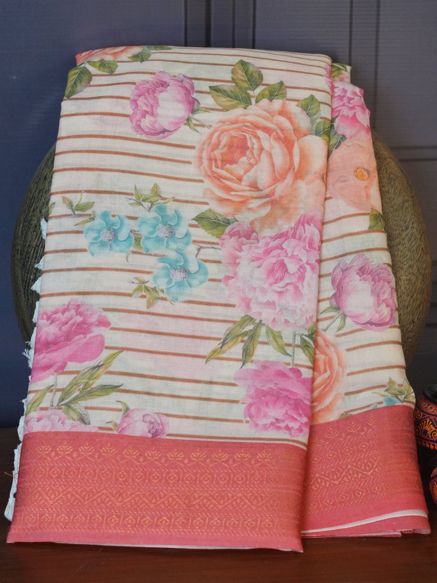 Mudra Cotton saree Floral Print with contrast Border - Cream & Pink