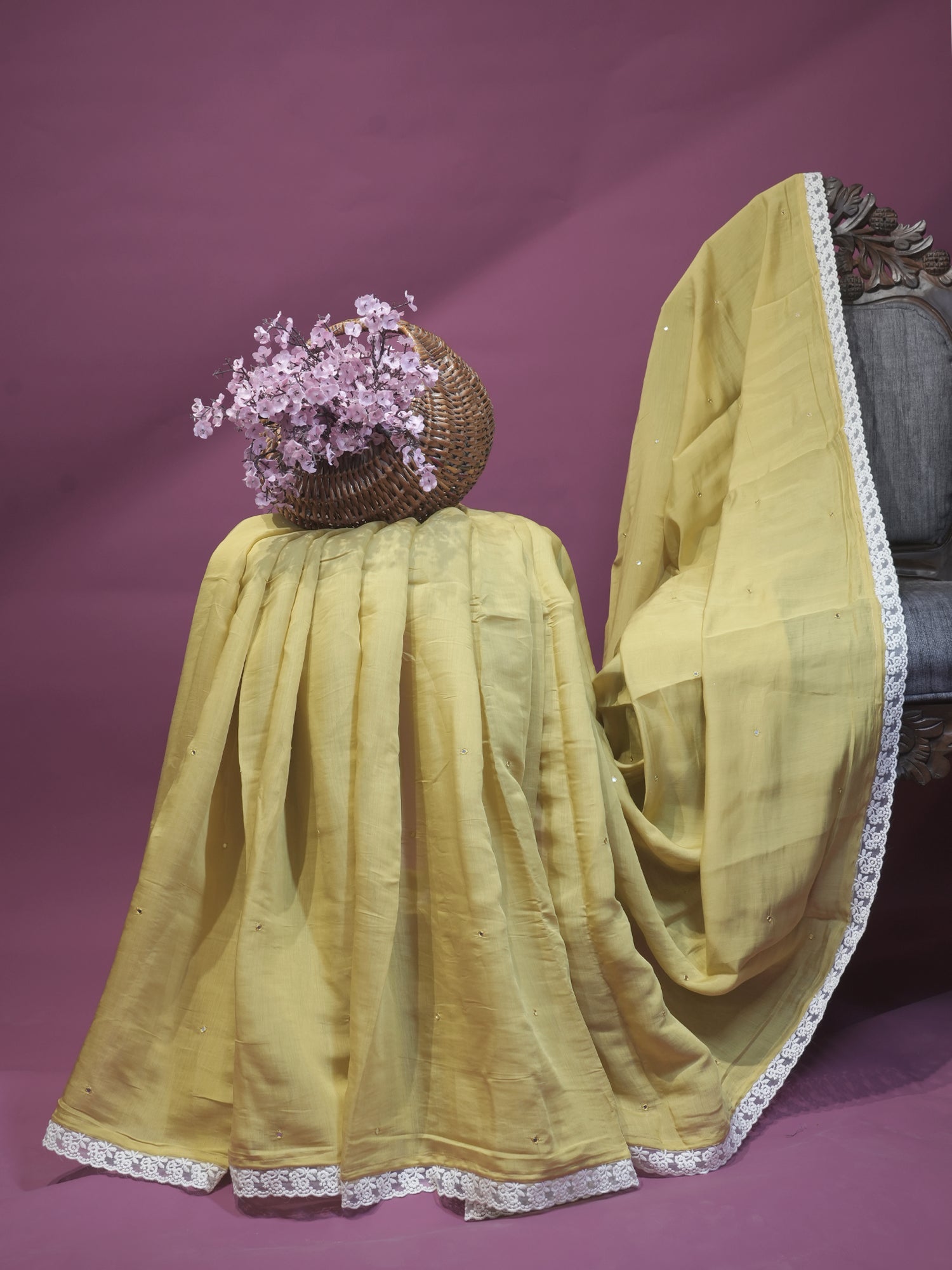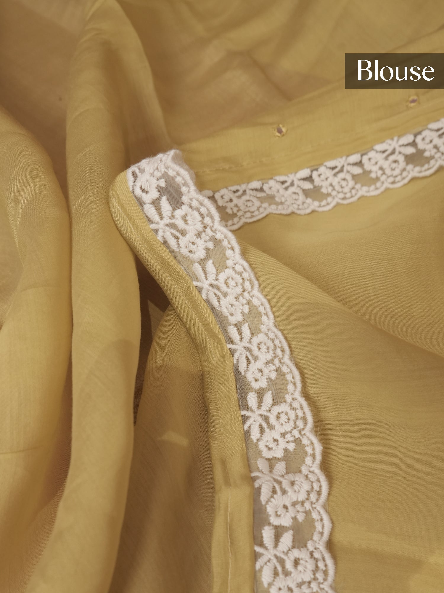Mul Chanderi saree with Mirror work and lace Border -Mehandi Yellow
