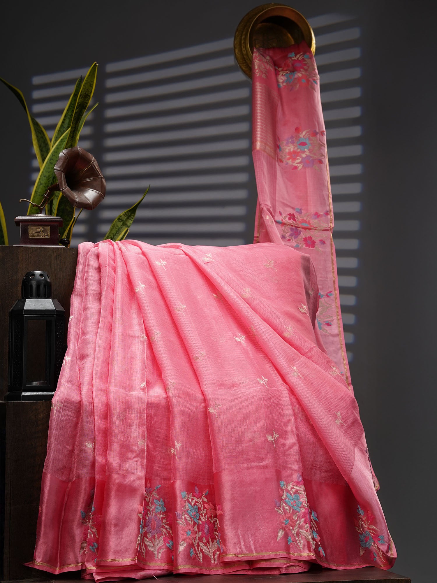 Drape yourself in pure elegance with this stunning Munga Kota silk saree that's practically a love letter to tradition. Adorned with shimmering silver butties that catch the light like tiny stars, paired with a luxurious satin border that frames your silhouette beautifully. The intricate meenakari work adds that perfect pop of artisanal charm, while the soft pink hue keeps things effortlessly graceful. Perfect for celebrations, weddings, or whenever you want to feel absolutely radiant. This isn't just a saree—it's a masterpiece you'll want to wear again and again.