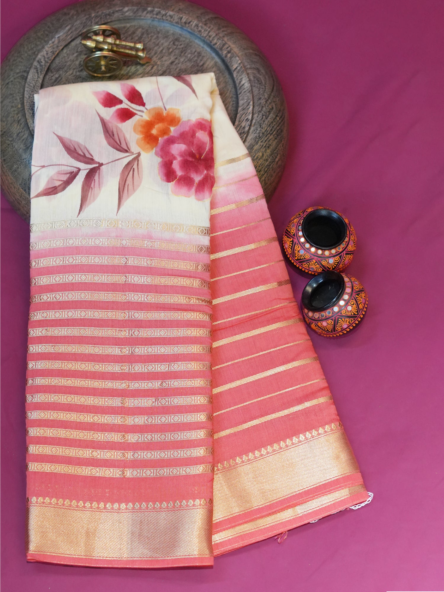 Munga silk Saree with Centre print horizontal Zari lines - orange