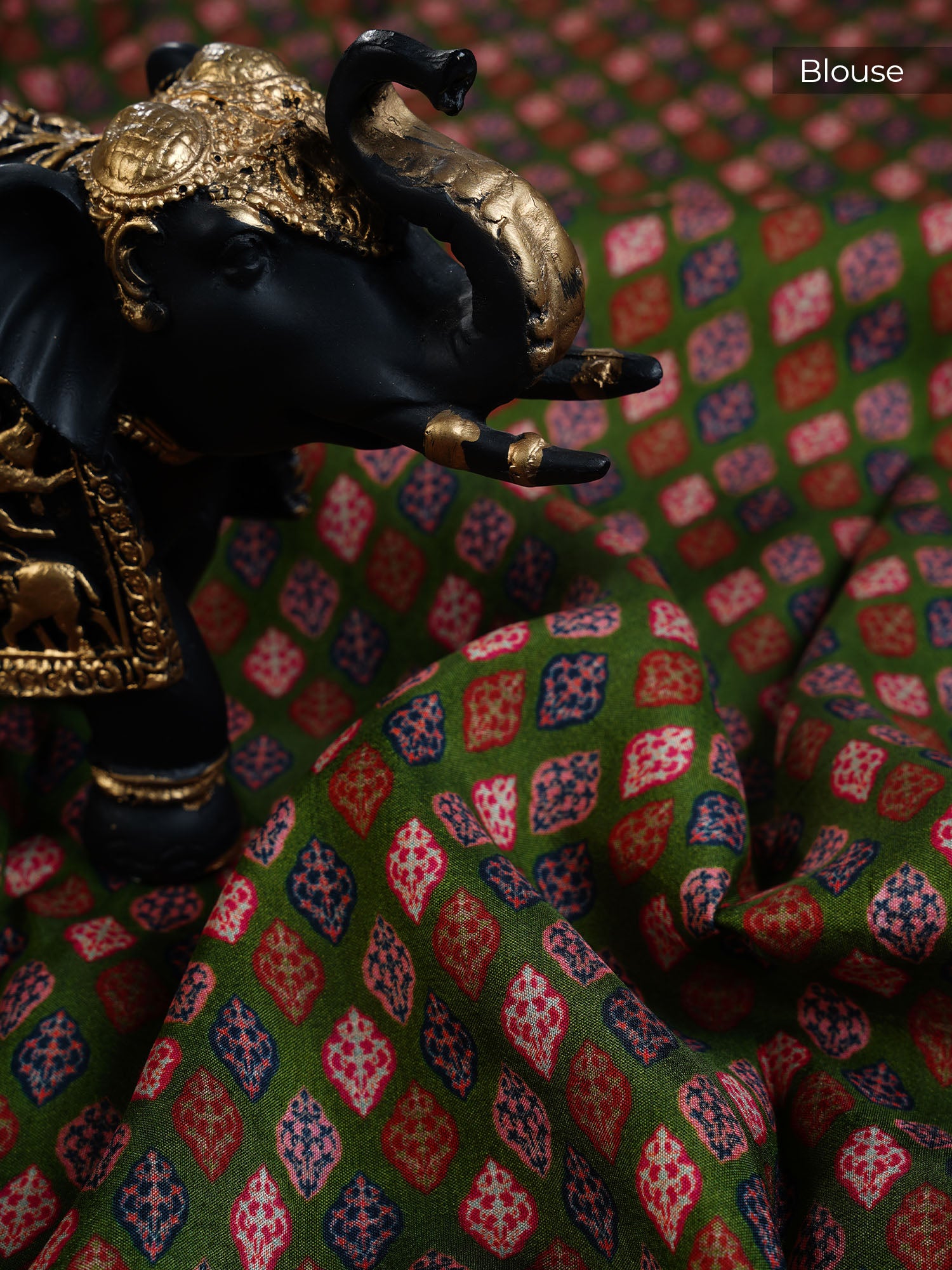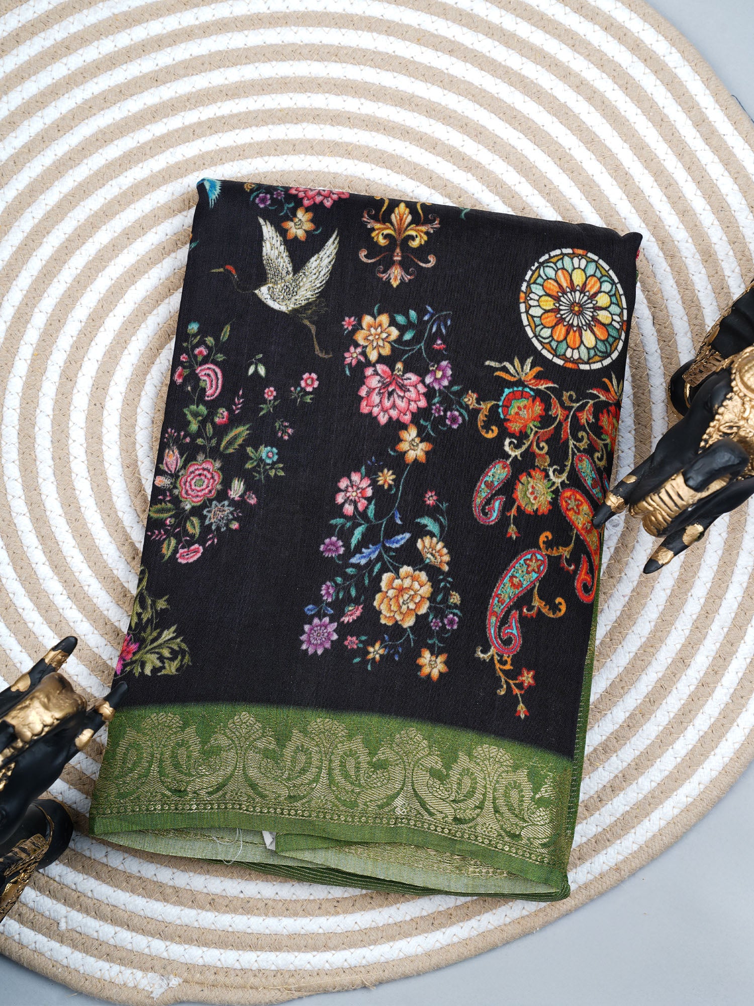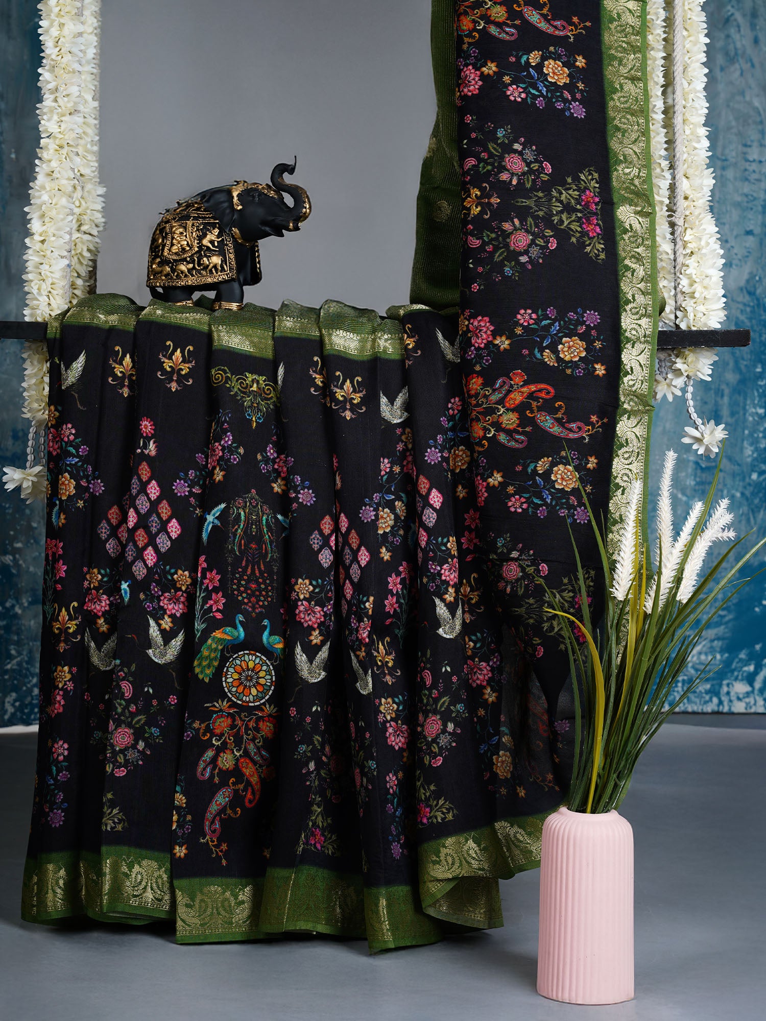 Munga Silk Saree With Digital print and contrast border - Black & B Green