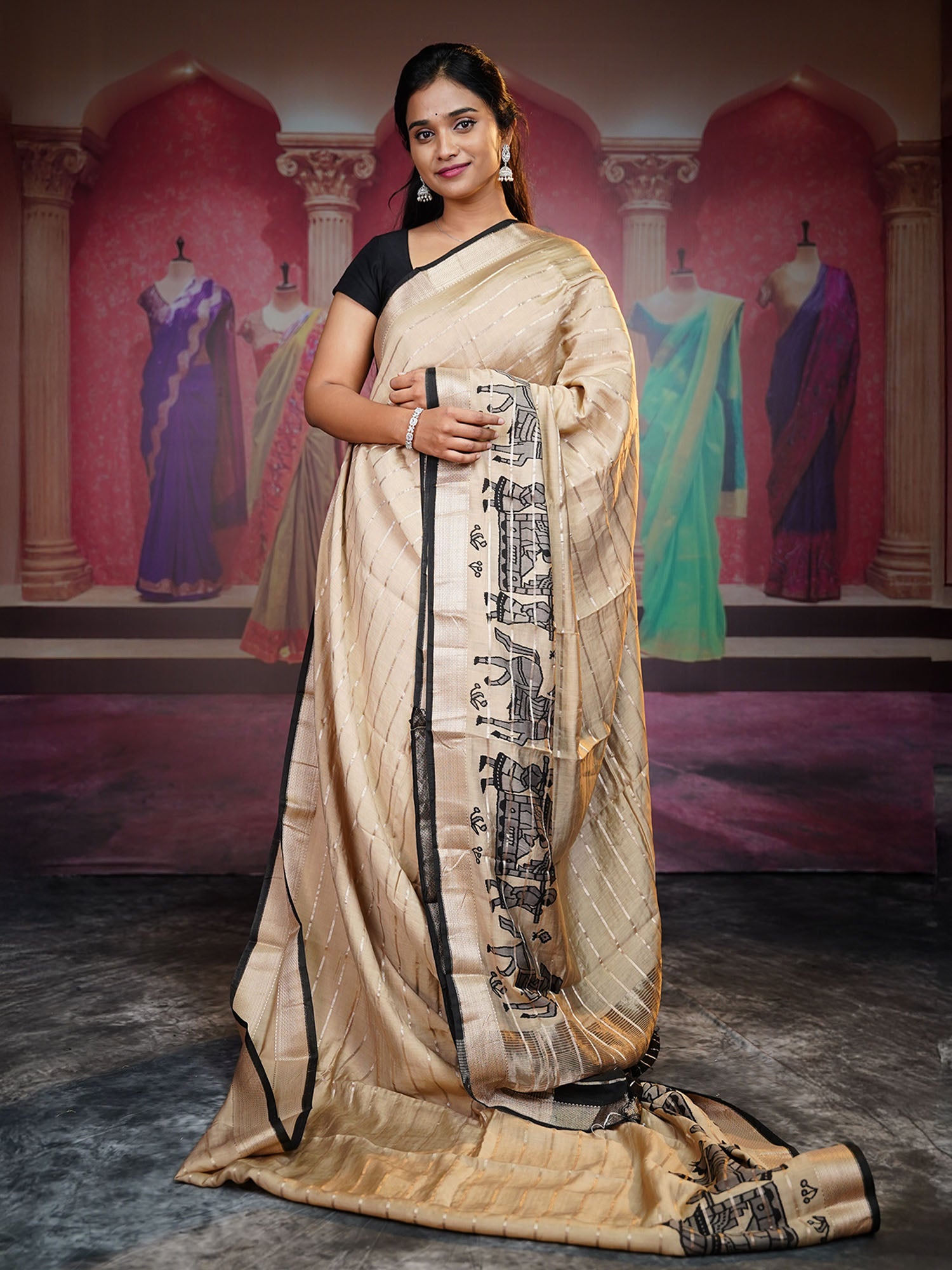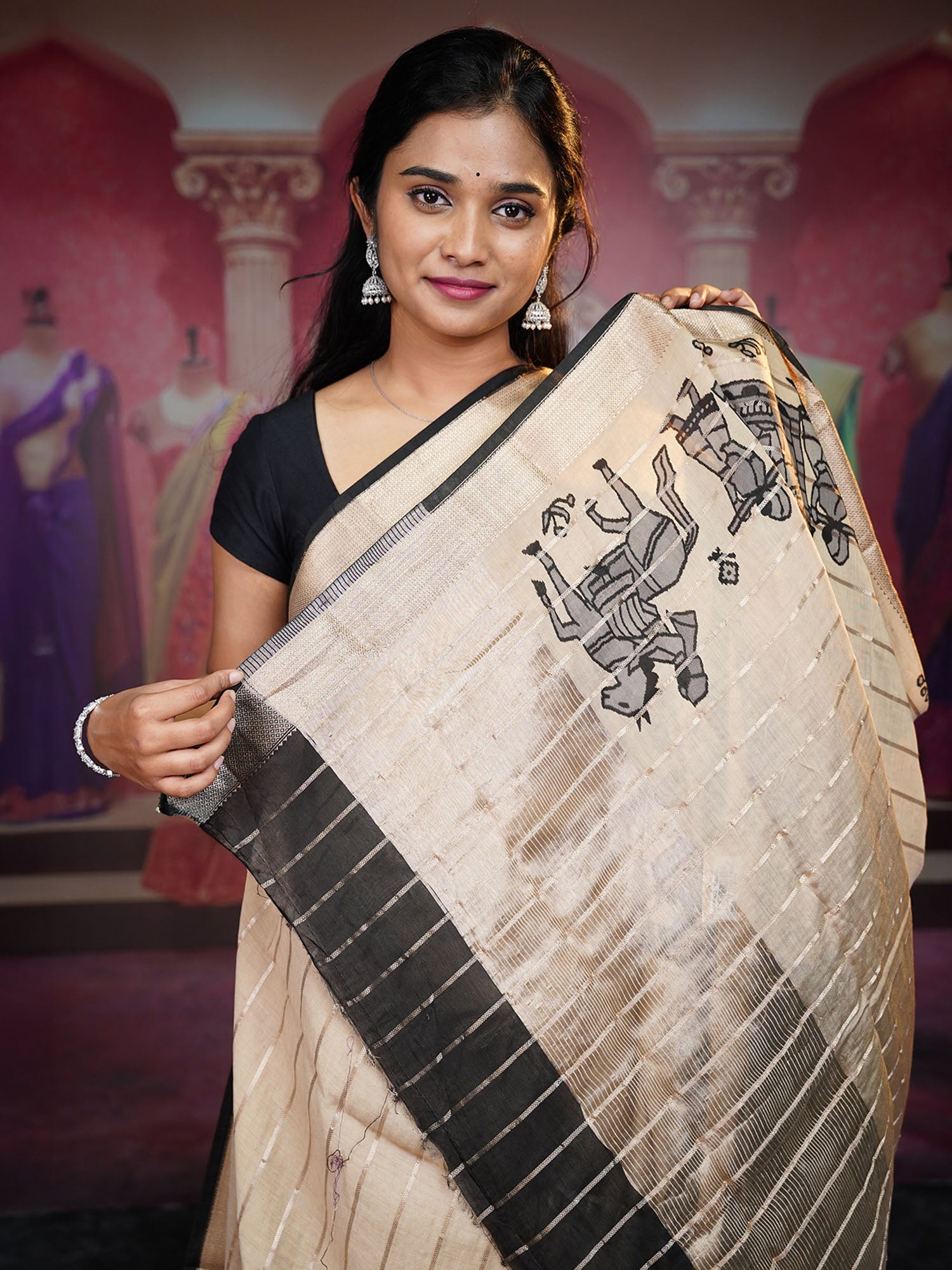Munga Silk Saree With Digital Print Golden Zari Border - Beige