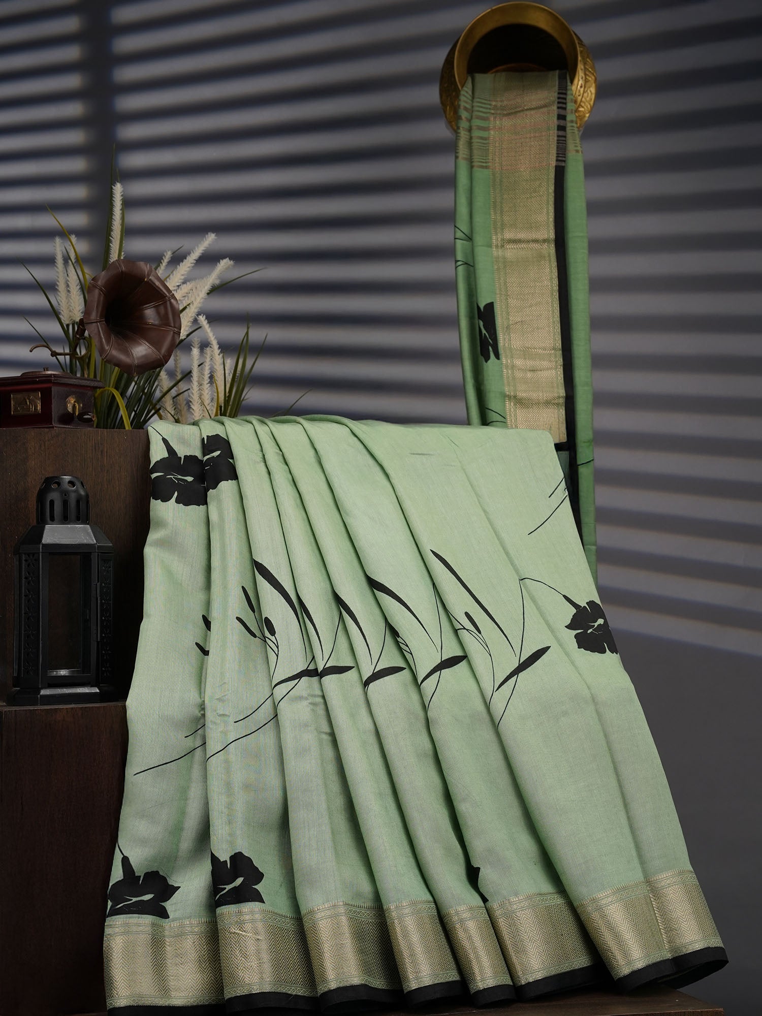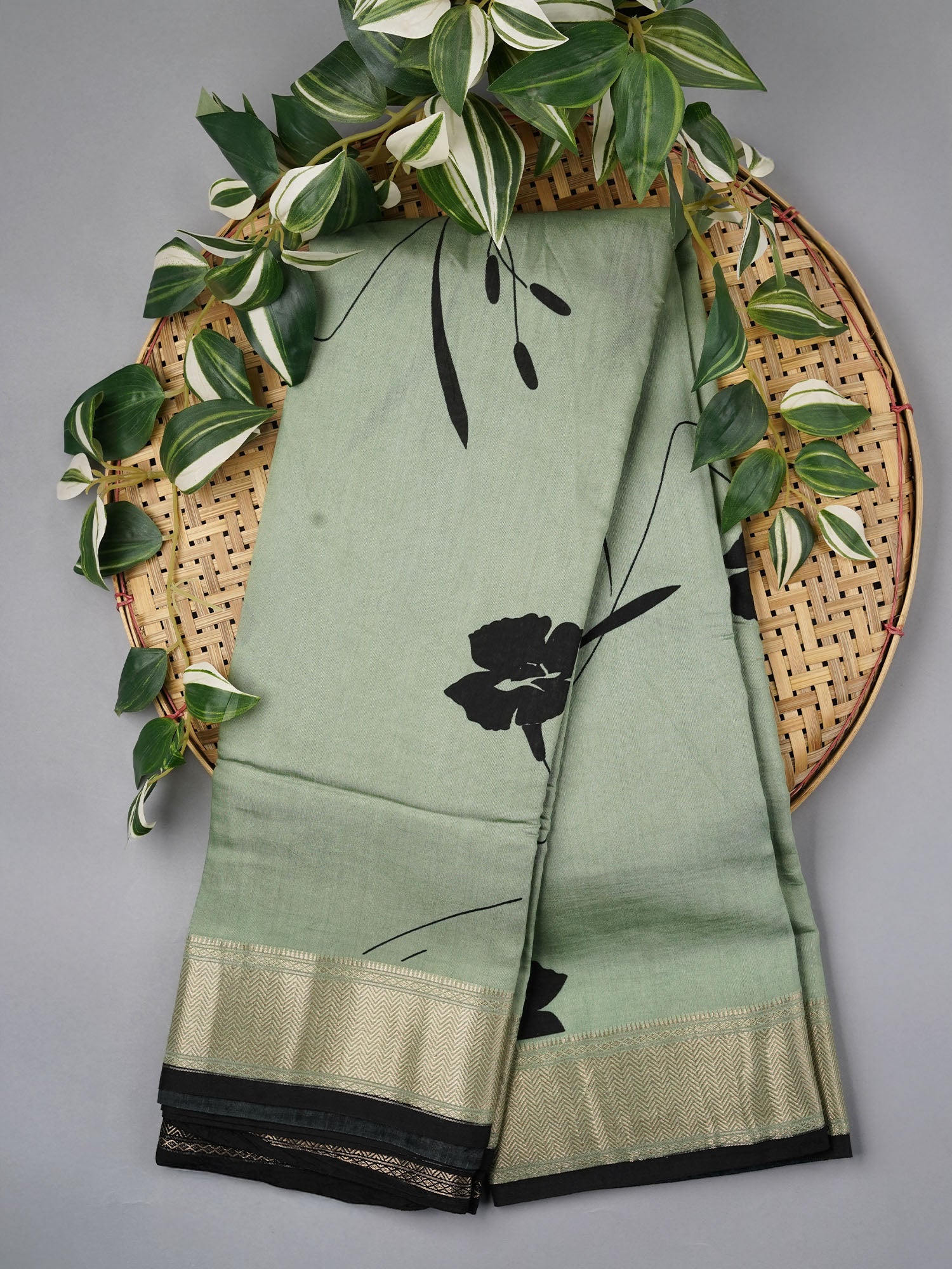Muslin Silk Digital Print With Gold Zari Border - Sage Green