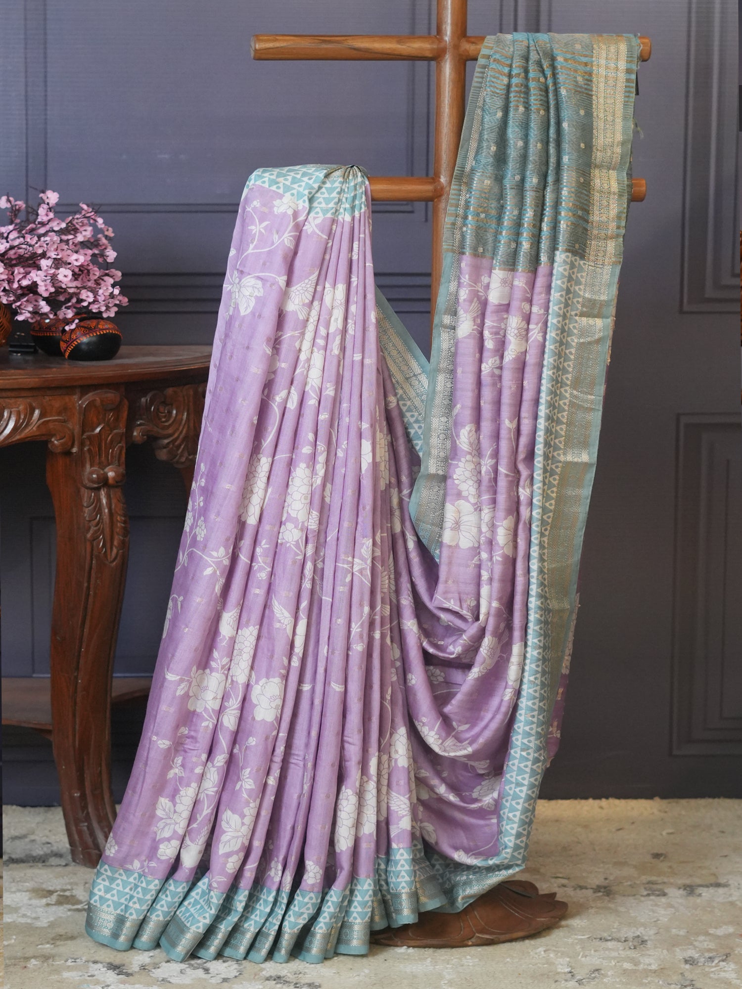 Muslin Silk Floral Print Golden Buttis With Contrast Border - Lavender