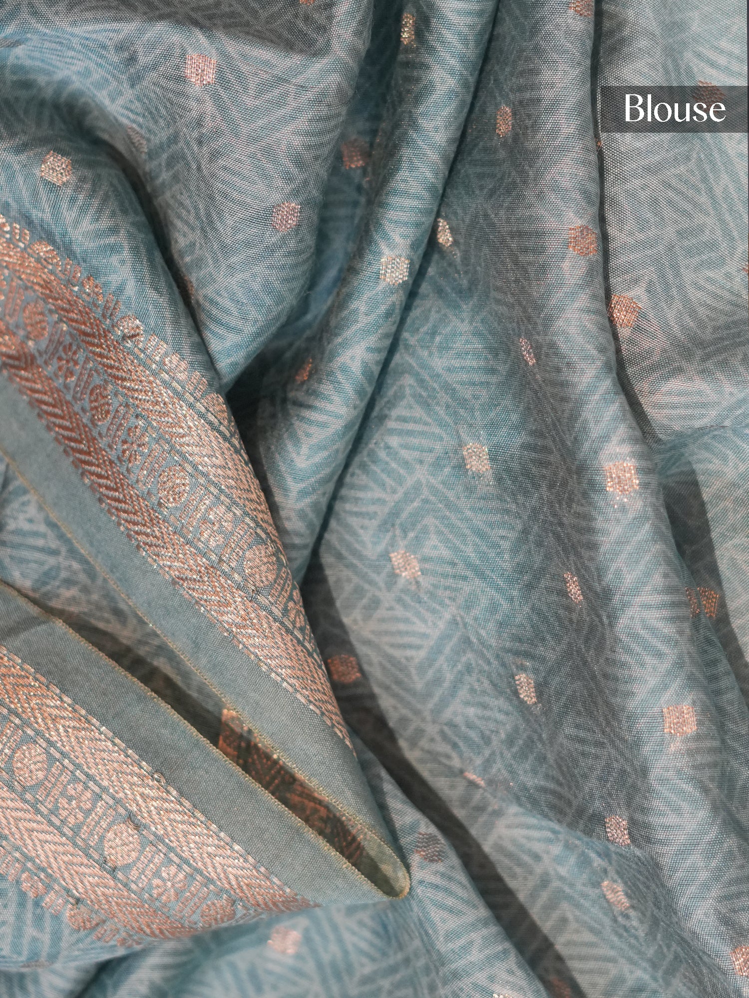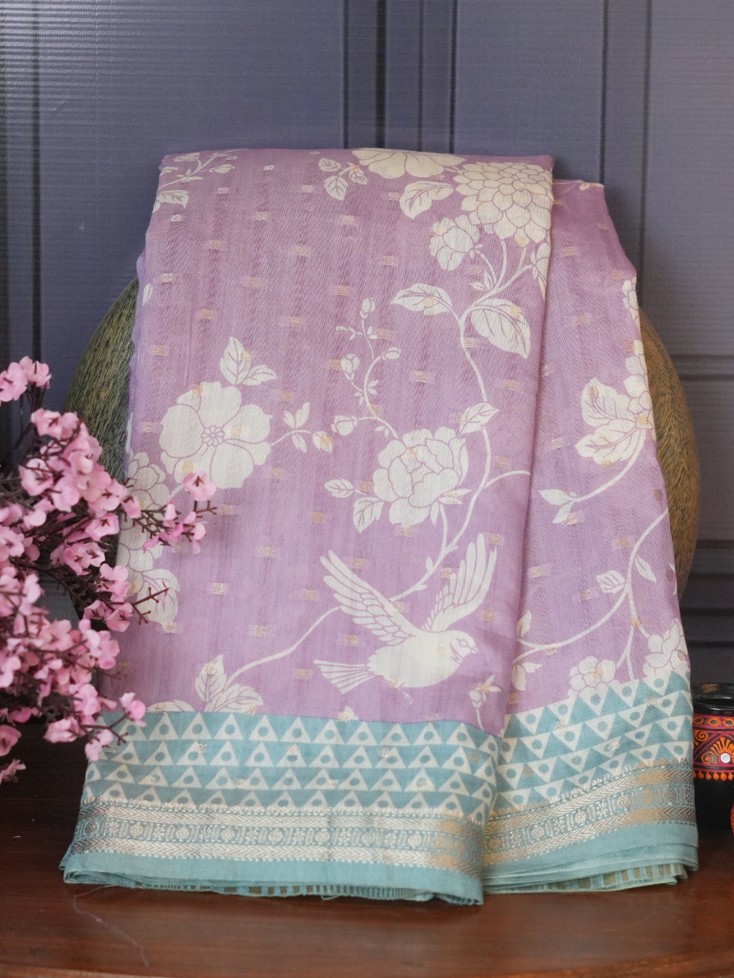 Drape yourself in dreamy lavender elegance! This stunning muslin silk saree features delicate floral prints adorned with shimmering golden buttis...
