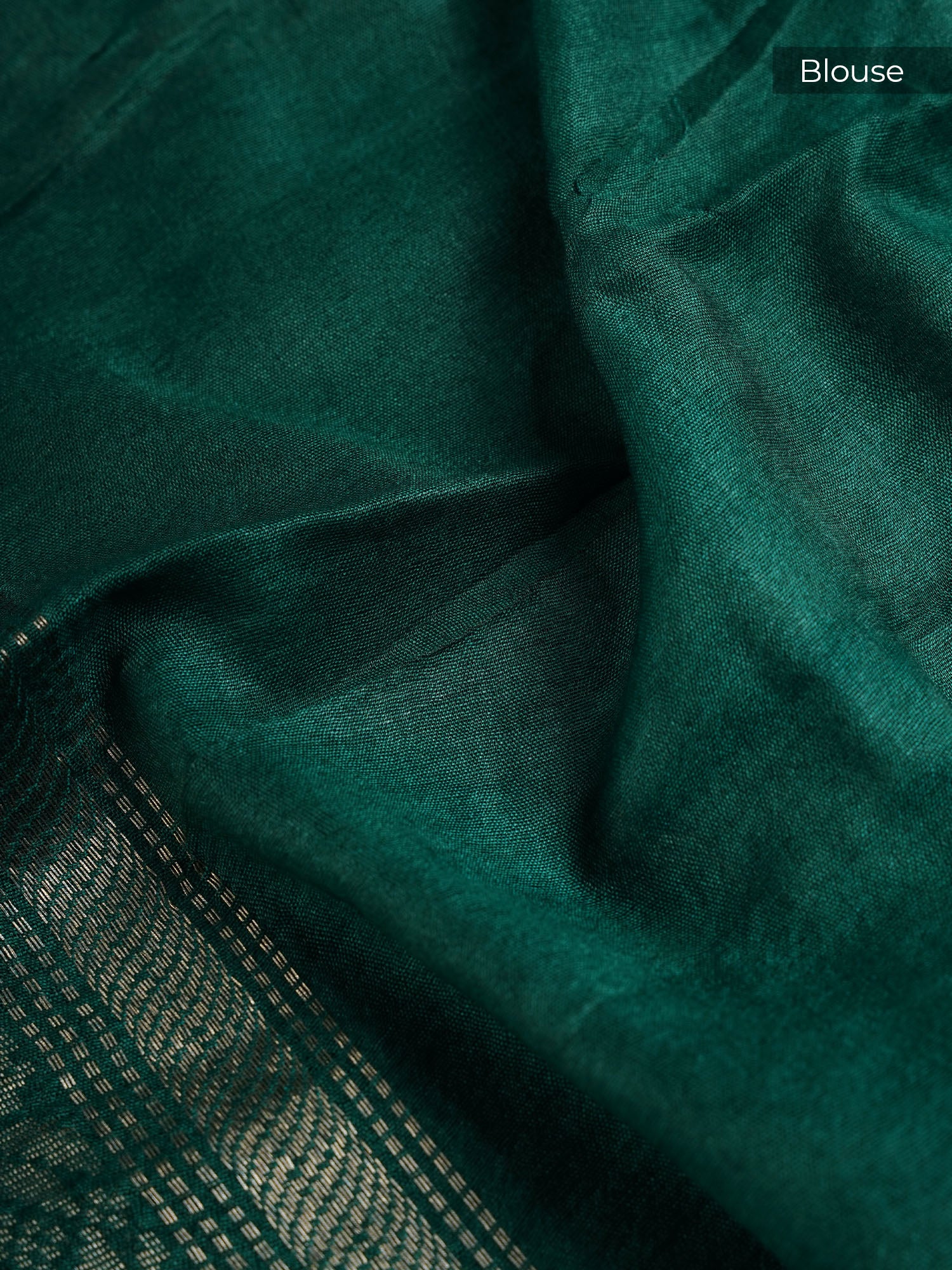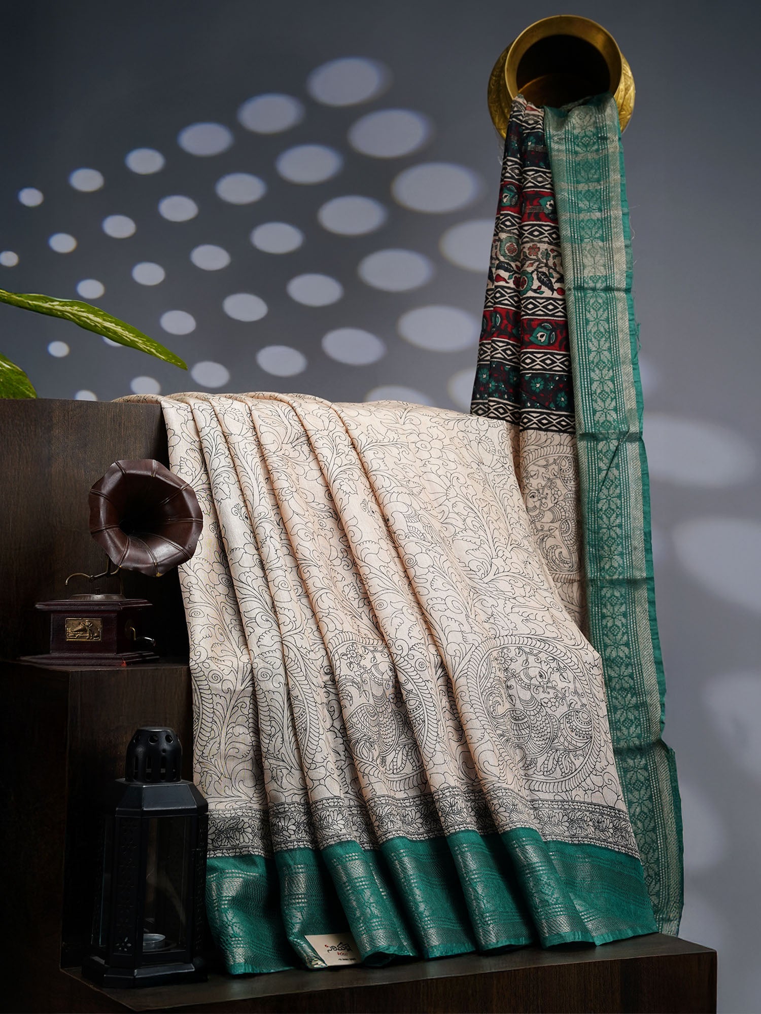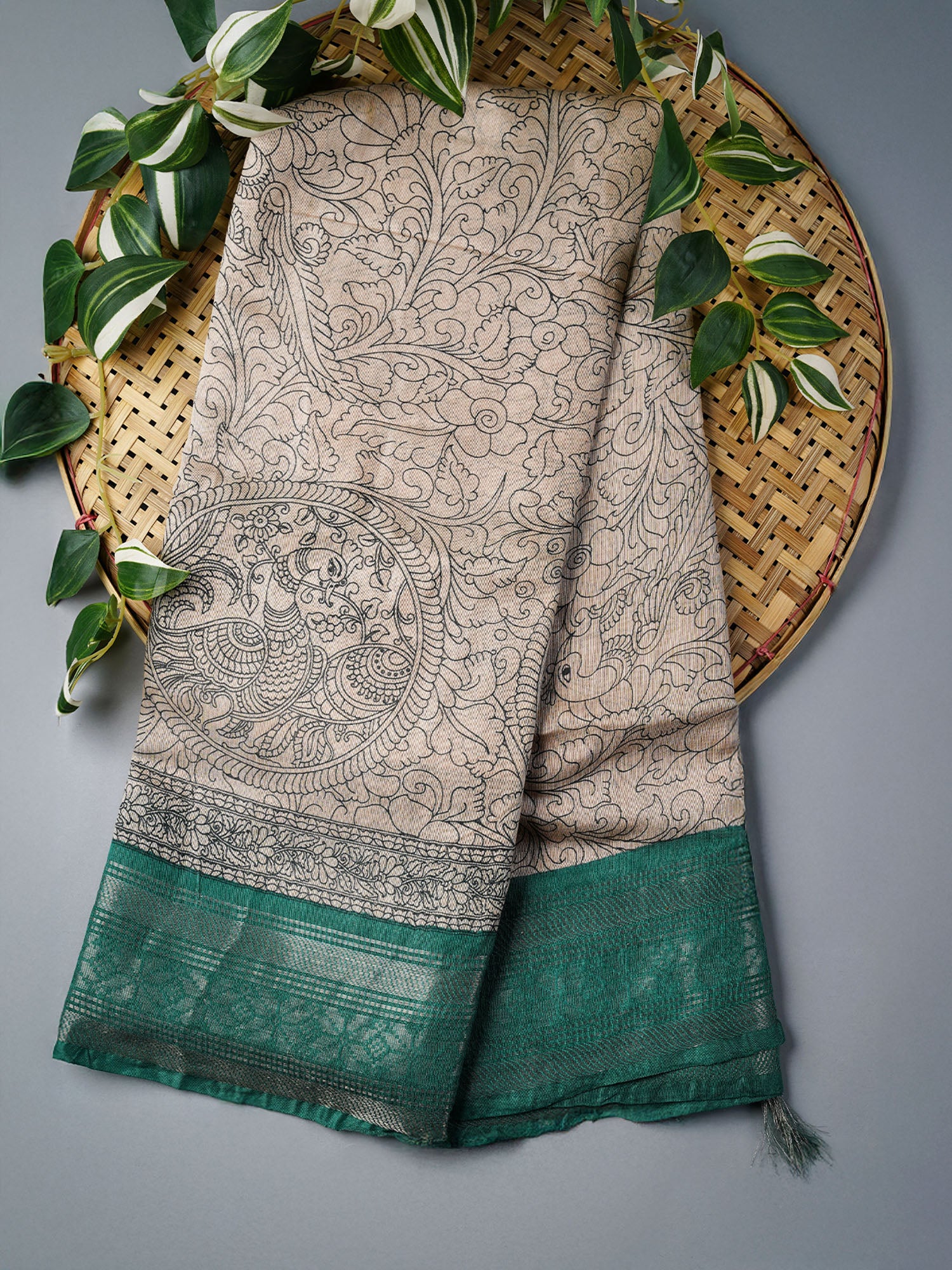 Muslin Silk Saree With Digital Print & Contrast Border - Beige With Green