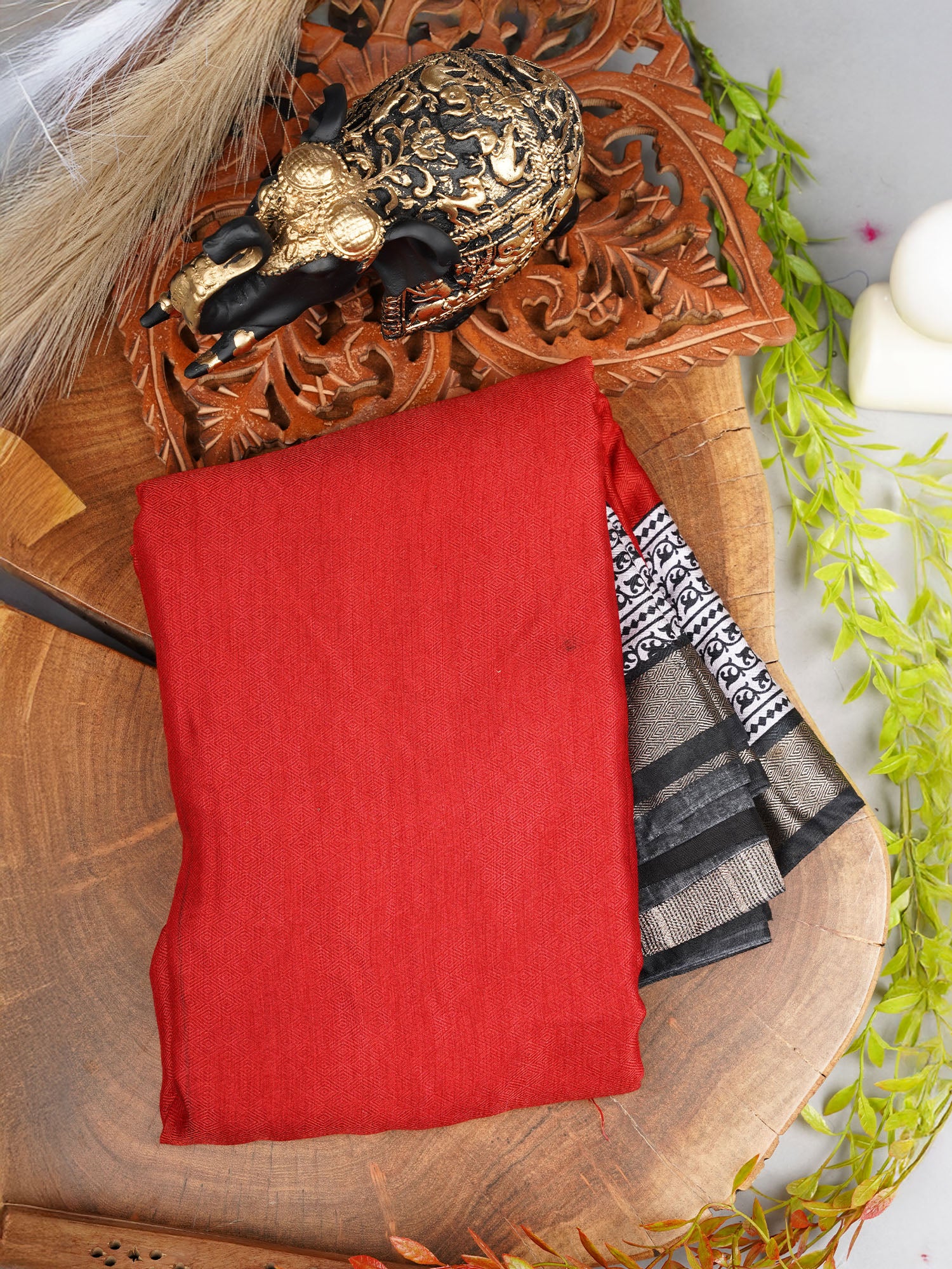 Muslin Silk Saree With Golden Zari Border With Blac & White Block Printed Pallu - Maroon