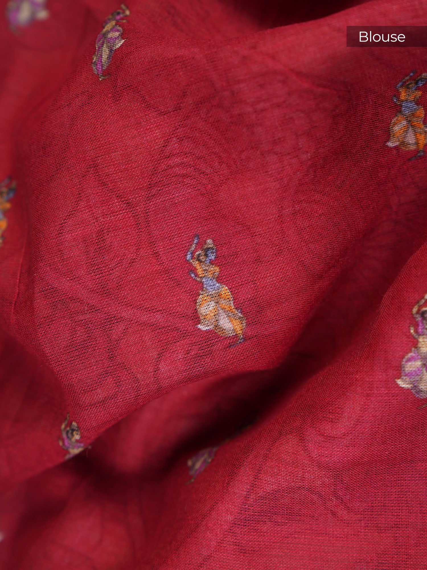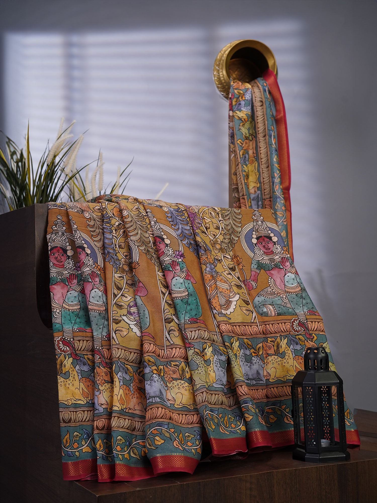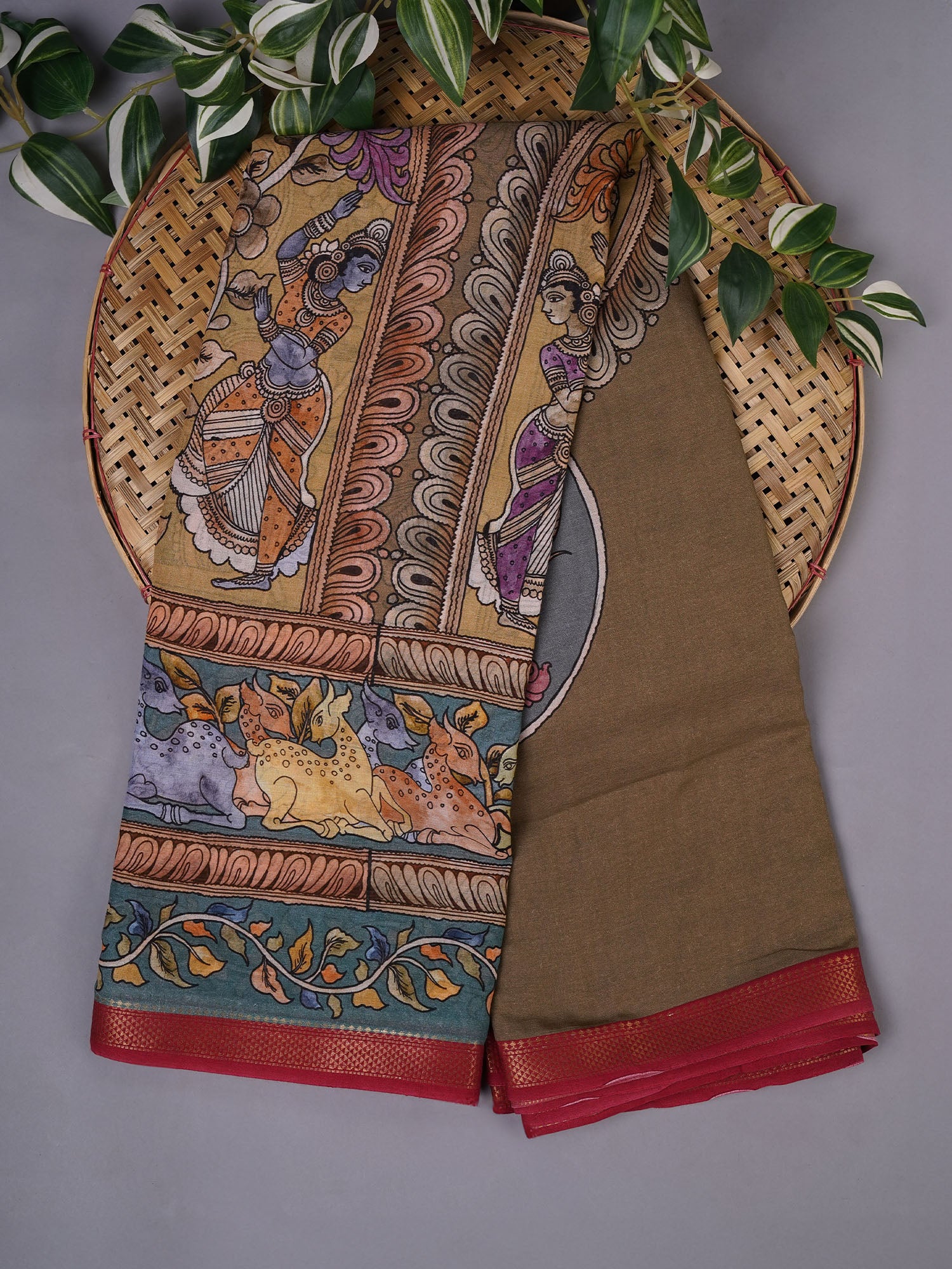 Muslin Silk with Kalamkari Print Contrast Border - Mehndi