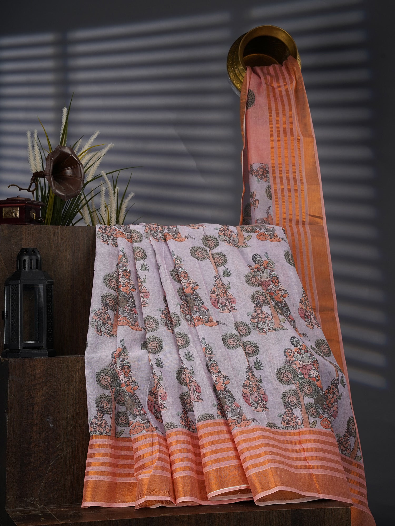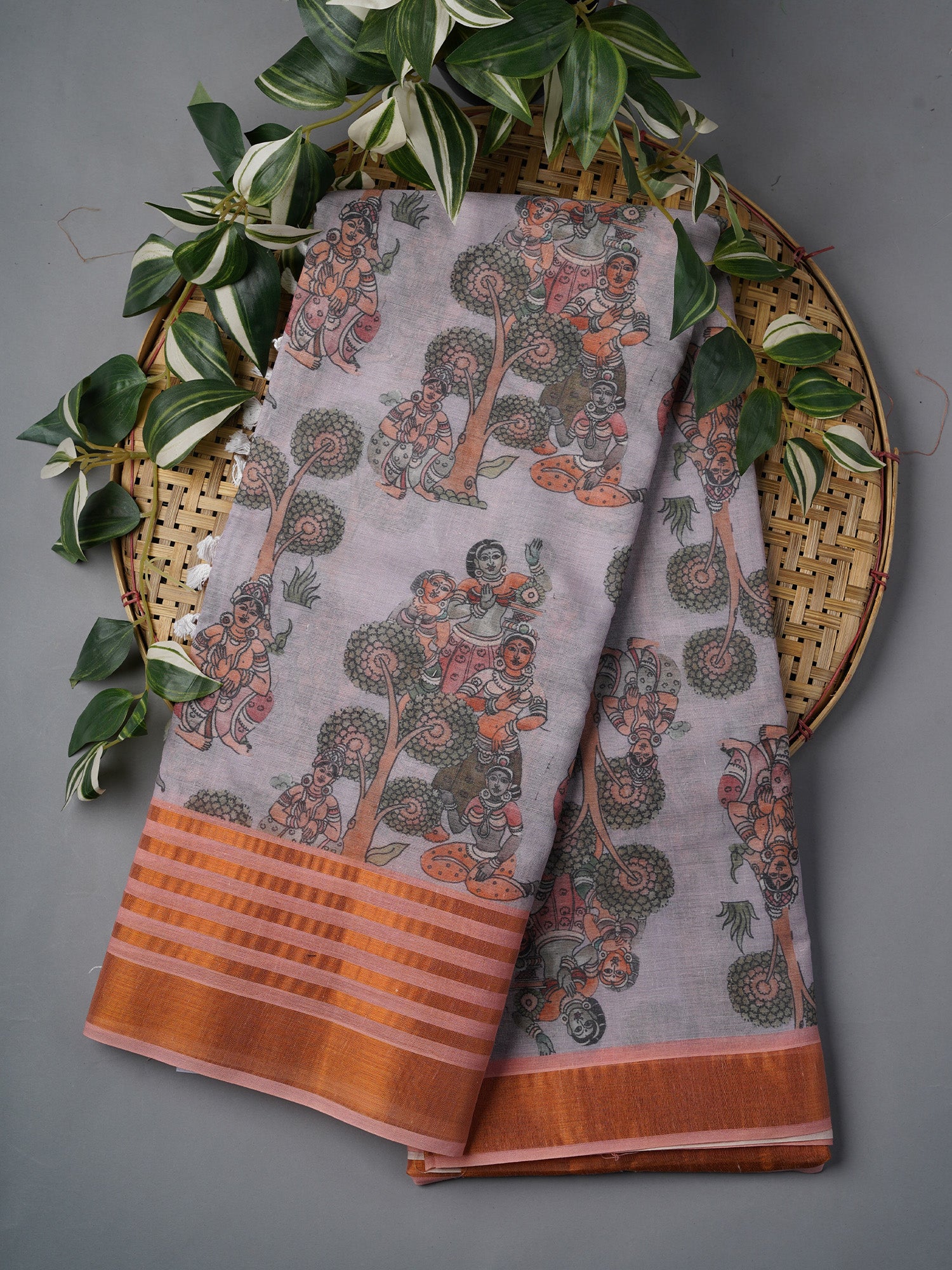 Drape yourself in timeless elegance with this stunning muslin silk saree, where traditional craftsmanship meets contemporary style. The intricate kalamkari print showcases hand-painted artistry, while the contrasting border adds a bold pop of personality to your ensemble. Perfect for festive occasions or everyday sophistication, this light grey beauty effortlessly transitions from celebrations to casual gatherings. The luxurious muslin-silk blend offers a feather-light drape that moves with grace, making you feel as fabulous as you look. Embrace the art, embrace the charm!