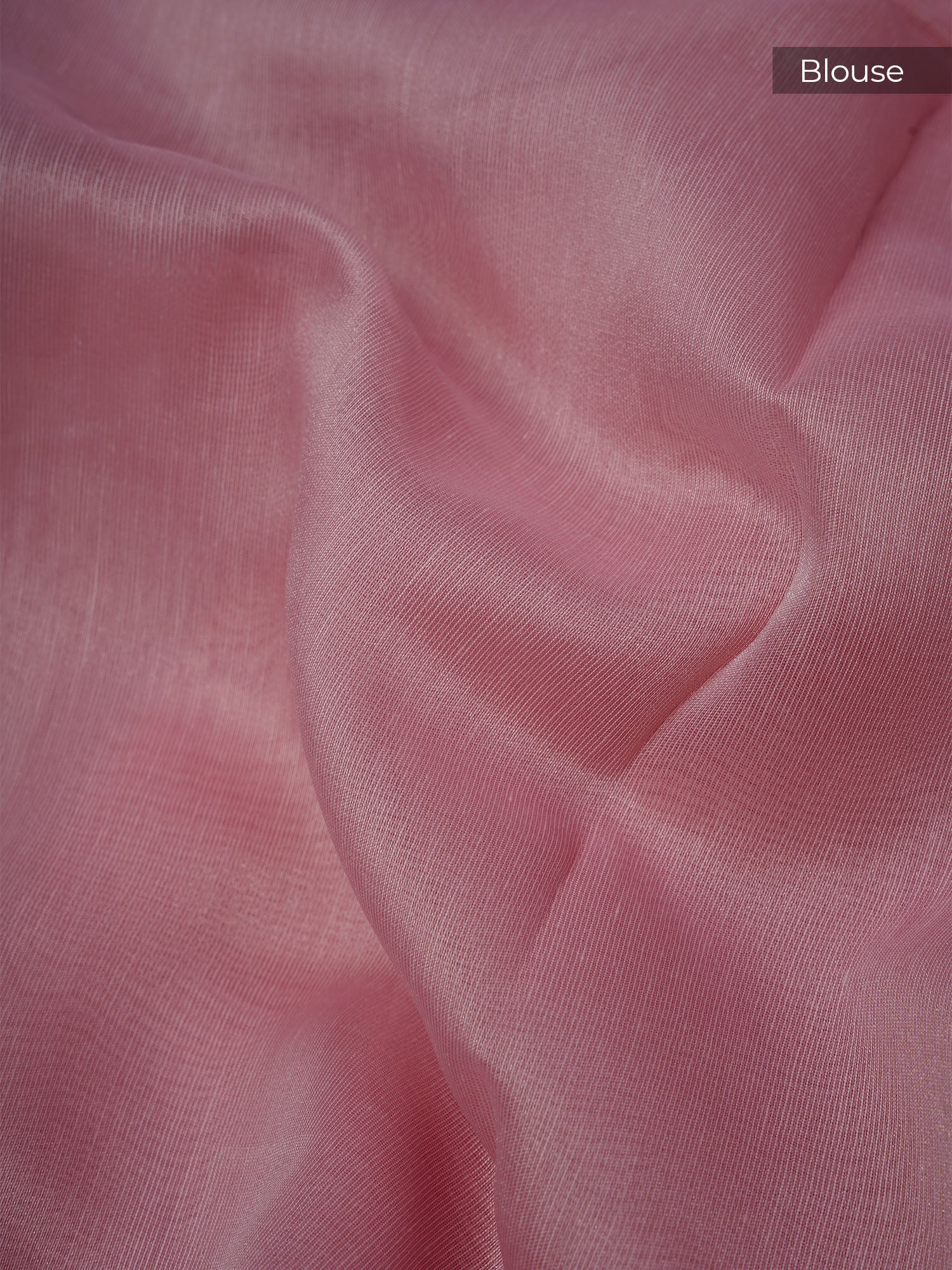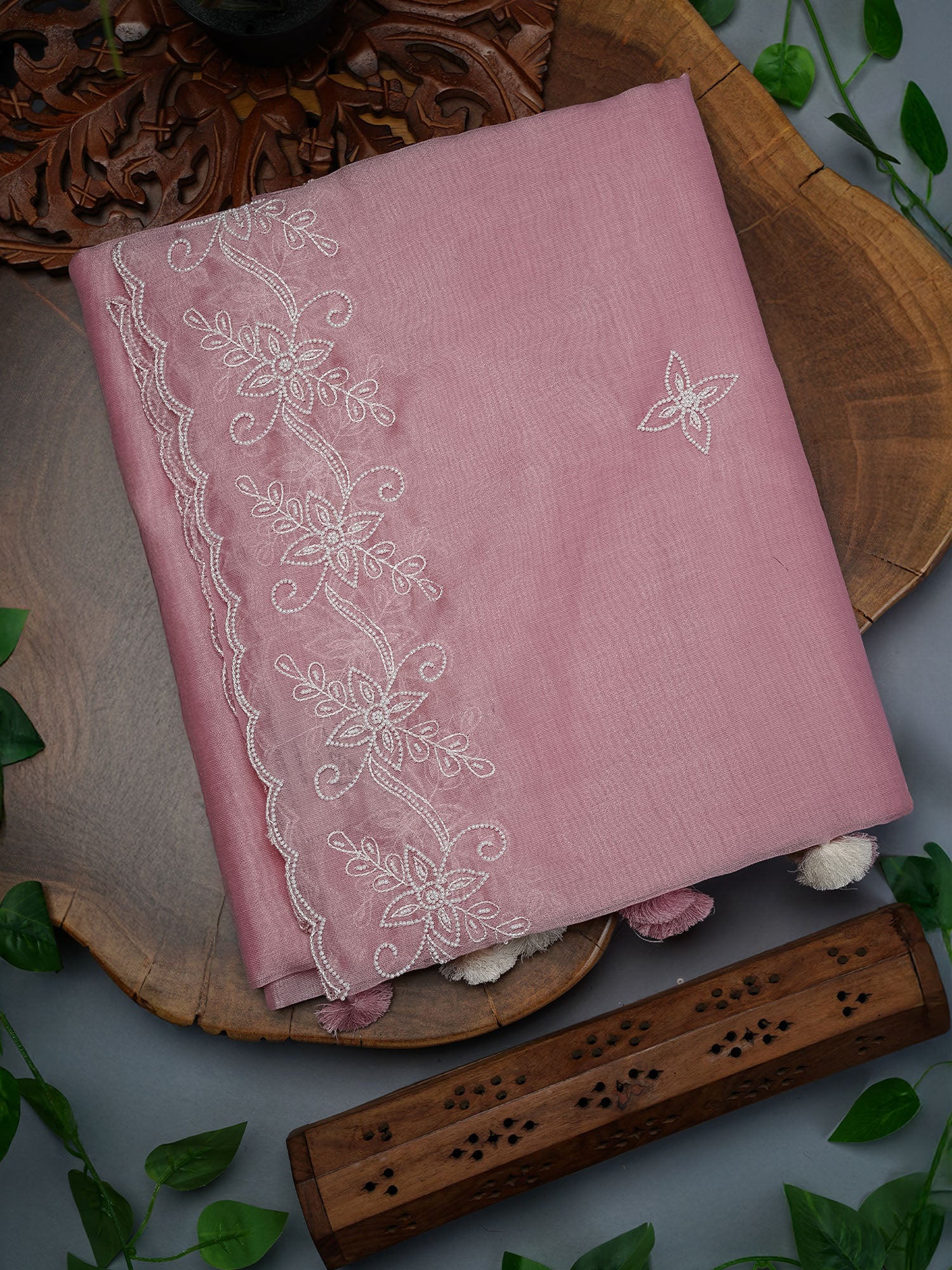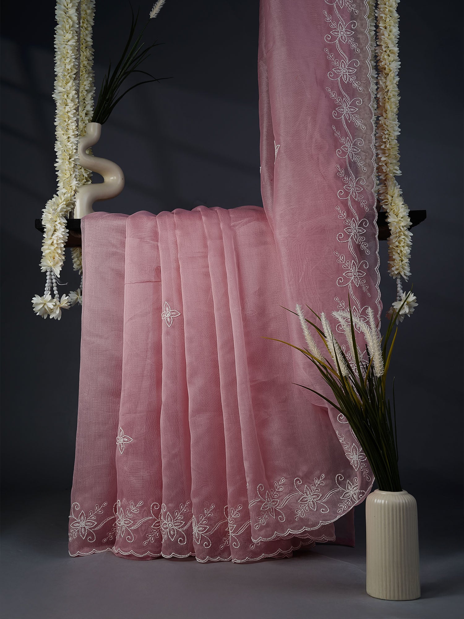 Twirl into elegance with this stunning pink organza saree, where delicate embroidered butties dance across the fabric and a richly...