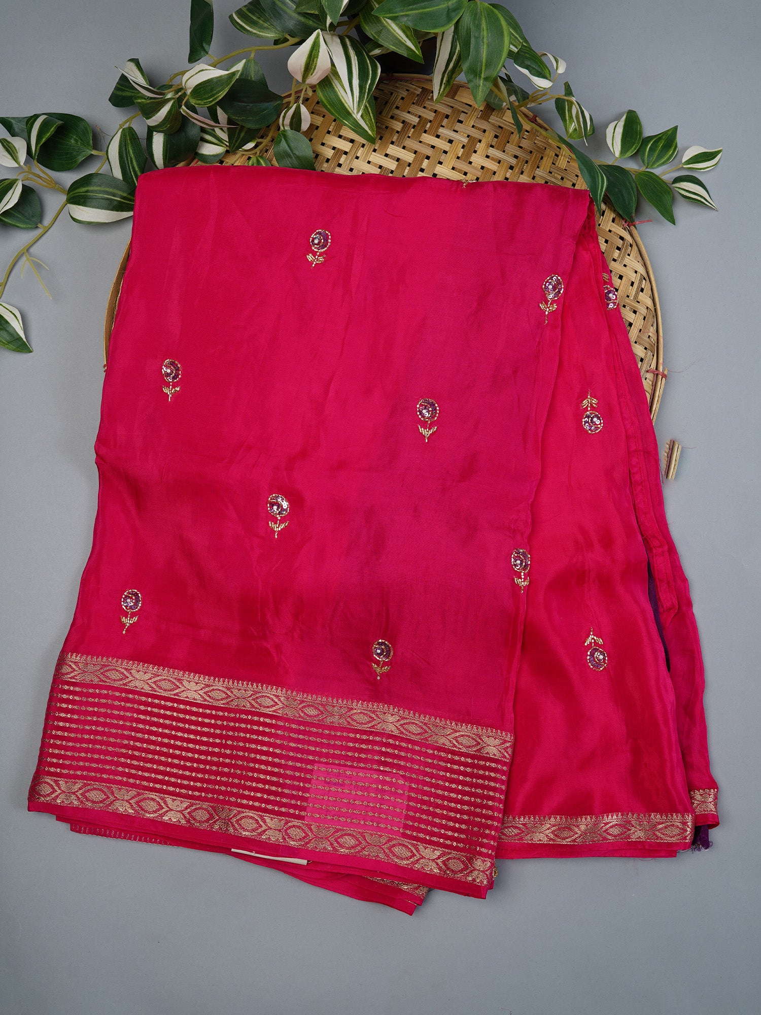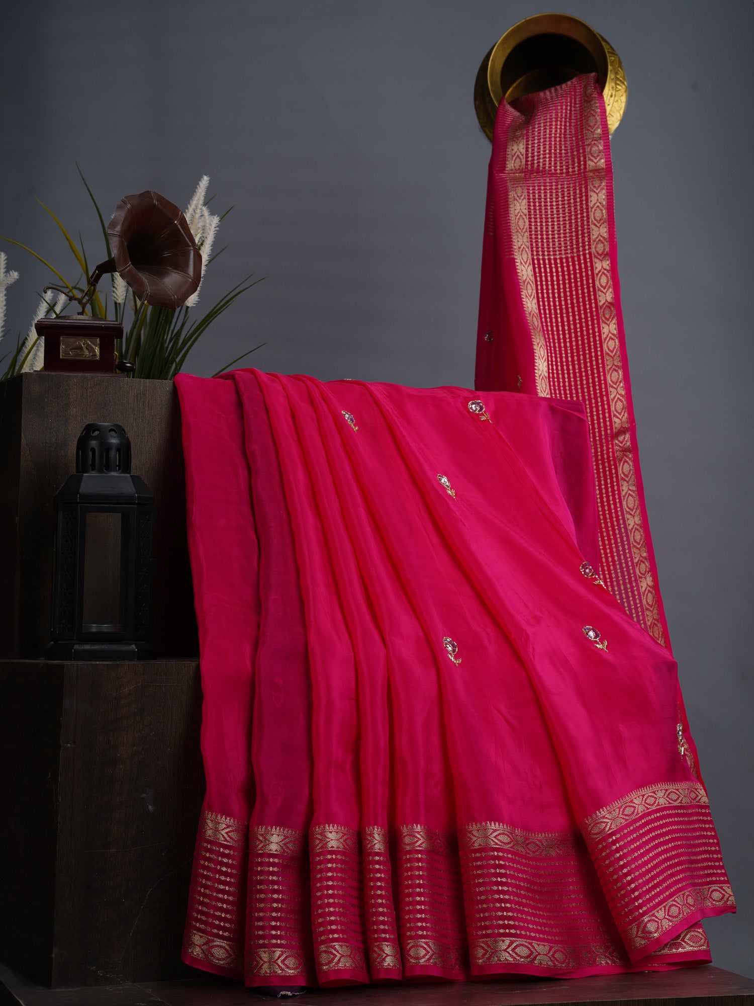 Step into elegance with these stunning Russian Crape Khardhana Antique Buttis , where timeless tradition meets contemporary flair. Crafted in luxurious rani pink, these beauties feature an ornate Banaras border that adds a touch of vintage glamour to your wardrobe. The soft crape fabric drapes beautifully, offering comfort without compromising on style. Perfect for festive occasions, weddings, or whenever you want to make a statement, these booties blend classic Indian craftsmanship with a playful modern twist. Elevate your ethnic collection with this show-stopping piece that celebrates heritage with a wink.