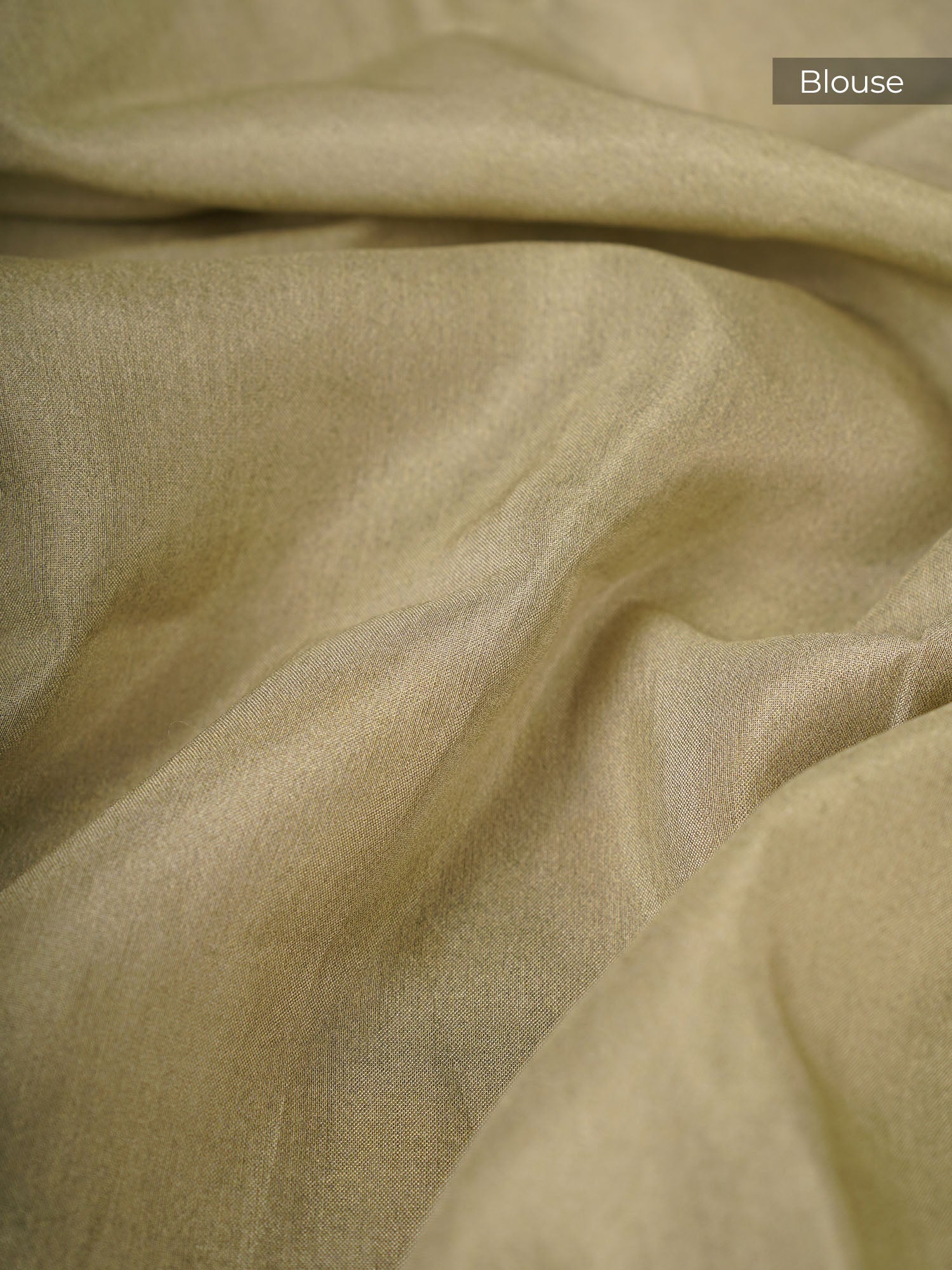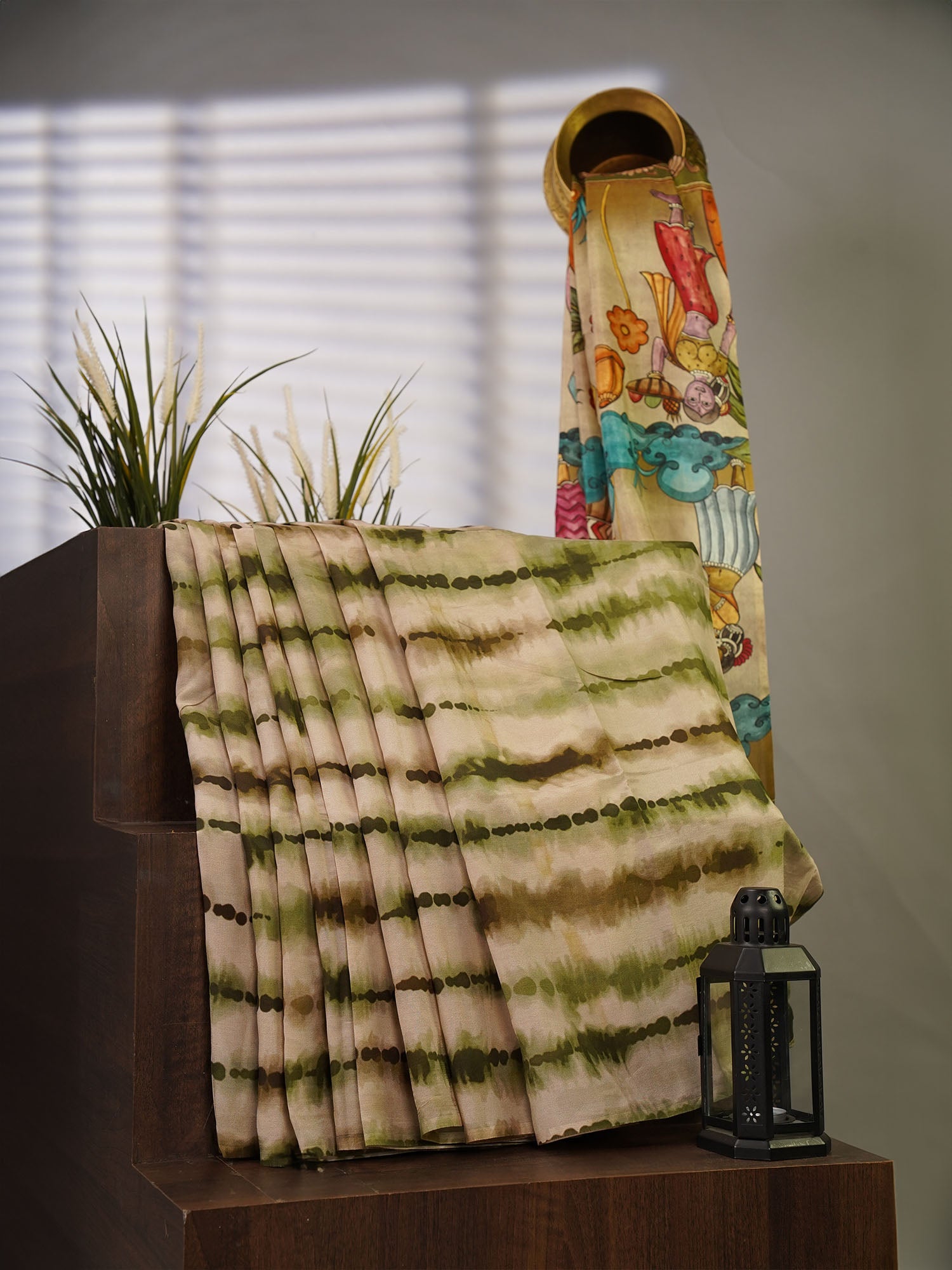 Experience the elegance of the Russian Crape Shibori Print Kalamkari Pallu in a refined blend of cream and green. Crafted...