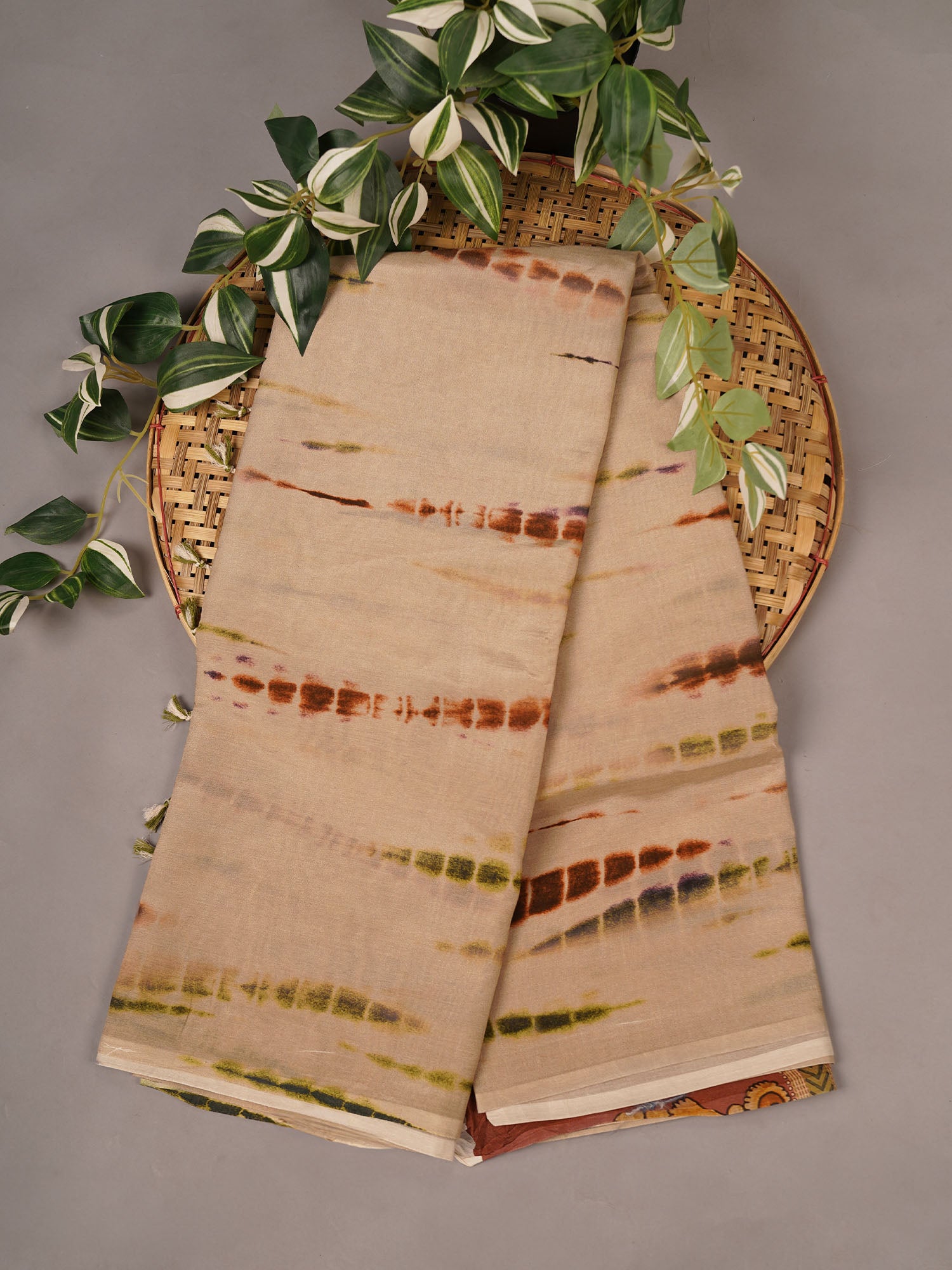 Experience the elegance of the Russian Crape Shibori Print Kalamkari Pallu in a refined cream and brown palette. This exquisite saree combines the delicate texture of Russian crepe with intricate Kalamkari artistry, showcasing traditional craftsmanship through expert Shibori techniques. Its lightweight drape and sophisticated color contrast make it an ideal choice for formal occasions, offering both comfort and timeless style. Elevate your ethnic wardrobe with this unique blend of heritage and contemporary design.