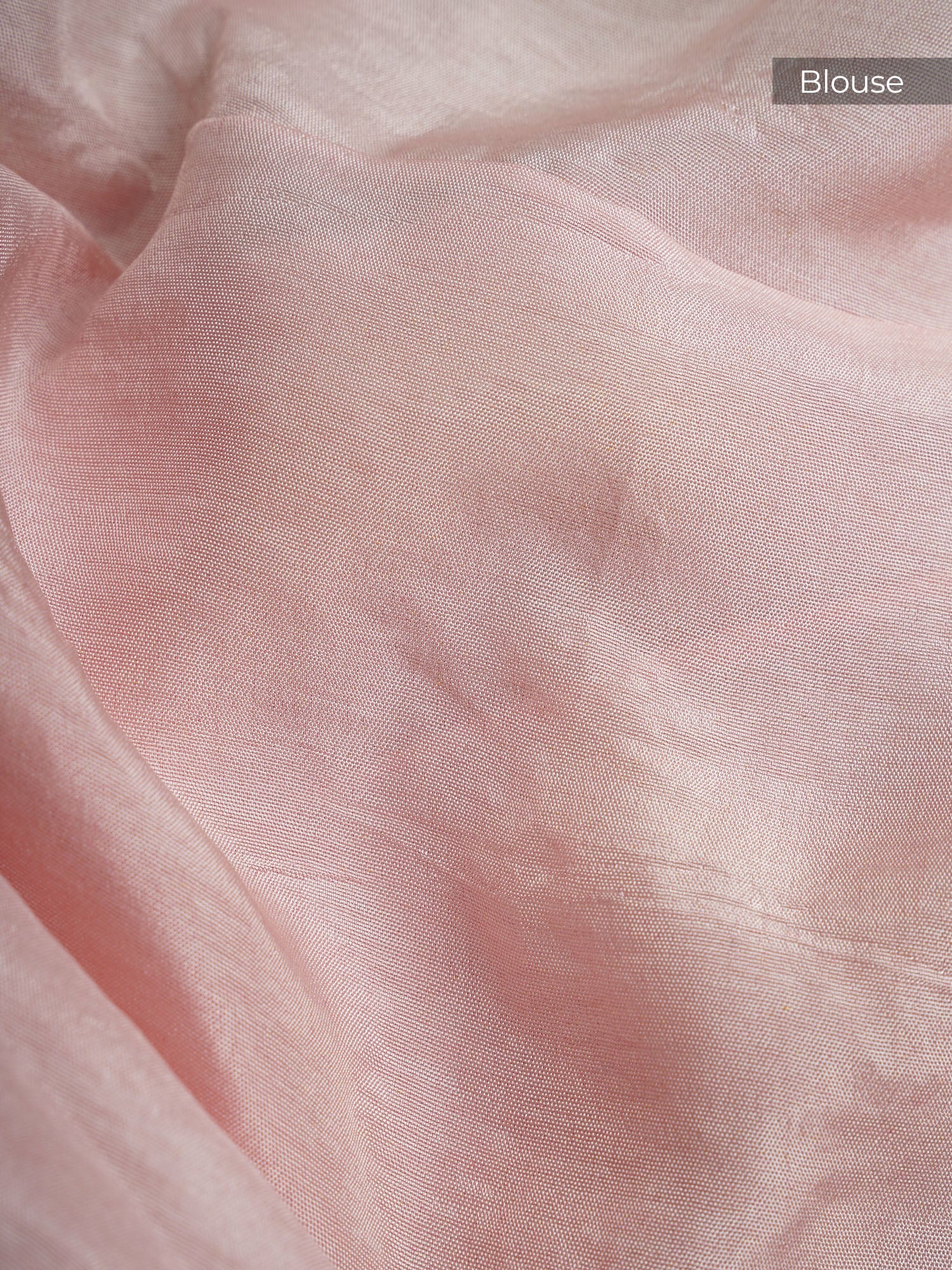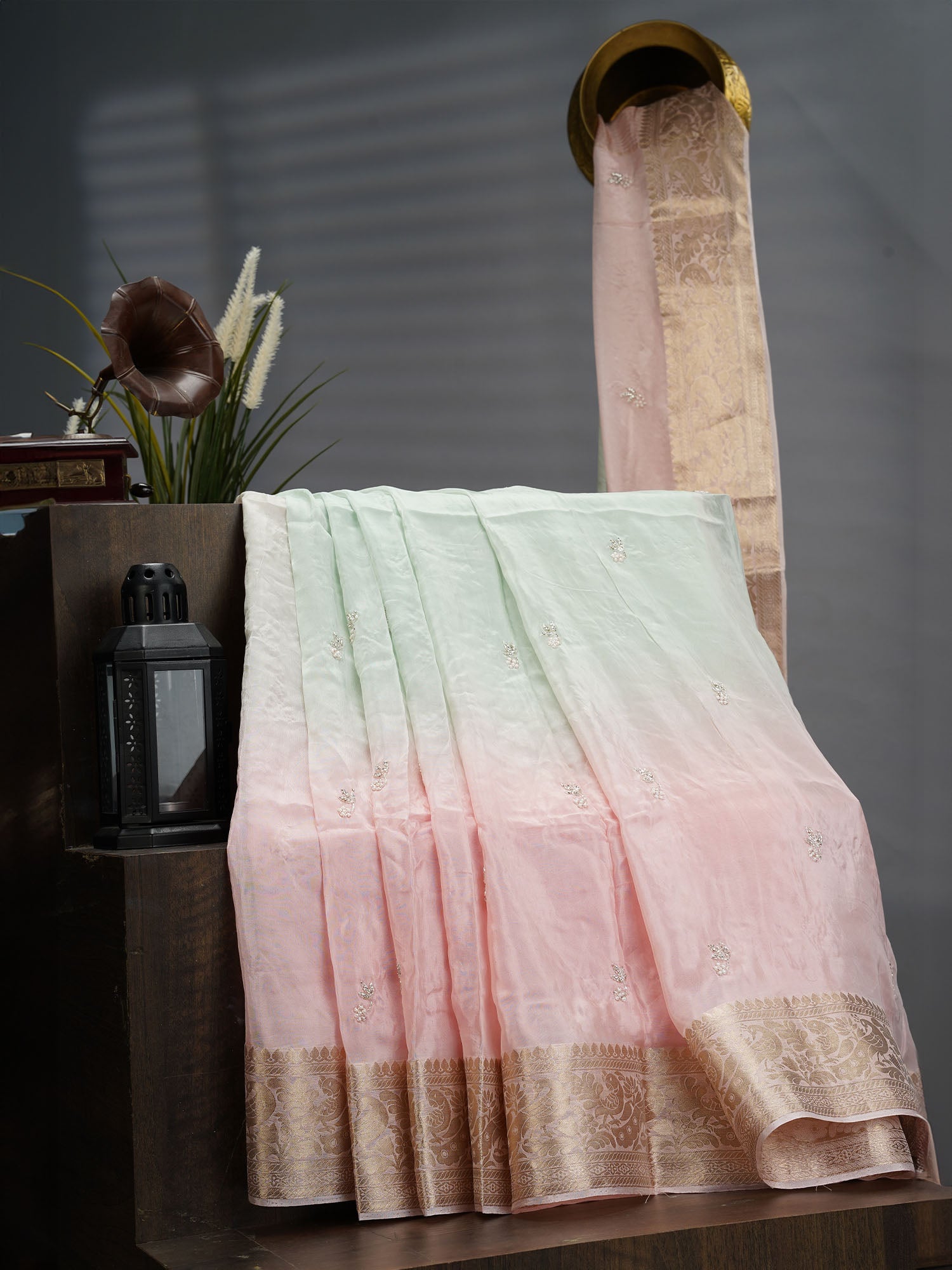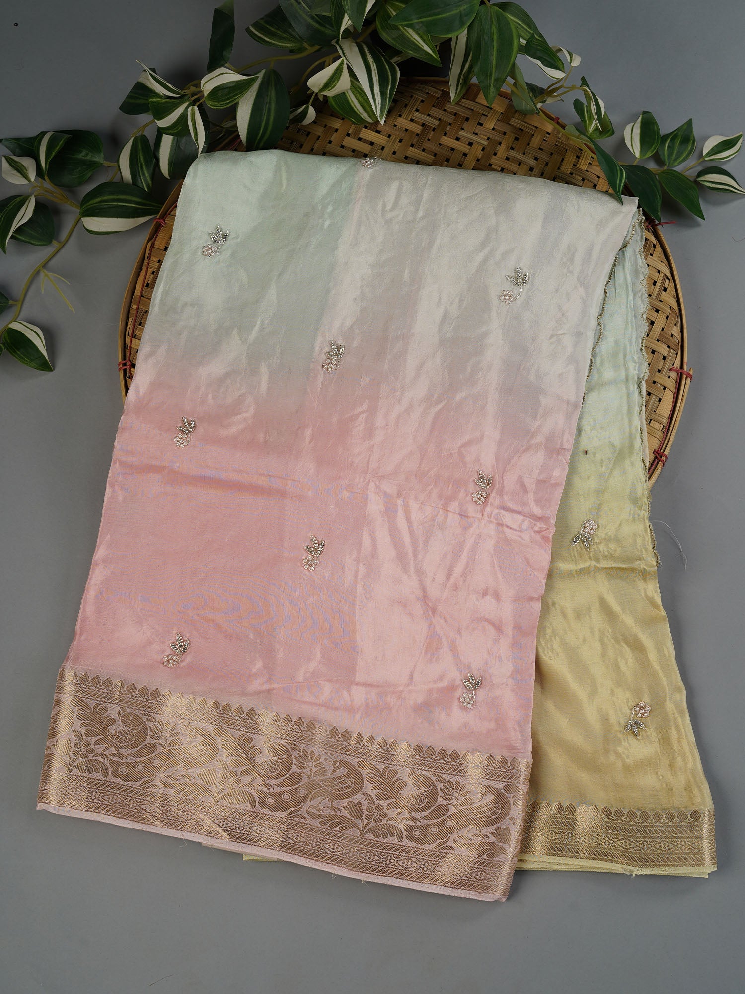 Russian Crape With Kardhana And Stone & Perarl Work Butties And Banaras Border - Peach & Blue