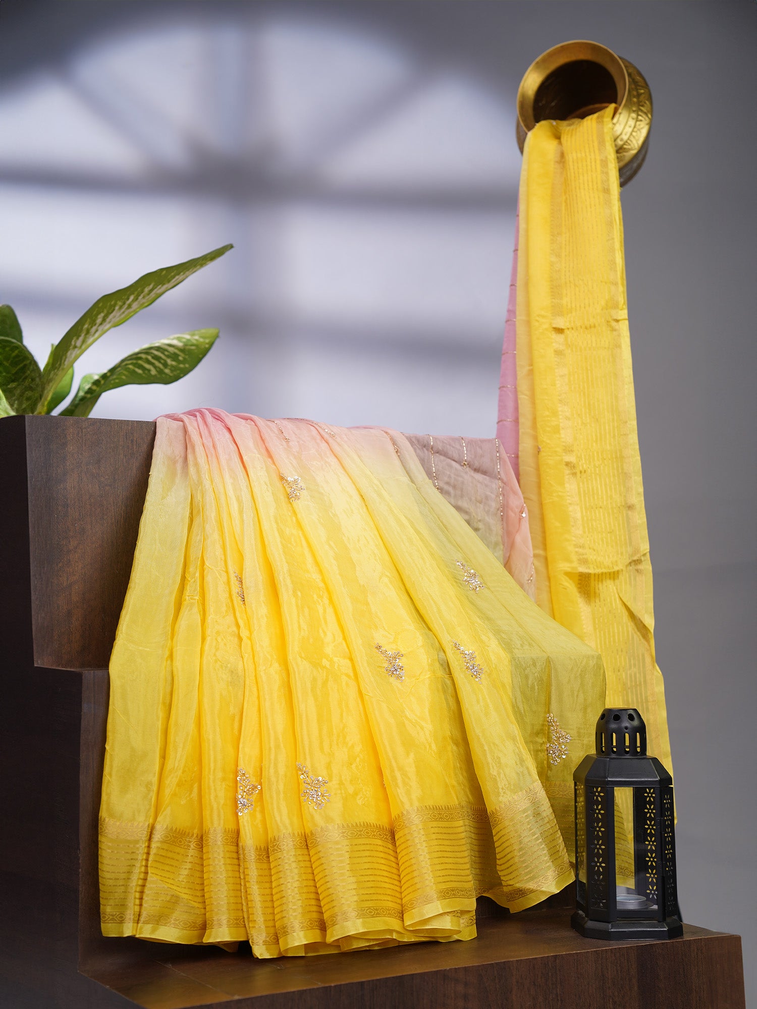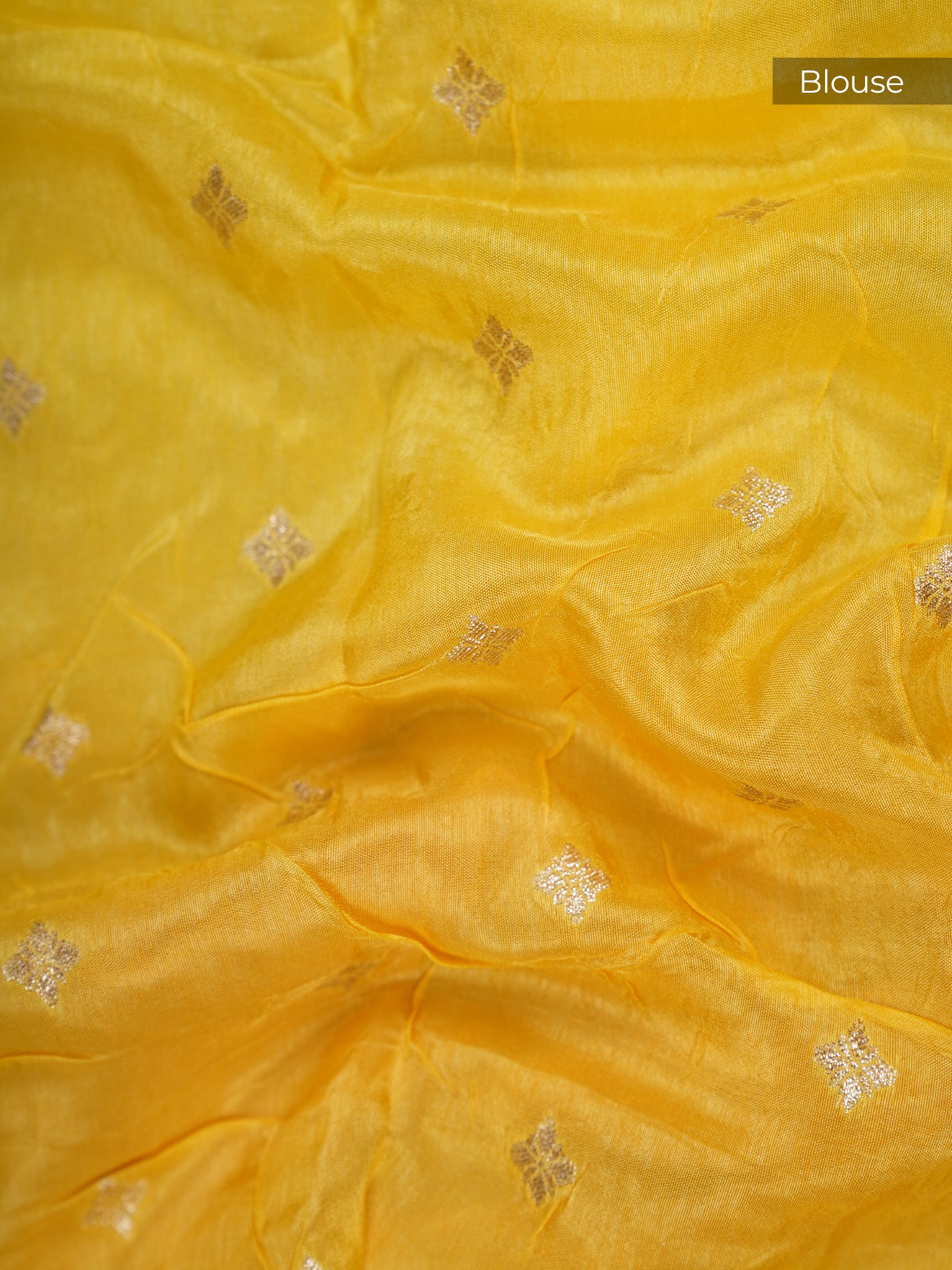 Experience elegance with this mustard yellow saree crafted from premium Russian crepe fabric. Adorned with Kardhana sequence buttis, it offers a subtle sparkle that enhances its rich texture. The classic Banaras border adds a traditional touch, making it ideal for formal occasions and cultural events. Lightweight yet durable, this saree ensures comfort throughout the day while maintaining a sophisticated look. Perfect for those seeking a refined blend of contemporary style and timeless craftsmanship.