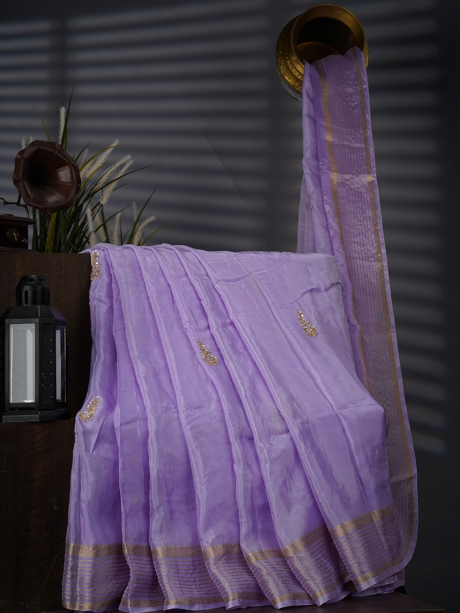 Drape yourself in lavender luxury with this stunning Russian Crepe saree that's equal parts elegance and enchantment. Delicate kardhana sequence...