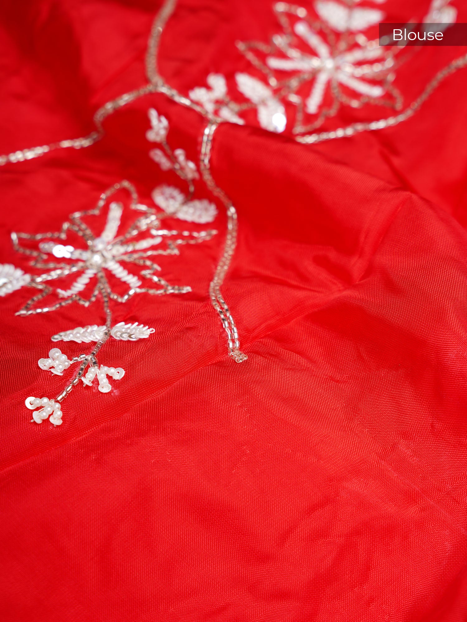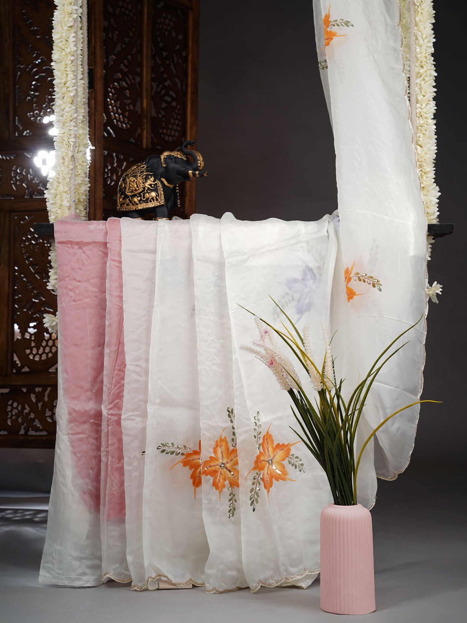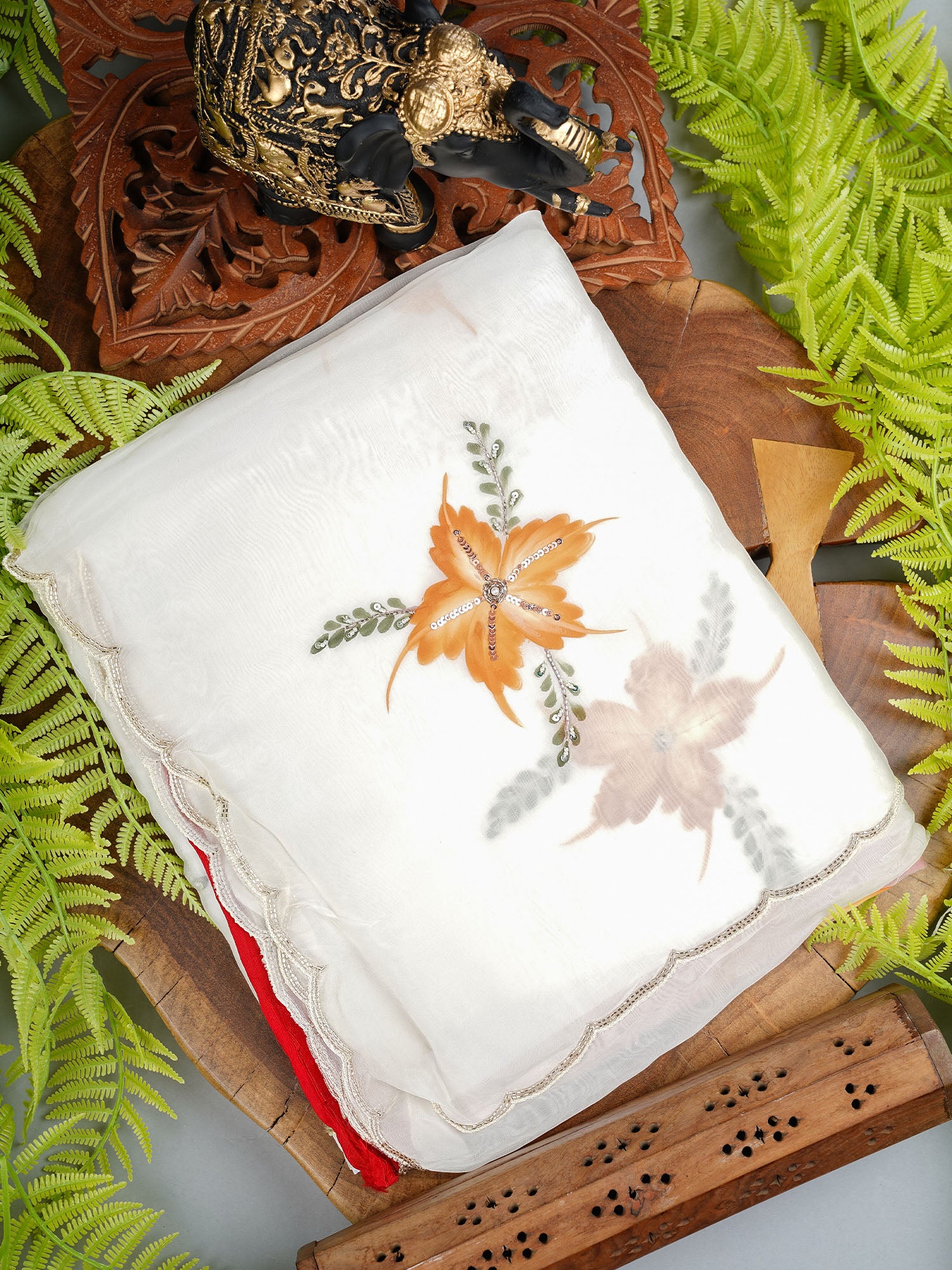 Russian Silk Saree Hand Painting Design With Kardana & Sequence Work Scallop Border With Pearl Work - White
