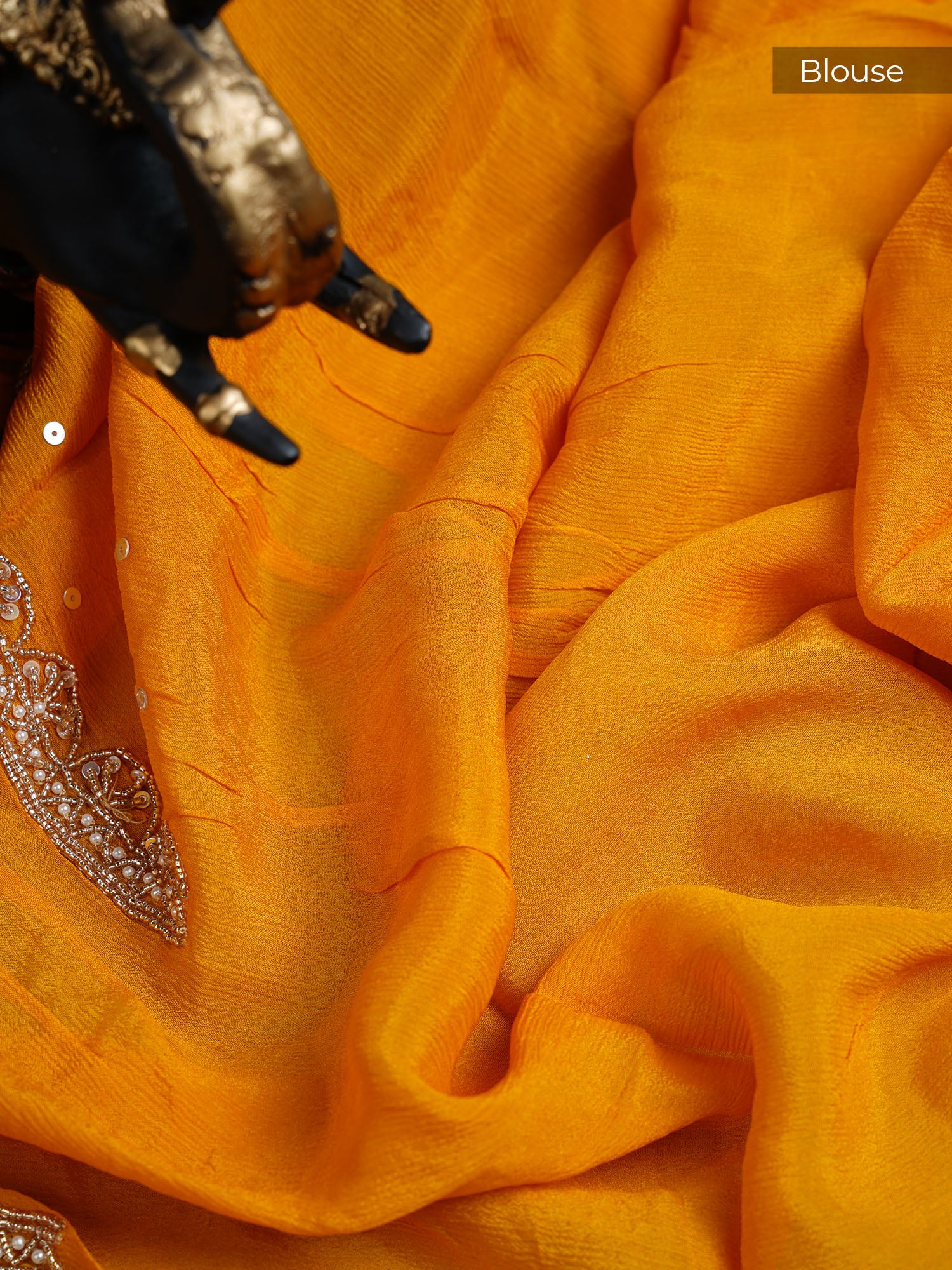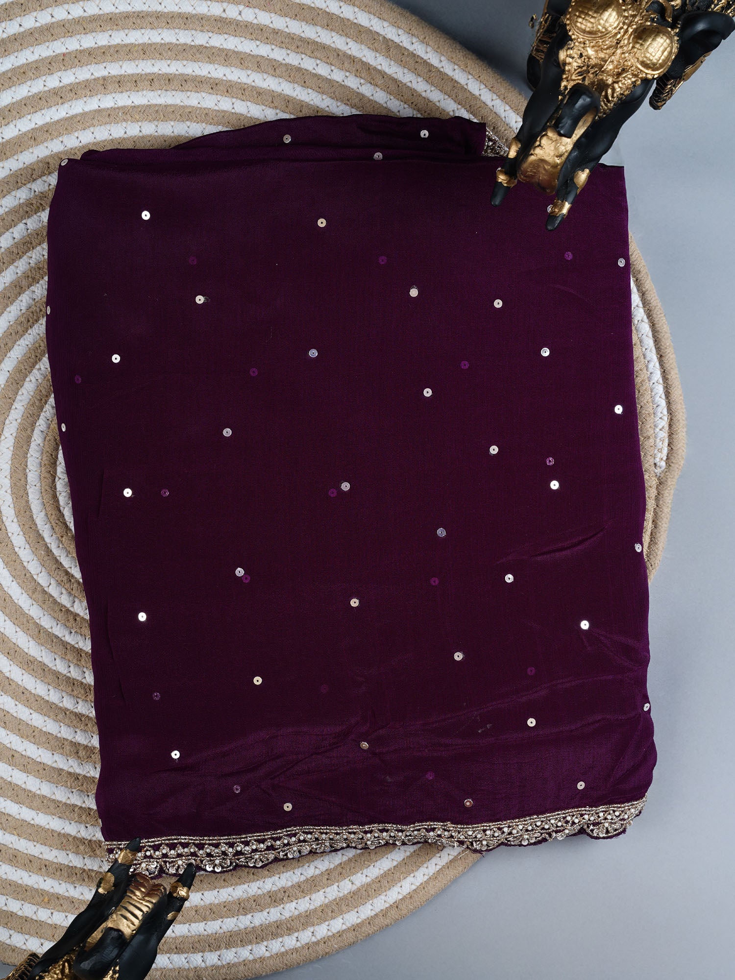 Drape yourself in pure elegance with this stunning Russian silk saree, where shimmering sequins dance across every inch of fabric. The luxurious silk base catches light beautifully, while intricate all-over sequence work adds mesmerizing sparkle and dimension. A graceful scallop border frames the saree with refined detail, creating a sophisticated silhouette that transitions seamlessly from traditional occasions to modern celebrations. Perfect for those who love a touch of glamour without compromising on timeless charm. The Vailet collection brings together premium craftsmanship and playful sophistication—because who says traditional can't be fun?