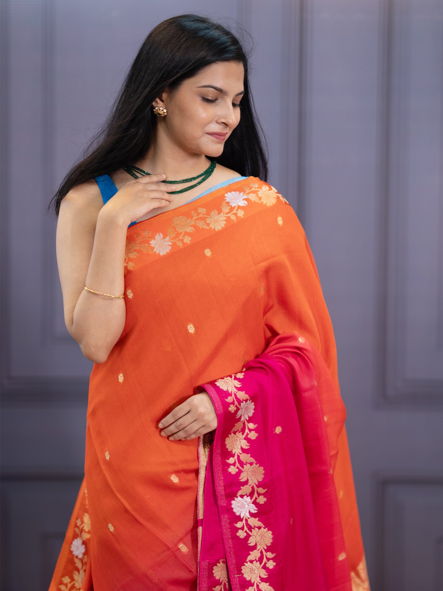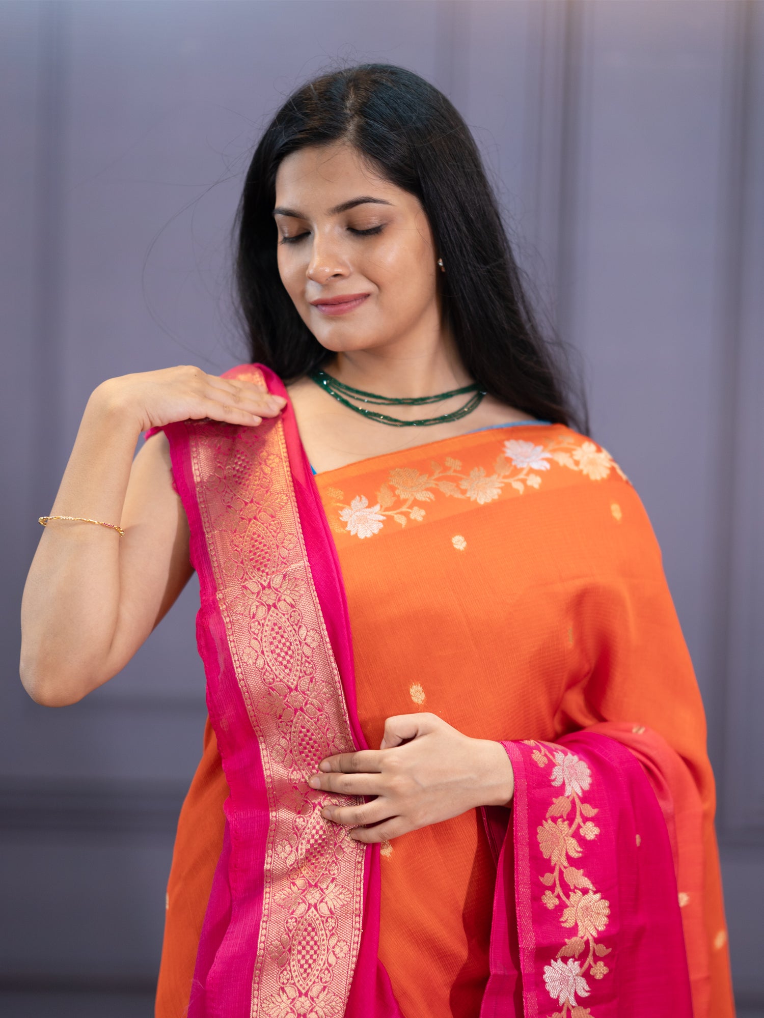 Experience the understated allure of this Mejanta Satin Kota saree, where golden zari buttis create an intricate tapestry across the fabric's luminous surface. The Mejanta shade—a soft, muted tone—provides a versatile canvas that complements diverse skin tones and styling preferences. Fine satin weaving ensures a graceful drape with subtle sheen, while the ornamental Banaras border commands attention with its elaborate zari detailing and traditional craftsmanship. Each butti is meticulously placed to create visual rhythm without overwhelming the design. This saree seamlessly transitions from festive celebrations to formal gatherings, offering the wearer both comfort and timeless elegance. An investment piece that celebrates heritage artistry while maintaining contemporary versatility.