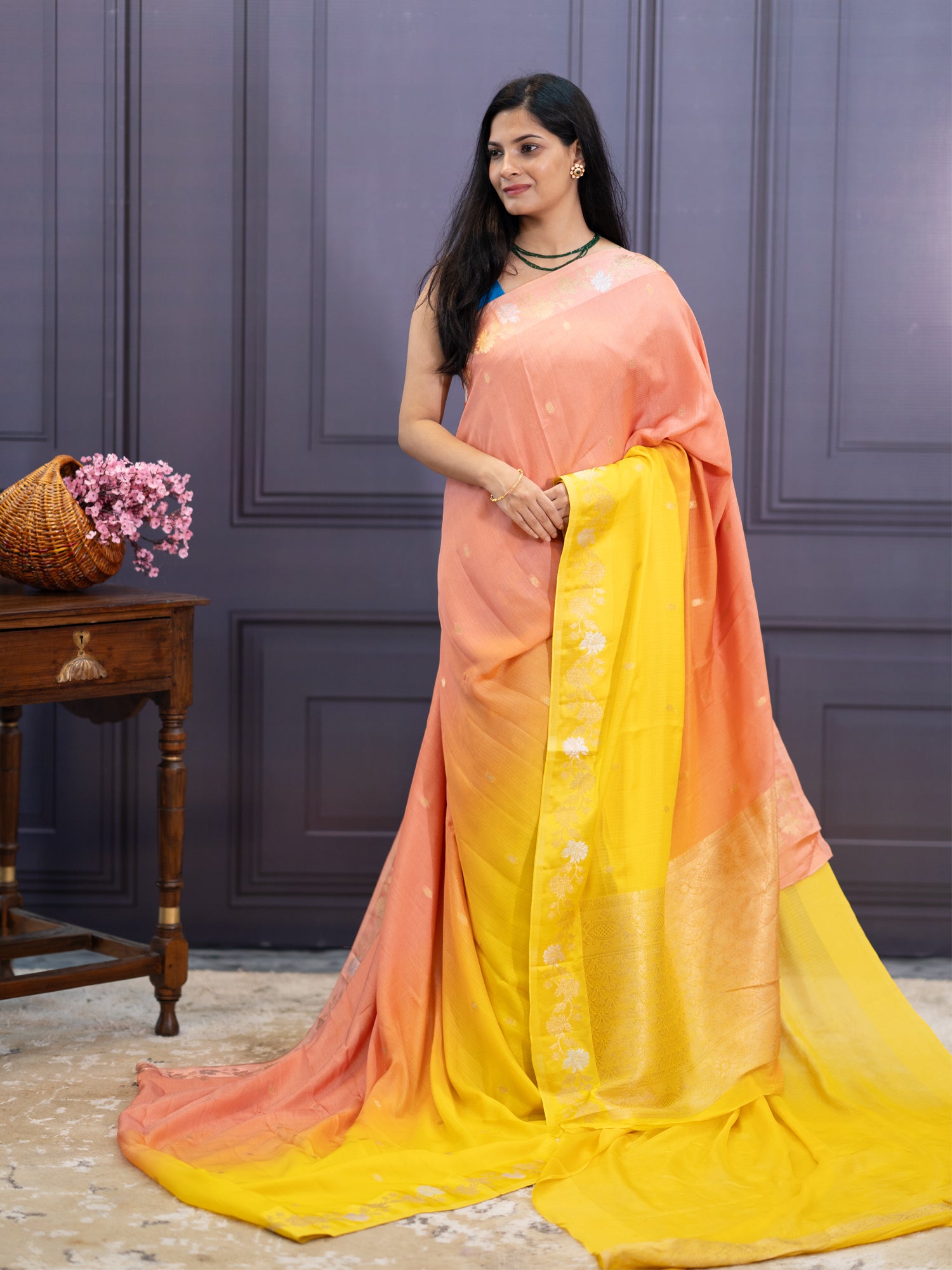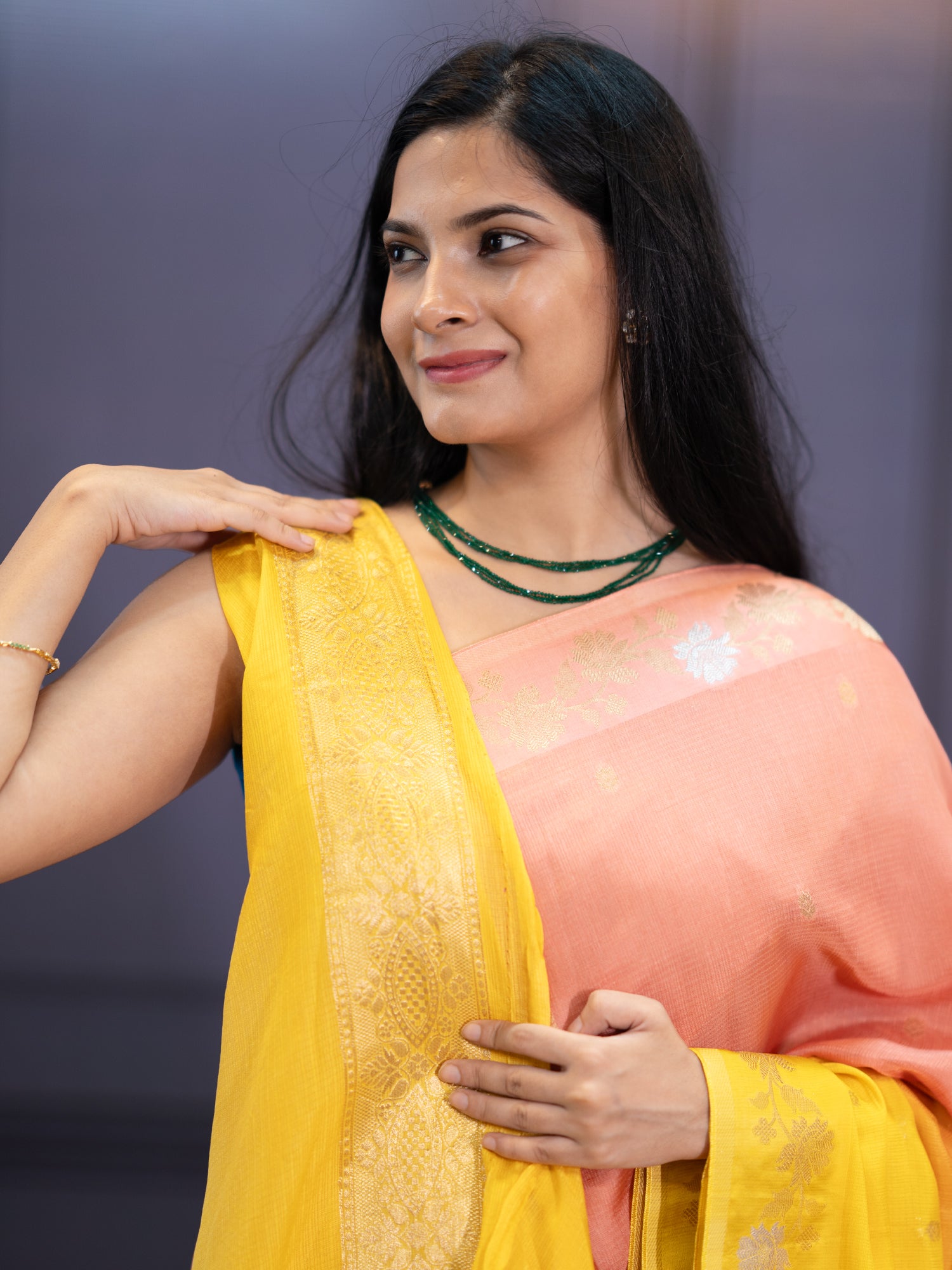 Discover timeless sophistication in this light yellow Satin Kota saree, where golden zari buttis dance across a luminous satin weave. The ethereal pale yellow tone creates an airy, graceful aesthetic, while the scattered floral motifs add visual depth and texture. The striking Banaras border frames the saree with elaborate zari embellishment, showcasing masterful weaving techniques passed down through generations. The satin finish ensures a refined drape that flatters the silhouette, making this piece equally suited for intimate celebrations and grand occasions. Perfect for those seeking a saree that balances understated elegance with ceremonial richness, this heirloom-quality piece transcends seasonal trends and remains a cherished wardrobe staple.