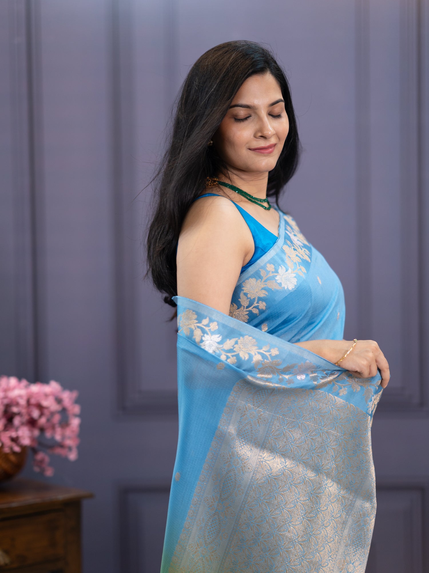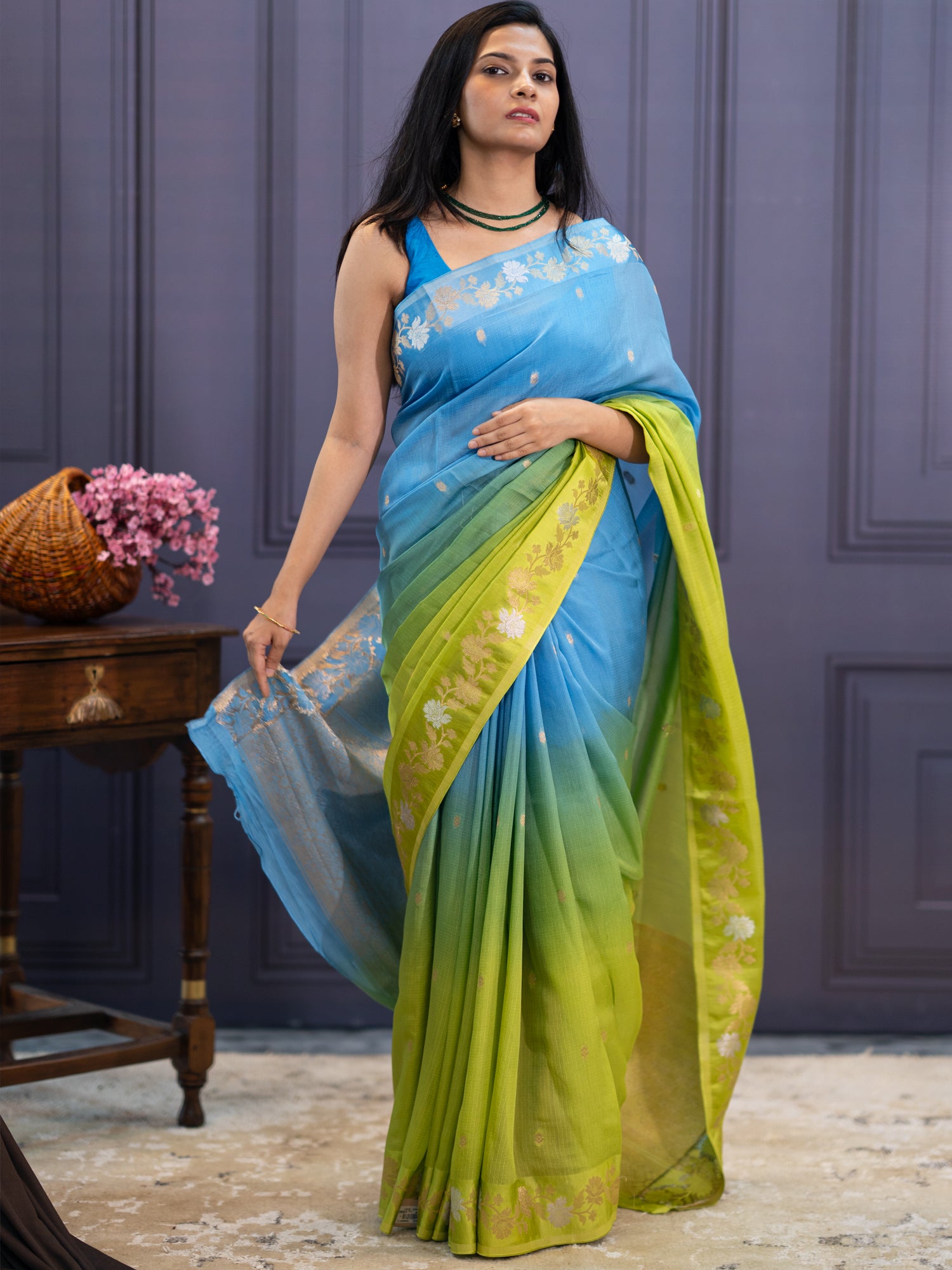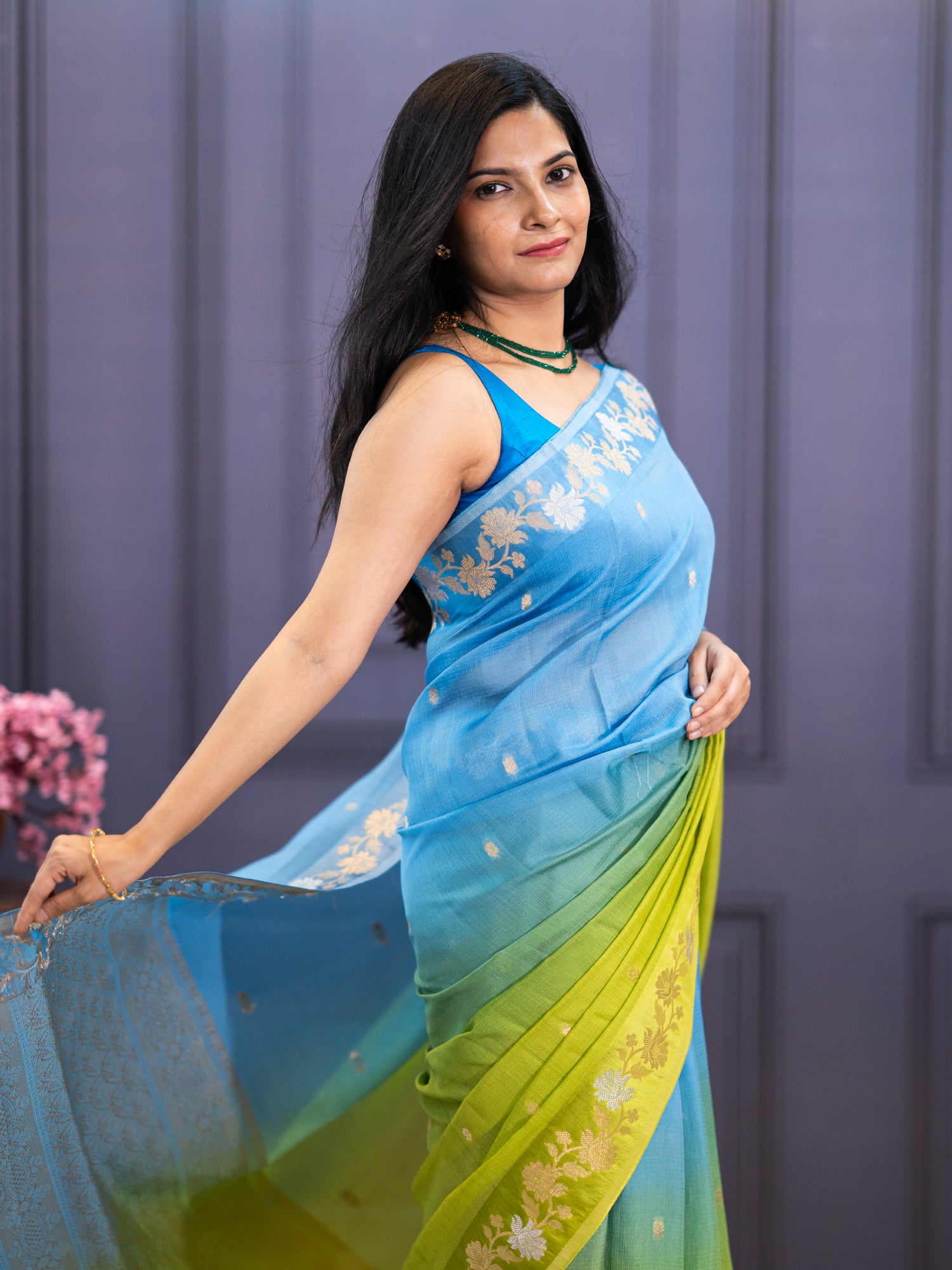 This verdant Satin Kota saree captures the essence of refined elegance through its rich green hue and masterfully executed golden zari embellishment. The body features delicate buttis woven throughout, creating a sophisticated pattern that draws the eye without demanding attention. The luxurious satin weave provides a gentle luminosity and fluid drape that moves gracefully with every gesture. The ornate Banaras border showcases exceptional artisanal skill, with intricate zari work that frames the saree in traditional splendor. The deep green tone pairs beautifully with gold accents, creating a naturally harmonious color palette ideal for weddings, festivals, and formal occasions. A distinguished choice for those who appreciate the marriage of heritage craftsmanship with contemporary sensibilities.