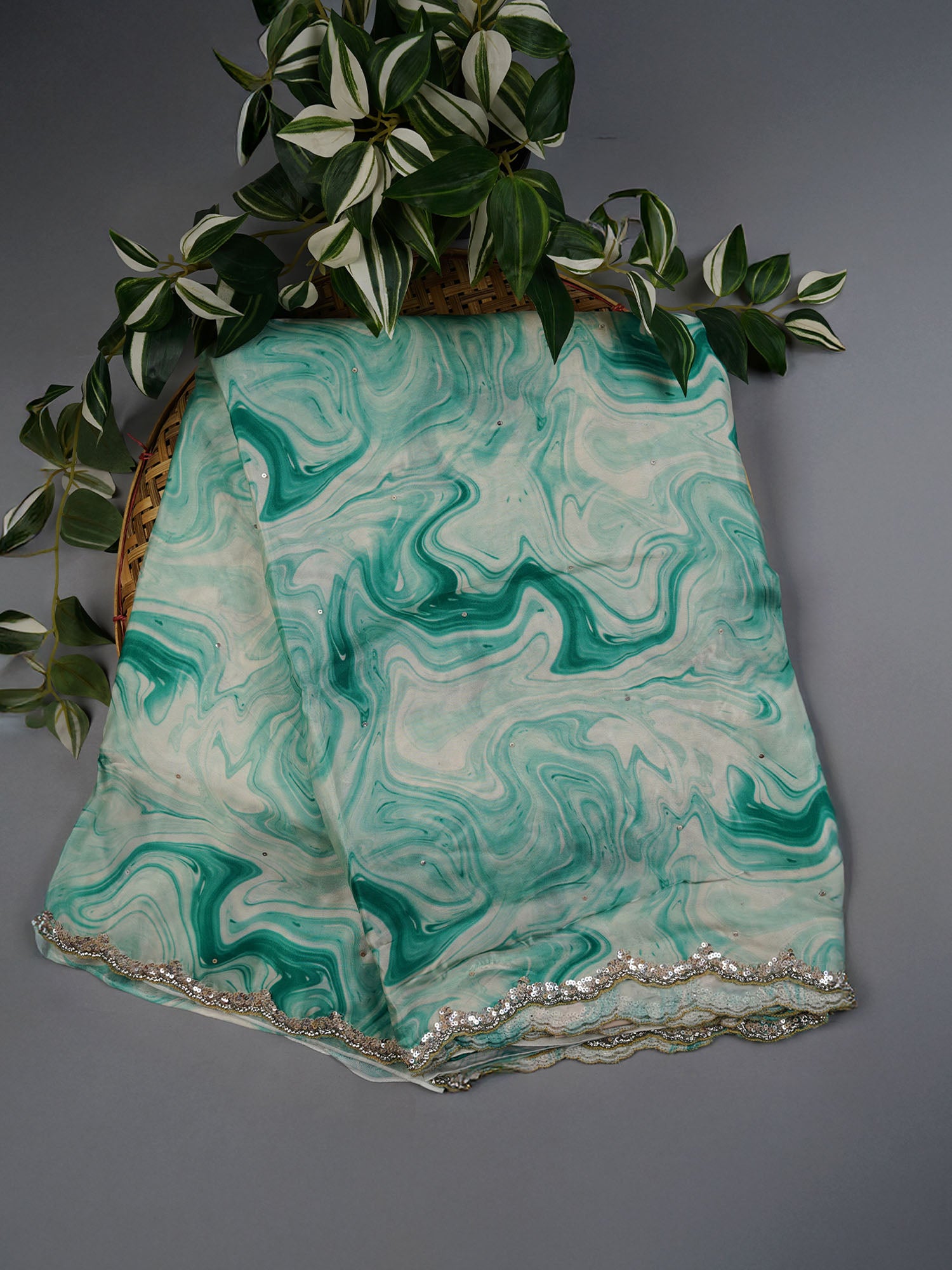 Satin Silk Saree With Shibori Print Scallop Border Kardana Sequence Work - Sea Green