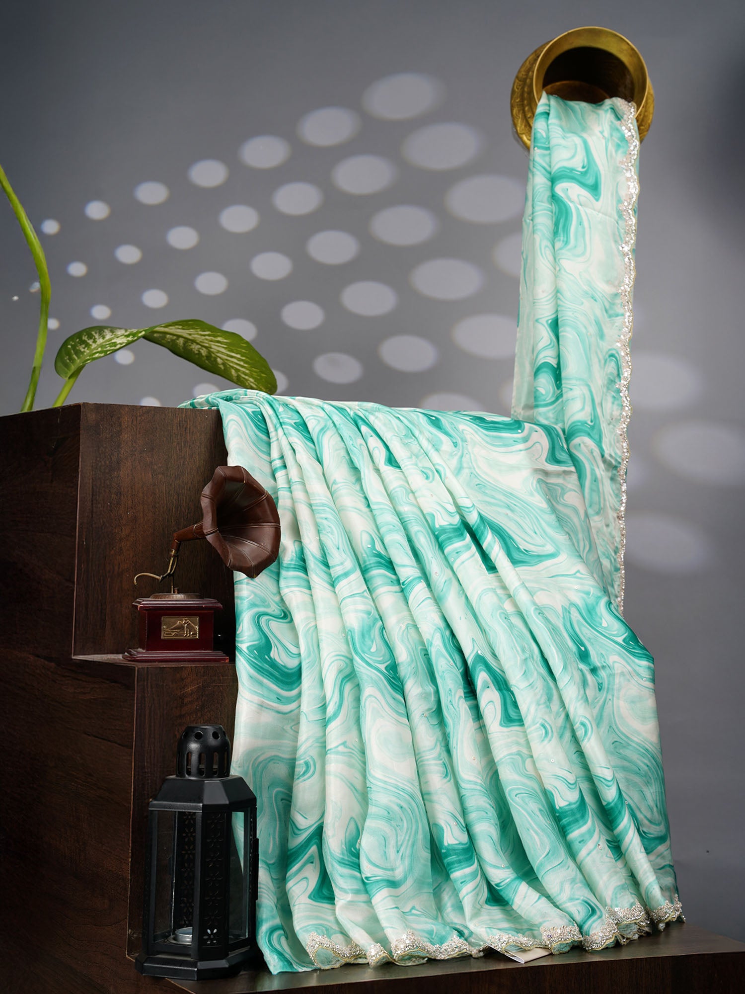 Dive into elegance with this stunning sea green satin silk saree that's pure magic! The mesmerizing shibori print creates an...