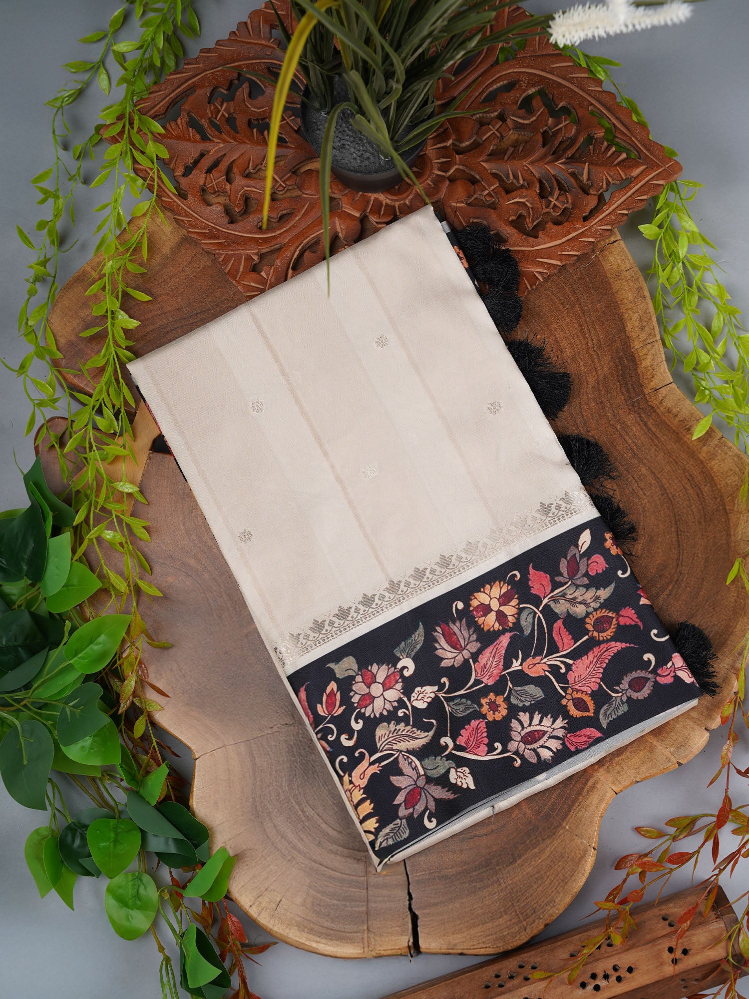 Semi Tusser Saree With Golden Butties With Kalamkari Boarder - Beige