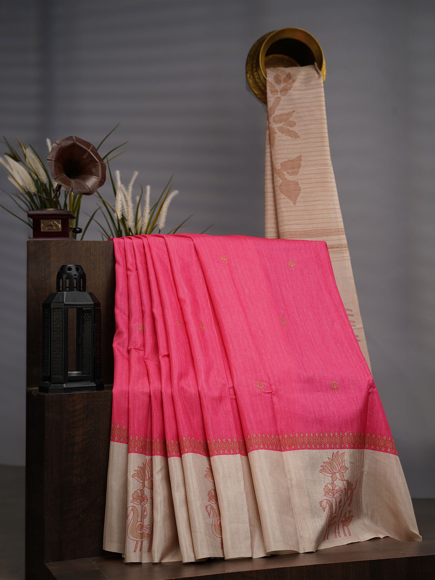 Semi Tusser silk combines the luxurious drape of pure silk with enhanced durability and affordability. This stunning piece features a vibrant digital print with a striking contrast border in complementary shades, creating visual depth and sophistication. The pink hue radiates elegance while the digital printing technique ensures crisp, detailed patterns that resist fading. Perfect for both everyday wear and special occasions, this saree offers the comfort of breathable fabric with the refined aesthetic of traditional silk. The contrast border adds a contemporary touch to classic saree styling, making it versatile for various draping preferences and occasions.