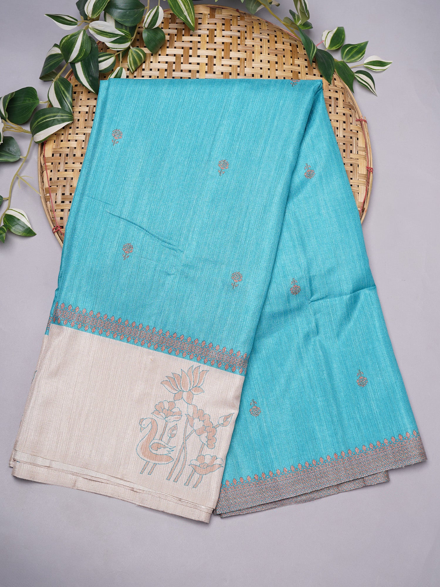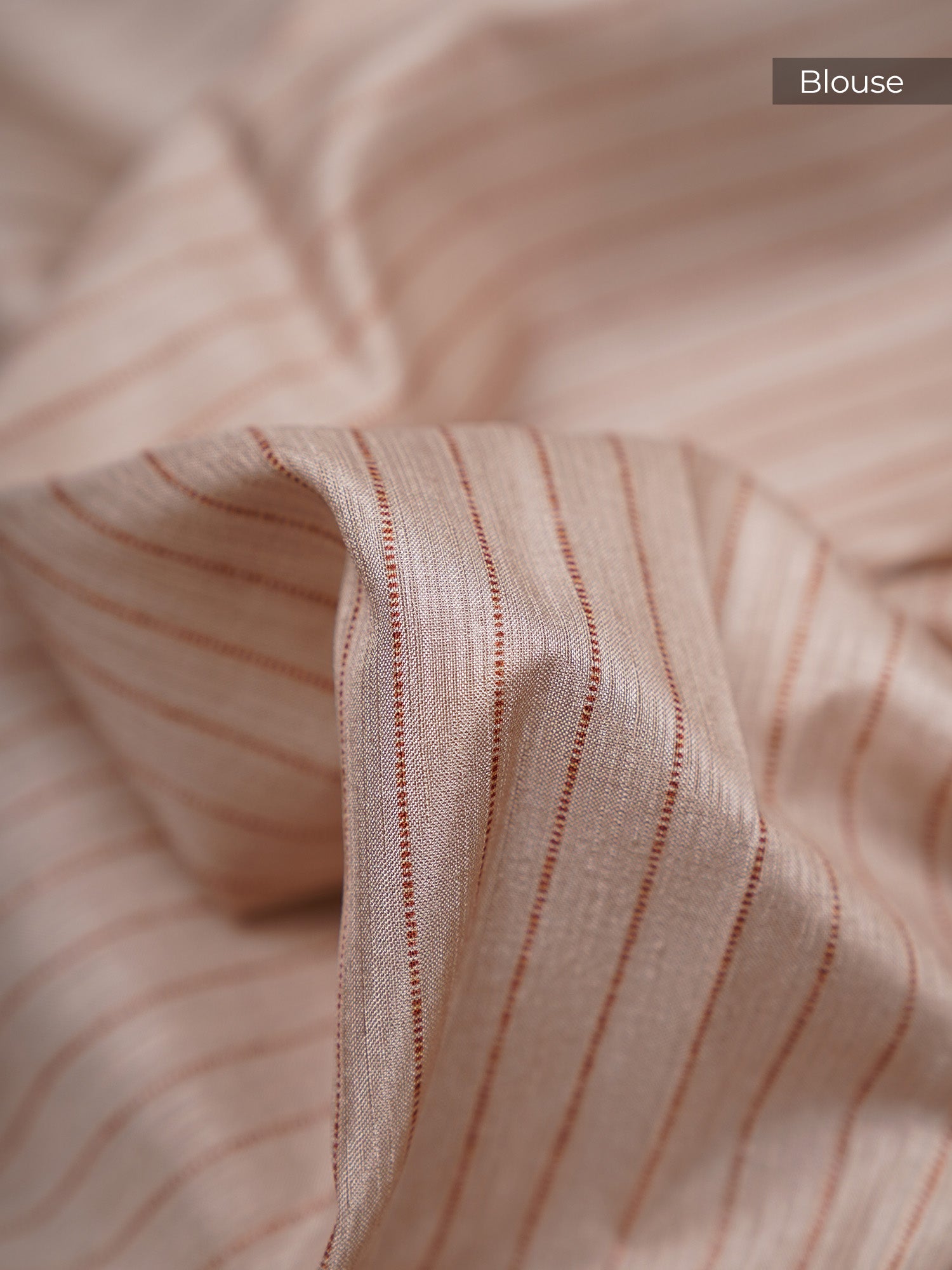 Crafted from semi Tusser silk, this fabric combines the natural texture and durability of Tusser silk with a smooth finish ideal for elegance and comfort. The printed contrast border adds a sophisticated touch, enhancing the overall aesthetic and making it perfect for both traditional and contemporary attire. Its balanced weight ensures ease of draping while maintaining a refined appearance suitable for expert tailoring and customized designs.