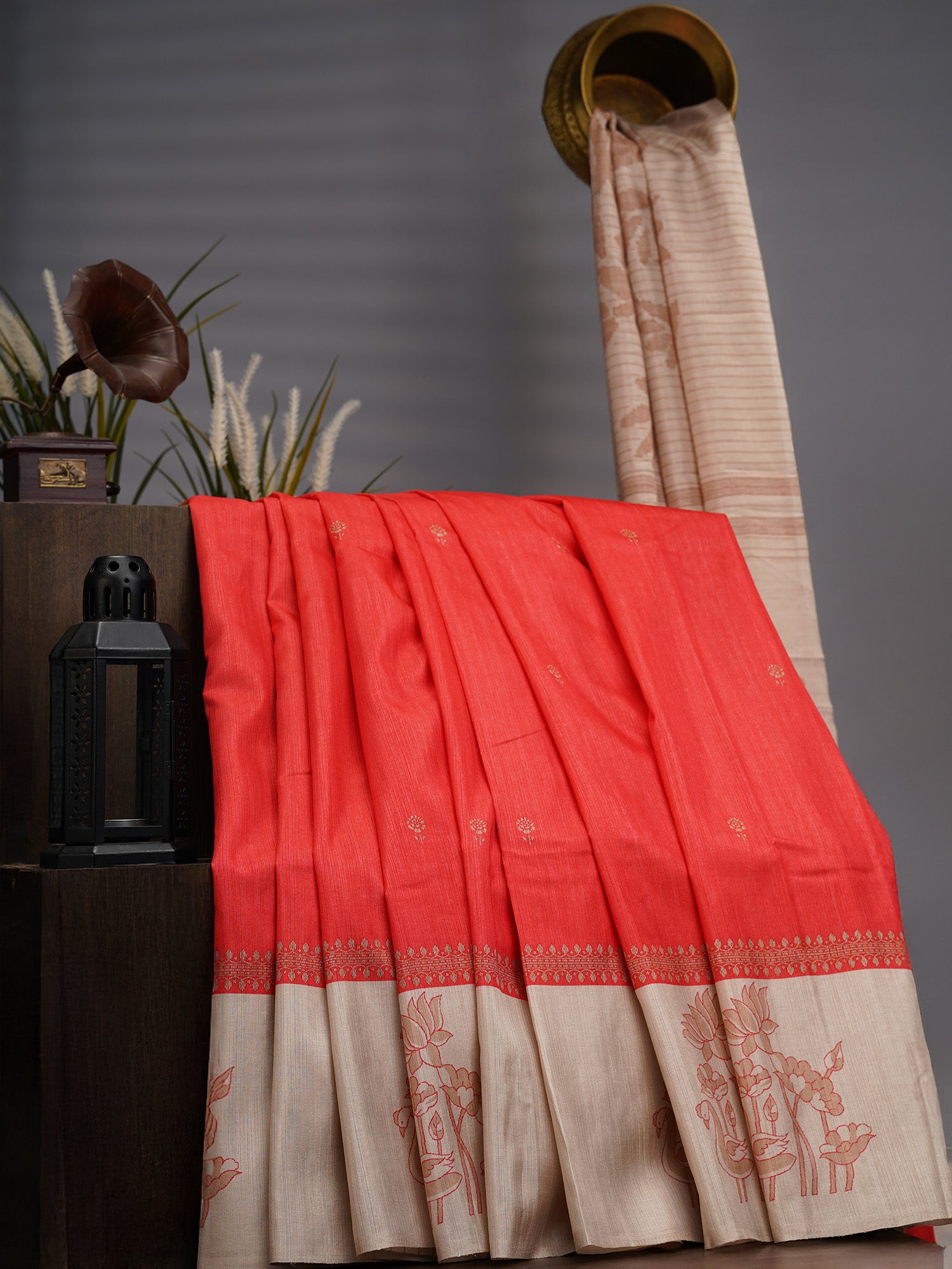 Semi Tusser Silk with Printed Contrast Border - Red