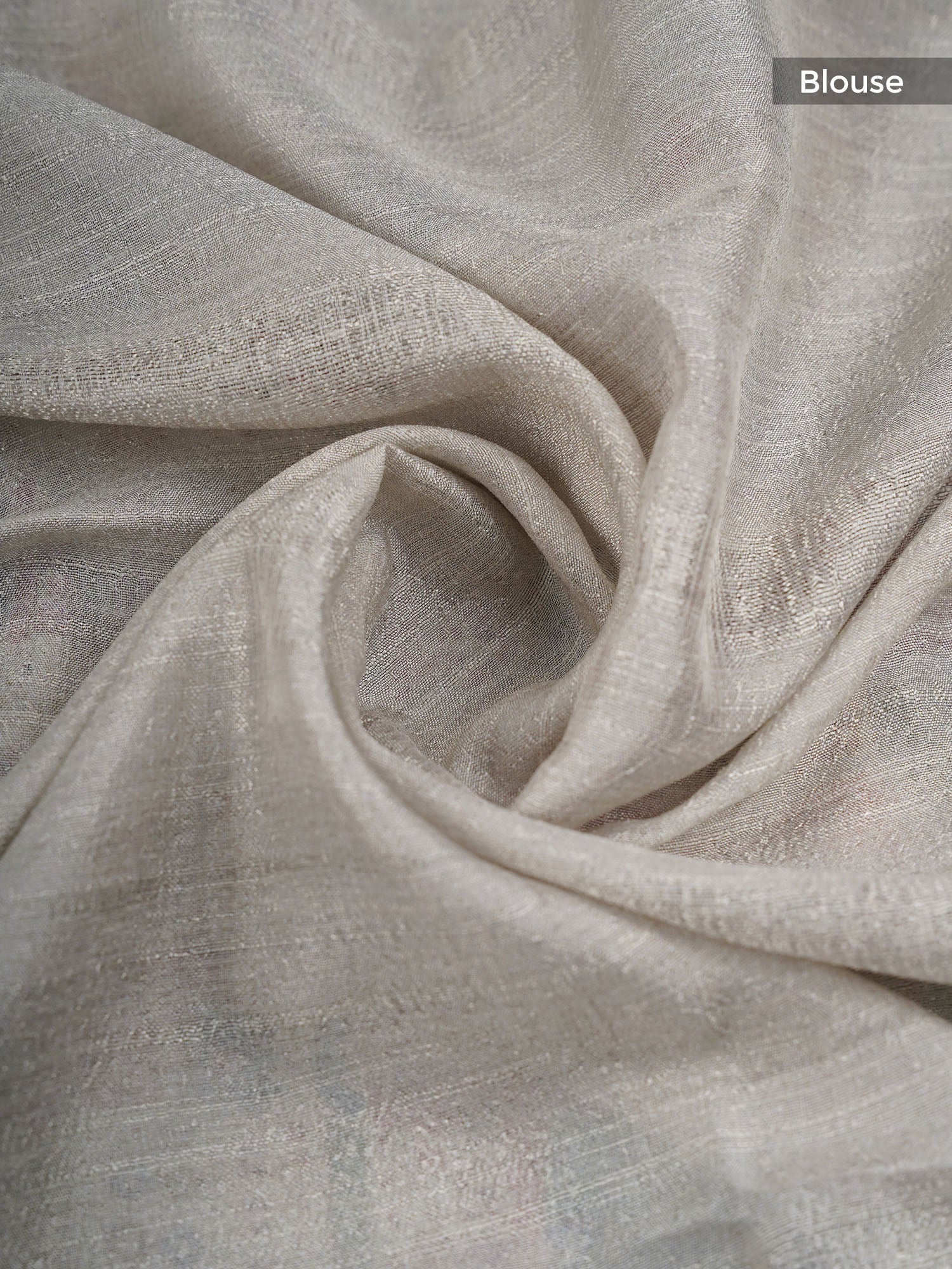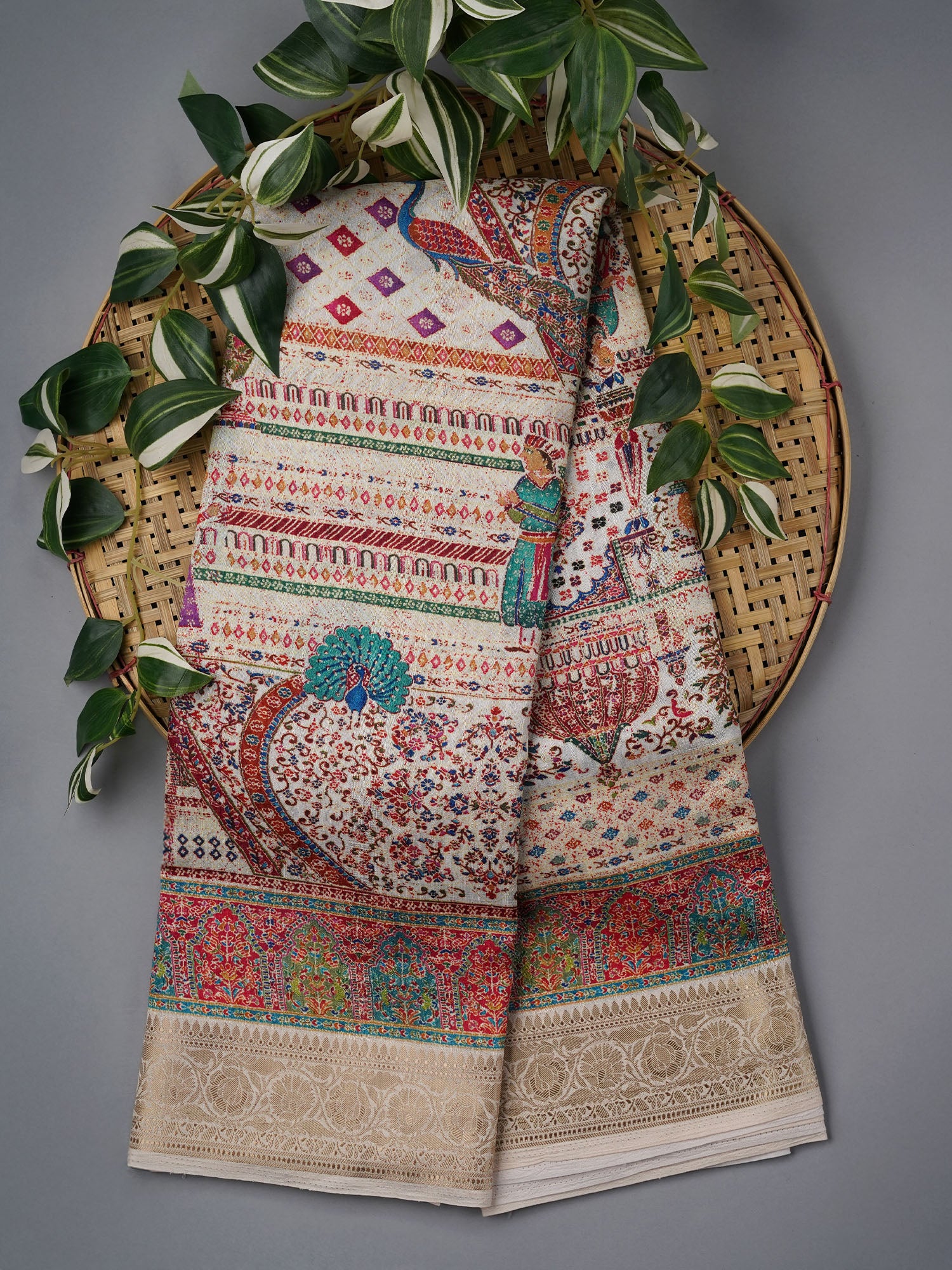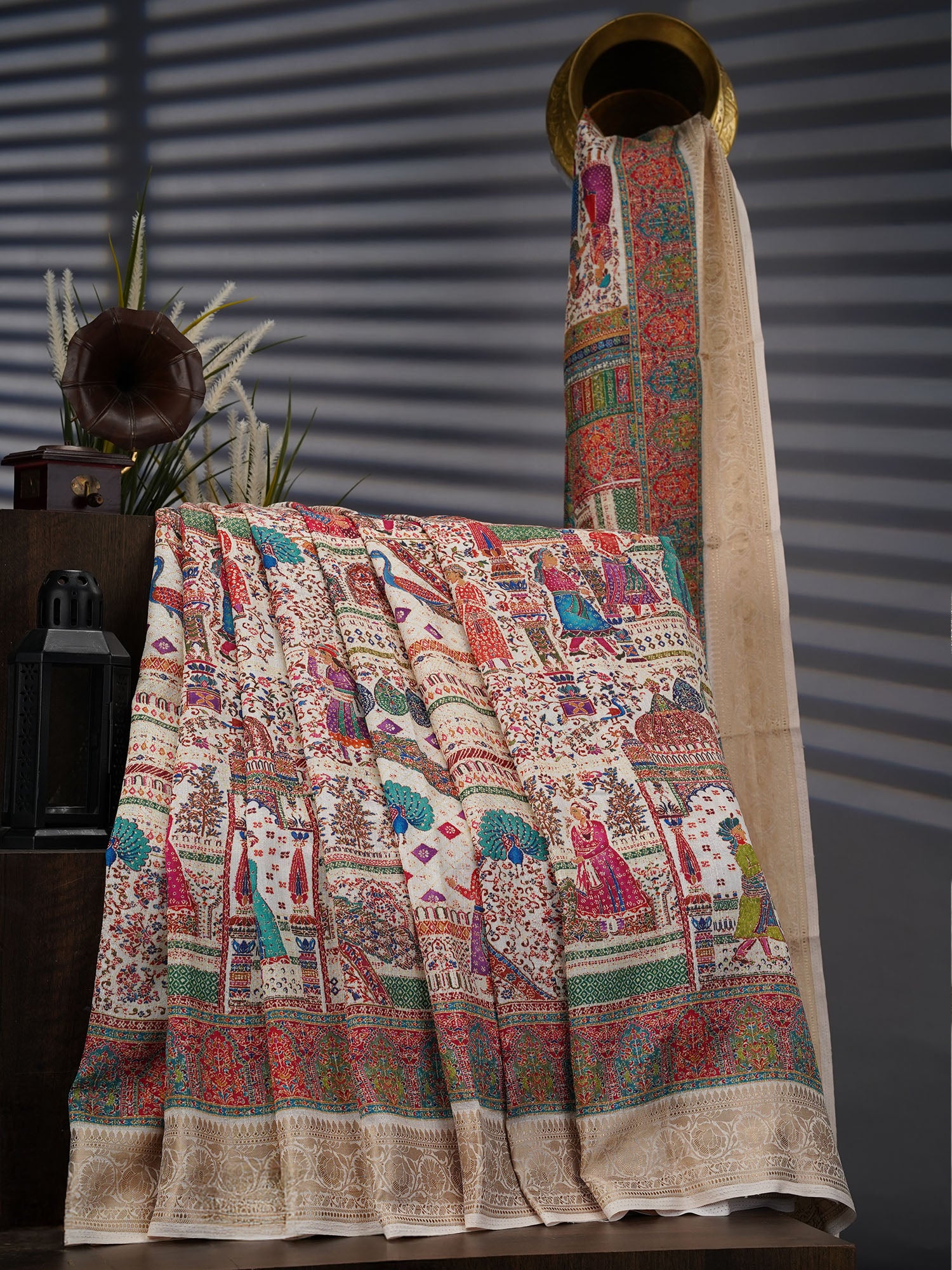 Semi Tusser Silk With Pashmina Print With Kanchi Border - Cream