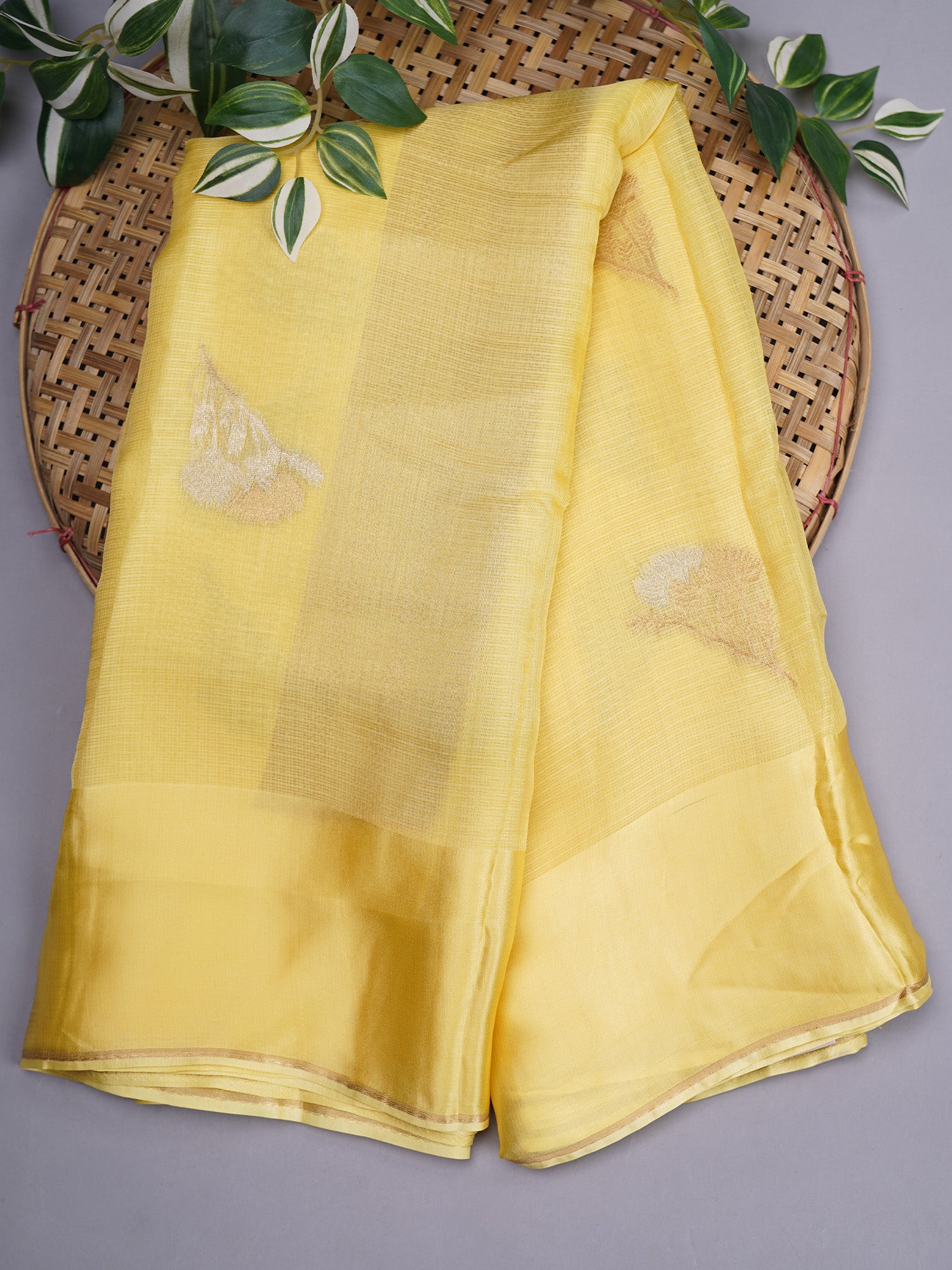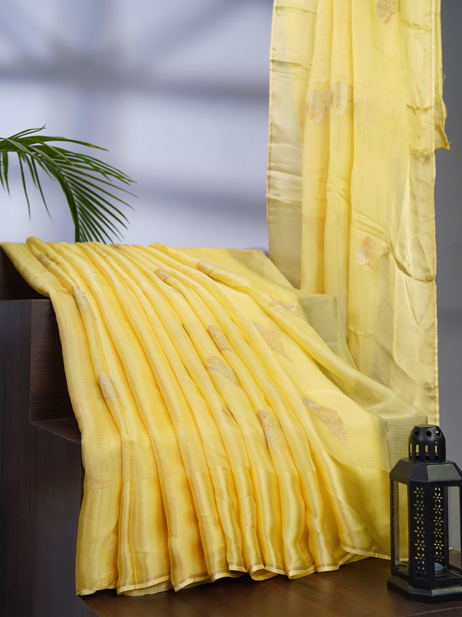 Elevate your wardrobe with this exquisite Silk Kota saree featuring intricate golden zari butties that shimmer with grace. The rich...