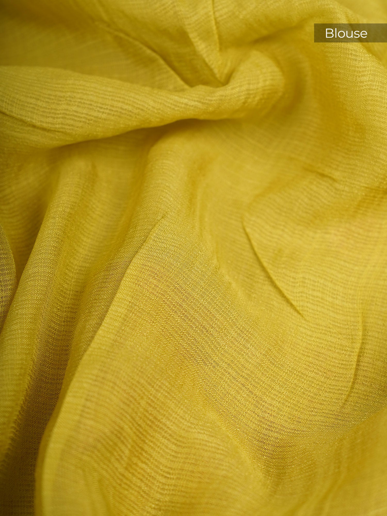 Crafted from exquisite silk Kota fabric, this yellow saree showcases an intricate allover pattern of golden zari buttis, adding a...