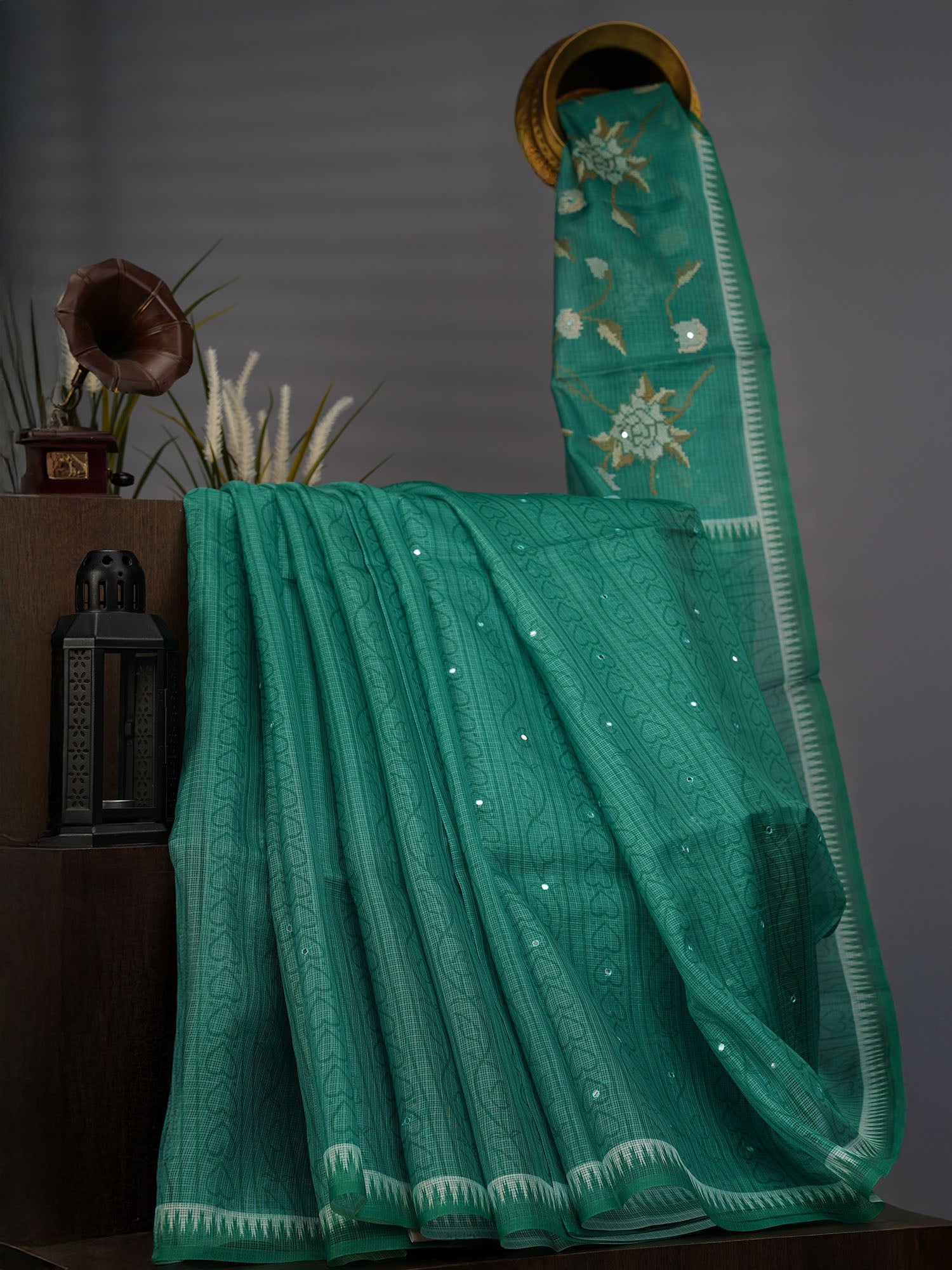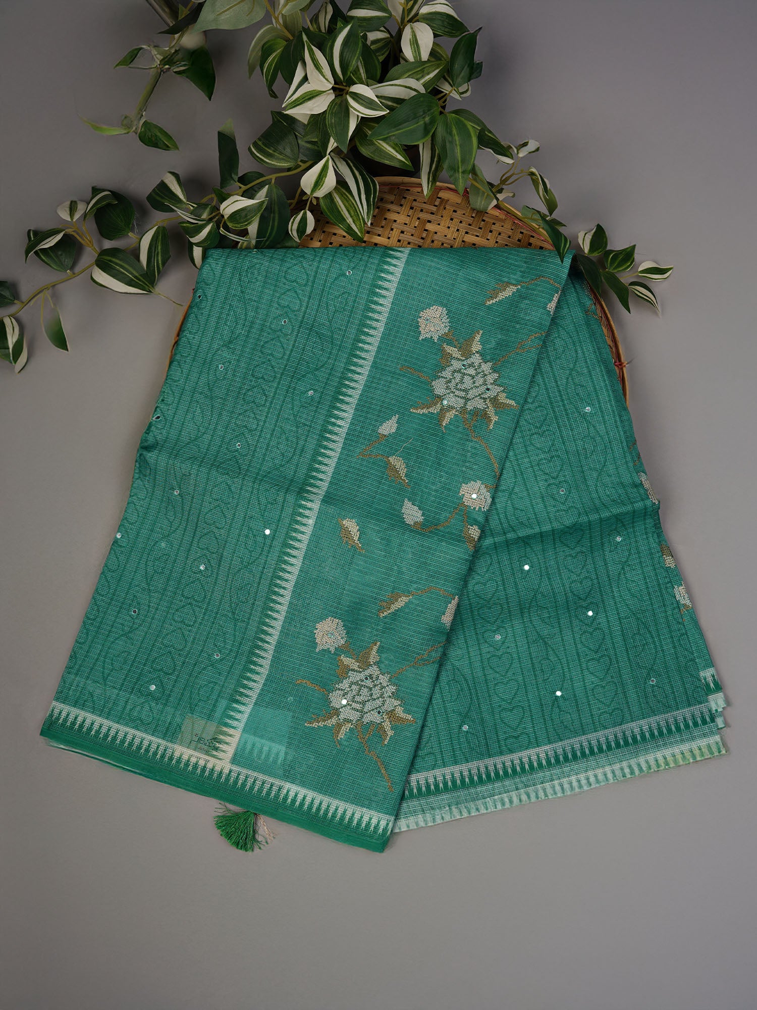Elevate your ethnic wardrobe with this exquisite Silk Kota saree, featuring the timeless Lehariya design in a sophisticated green palette. The delicate diagonal striped pattern is beautifully complemented by intricate mirror work that catches light with every movement, adding dimension and glamour to your ensemble. Crafted from premium silk Kota fabric, this saree offers a perfect balance of breathability and elegance, making it ideal for festive occasions, celebrations, and special events. The mirror embellishments showcase traditional craftsmanship while the vibrant green hue flatters a variety of skin tones. A versatile choice for those who appreciate refined, handcrafted textiles with authentic design elements.