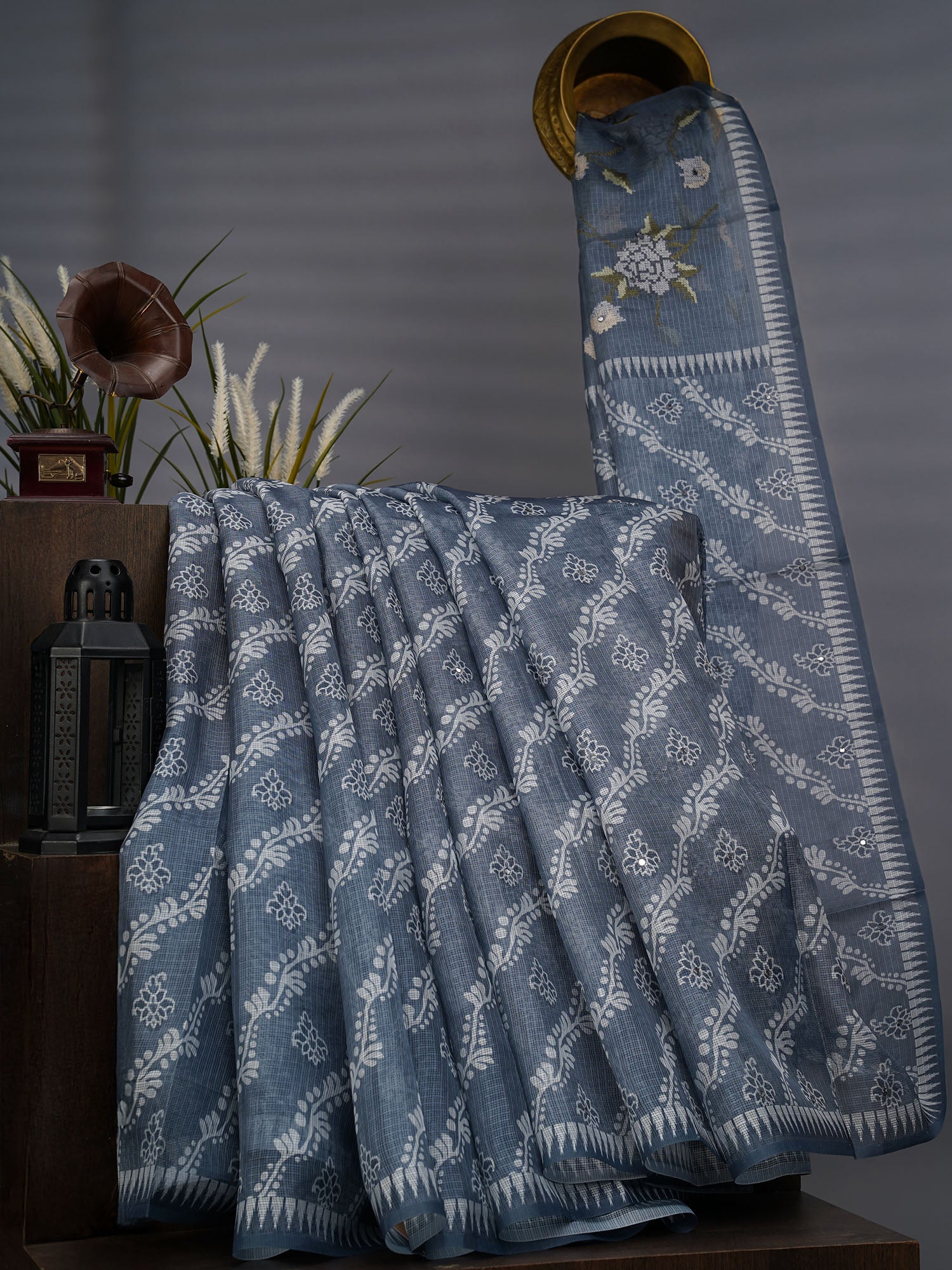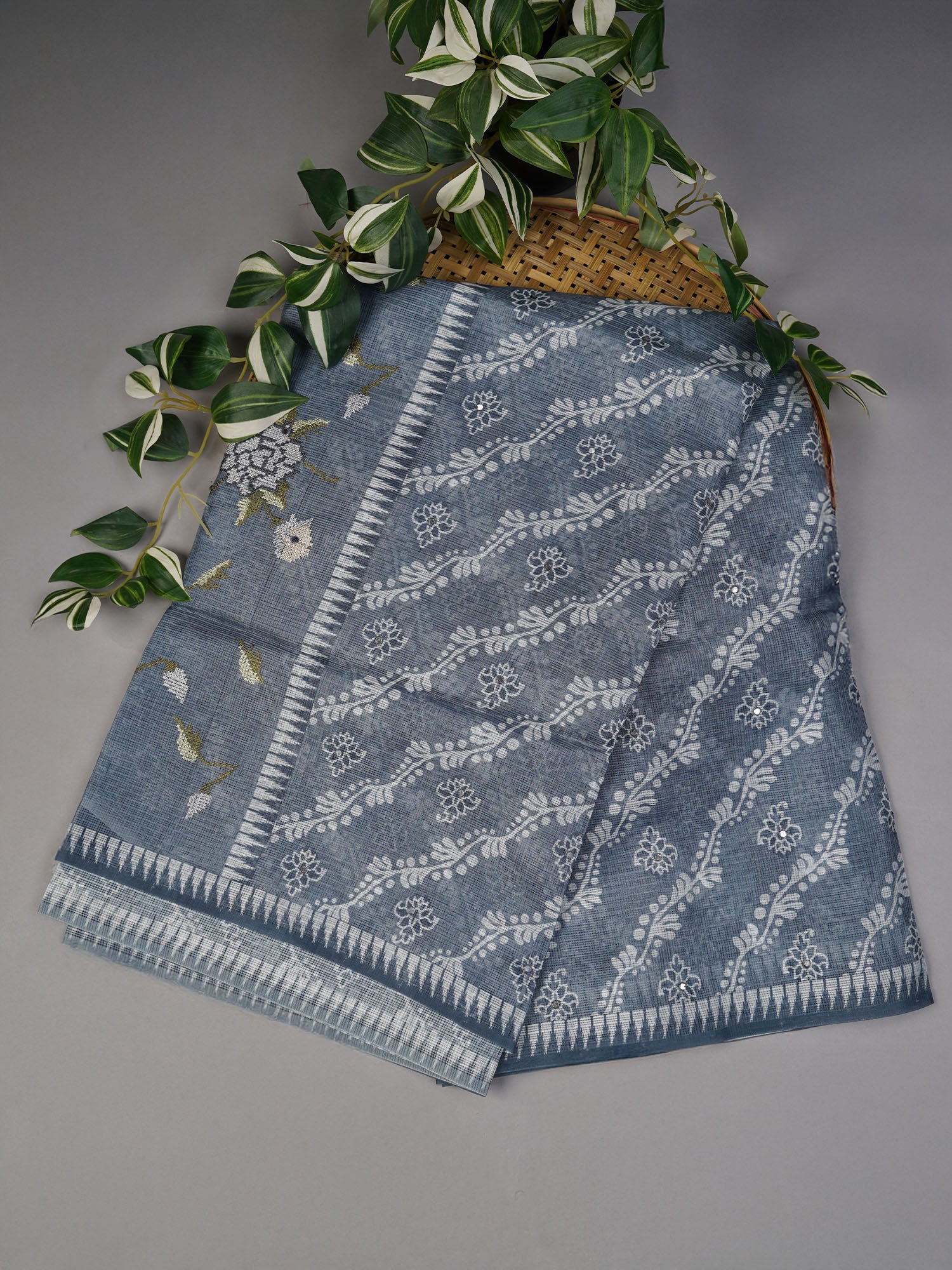 Elevate your ethnic wardrobe with this exquisite Silk Kota saree, featuring the timeless Lehariya design in sophisticated grey. The delicate diagonal striped pattern is beautifully complemented by intricate mirror work that catches light with every movement, adding dimension and glamour to your ensemble. Crafted from premium silk Kota fabric, this saree offers a perfect balance of breathability and elegance, making it ideal for festive occasions, celebrations, and special events. The mirror embellishments create a refined sparkle without overwhelming the design, while the classic grey tone ensures versatility in styling. A masterpiece that combines traditional craftsmanship with contemporary aesthetics.