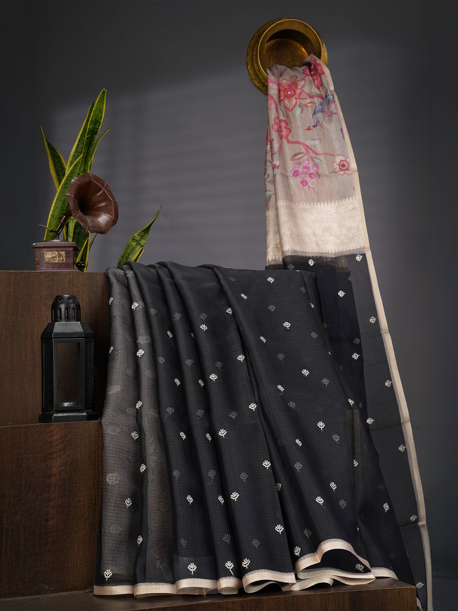 Drape yourself in pure elegance with this stunning Silk Kota saree that's basically a love letter to timeless beauty. The luxurious silk fabric glides effortlessly, while intricate silver zari butties dance across the entire length, creating a mesmerizing sparkle that catches every eye. The rich gold border adds that perfect finishing touch of grandeur, making this black beauty your go-to for celebrations, weddings, or whenever you want to feel absolutely fabulous. Lightweight yet sophisticated, it's the kind of saree that makes you feel like the star you are.