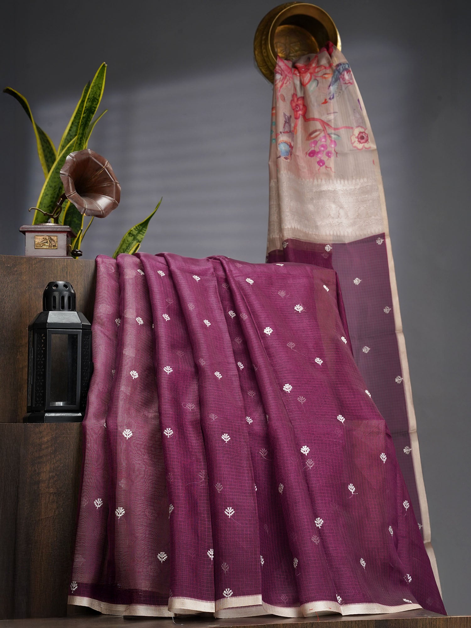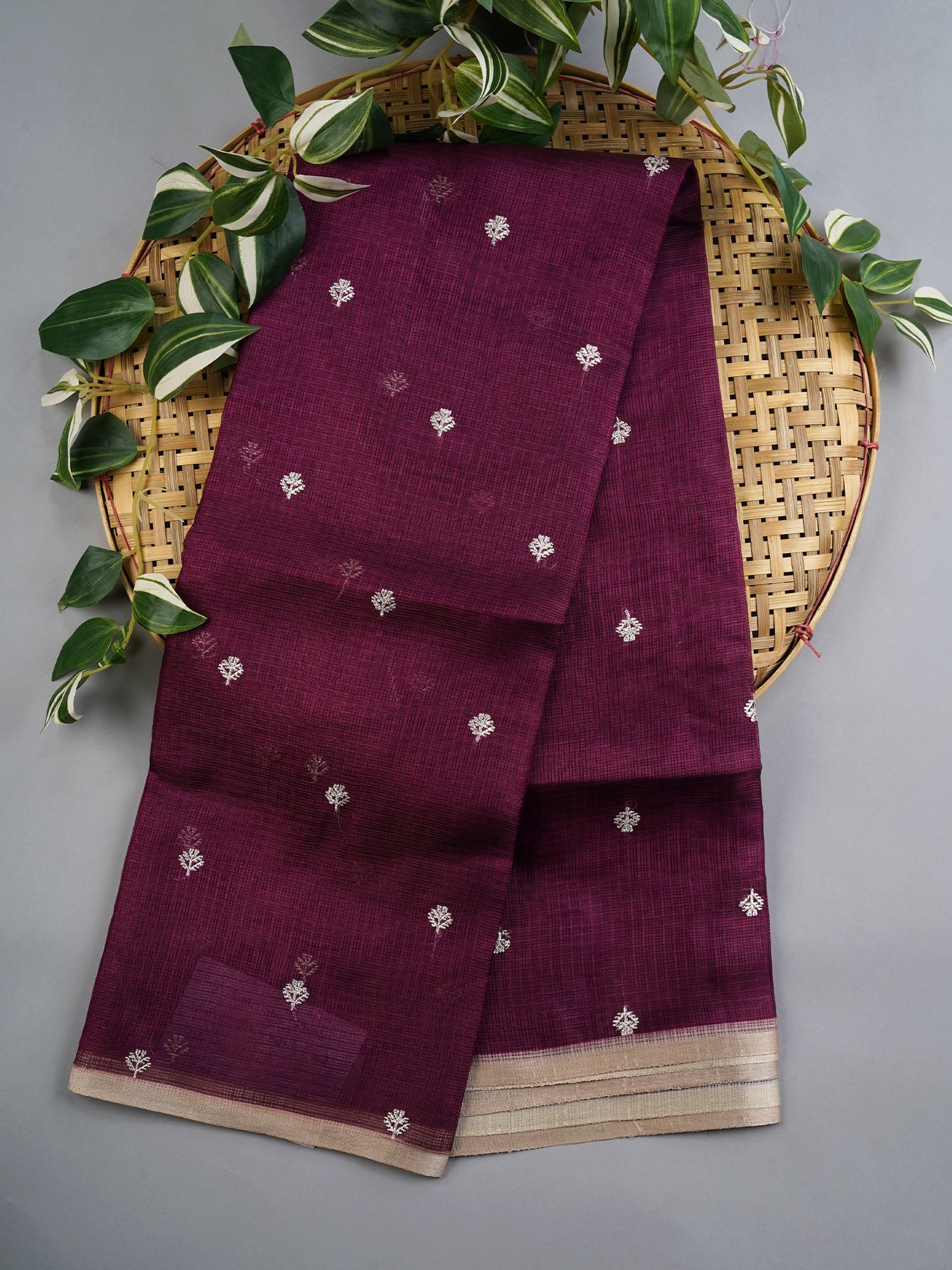 Drape yourself in pure elegance with this stunning Silk Kota saree that's ready to steal the spotlight! The luxurious silk fabric flows beautifully, while intricate silver zari butties scattered across create a mesmerizing sparkle that catches every eye. The rich wine hue adds a touch of sophistication, perfectly complemented by the gleaming gold border that frames the saree with regal charm. Whether you're heading to a celebration or a special occasion, this saree promises to make you feel absolutely radiant and unforgettable.