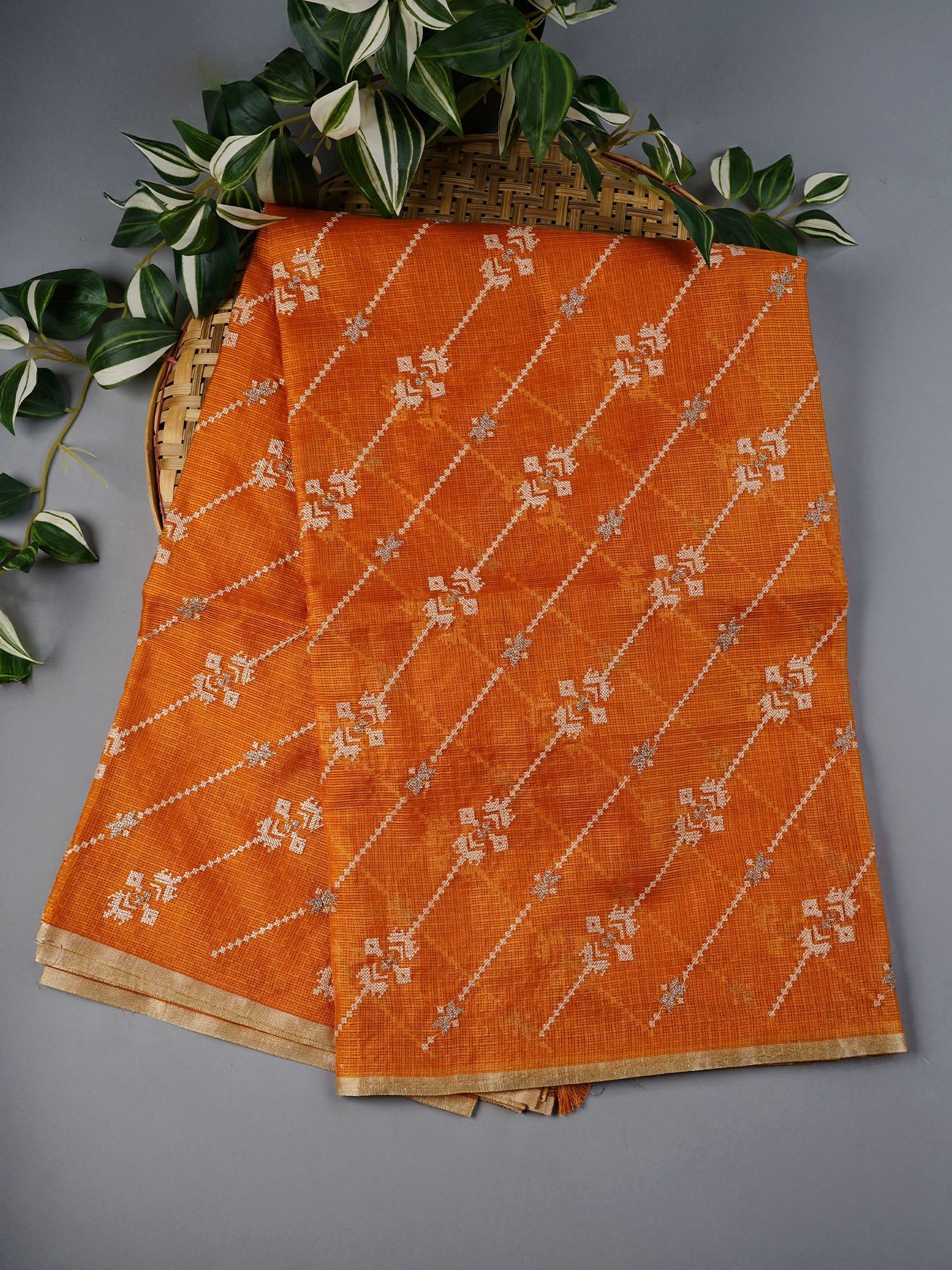 Silk Kota Saree With Allover Thread Embroidery Work With Gold Border - Mustered