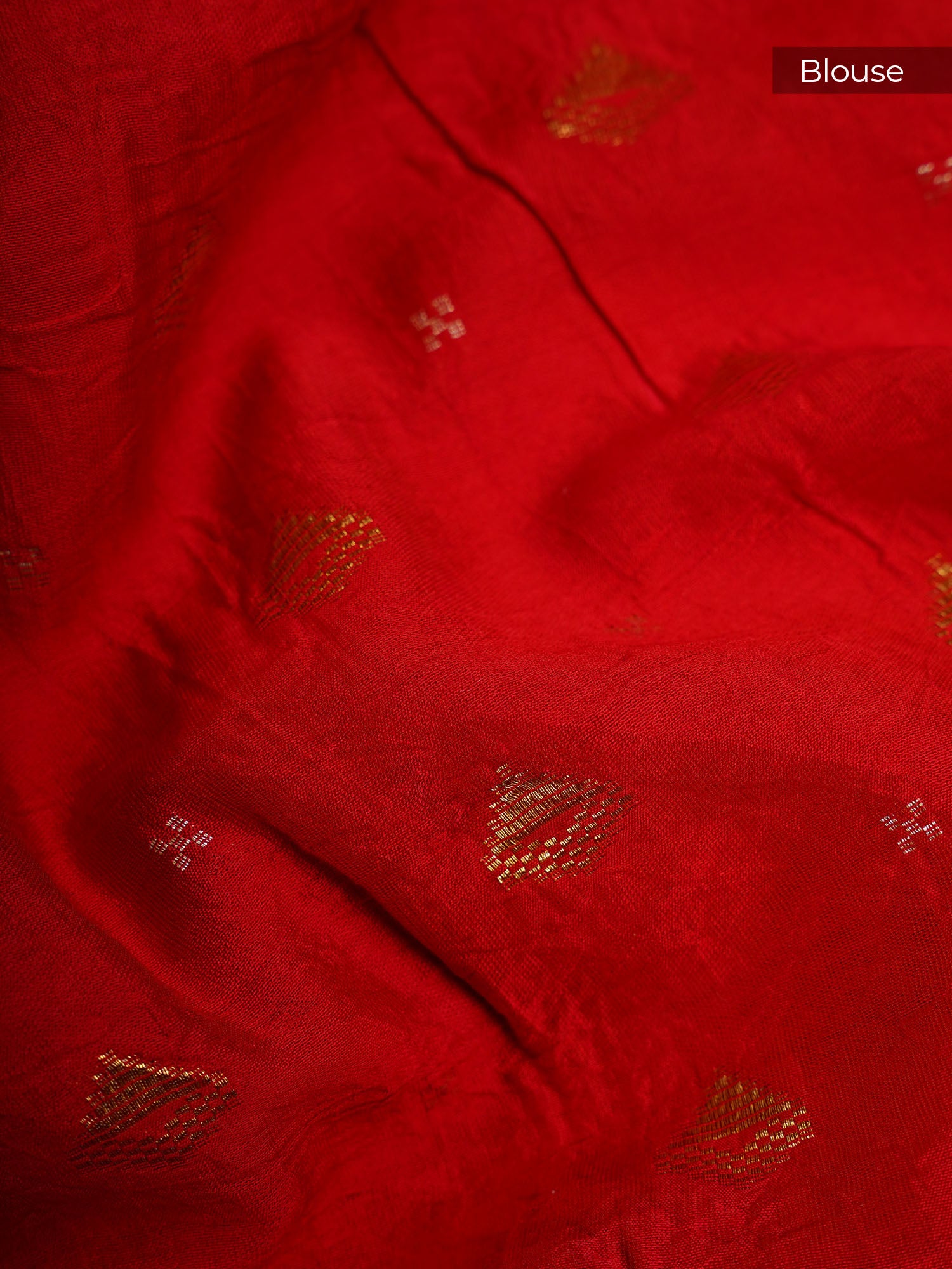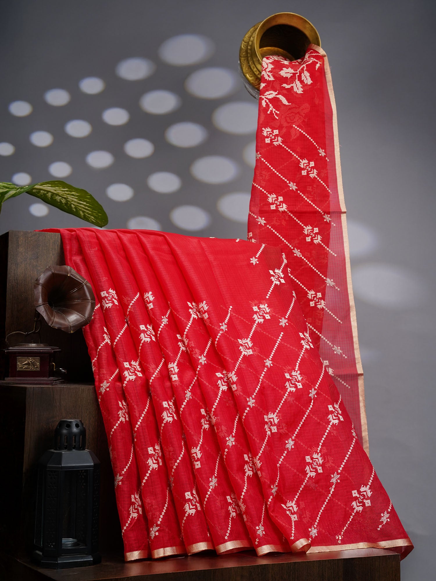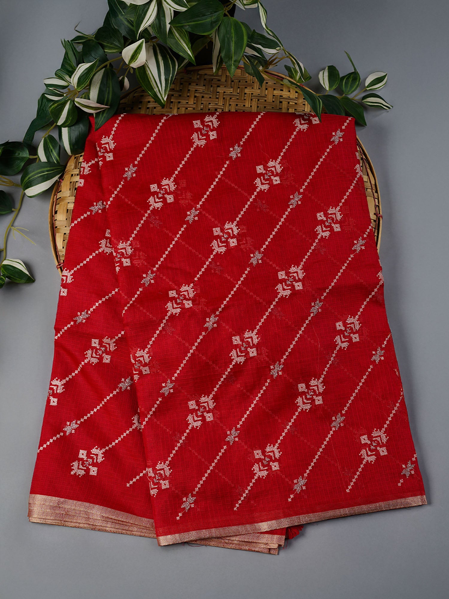 Silk Kota Saree With Allover Thread Embroidery Work With Gold Border - Red