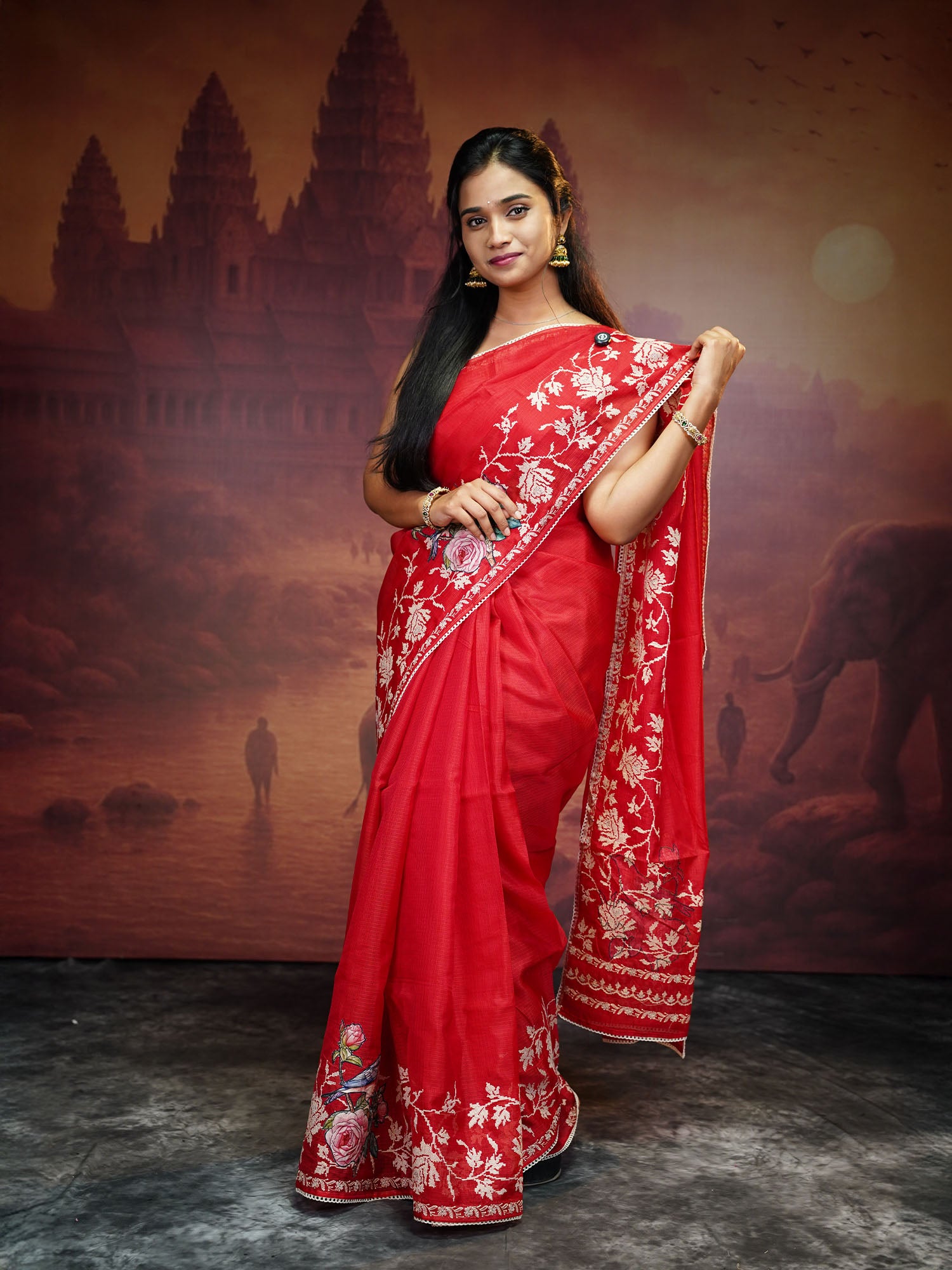 Drape yourself in timeless elegance with this stunning red silk Kota saree! Featuring intricate applique and delicate thread work that dance across the fabric, this piece is a celebration of traditional craftsmanship. The ornate lace border adds a touch of sophistication, making it perfect for weddings, festivals, or those moments when you want to feel absolutely radiant. Lightweight yet luxurious, this saree effortlessly transitions from day celebrations to evening gatherings. A wardrobe essential that never goes out of style.