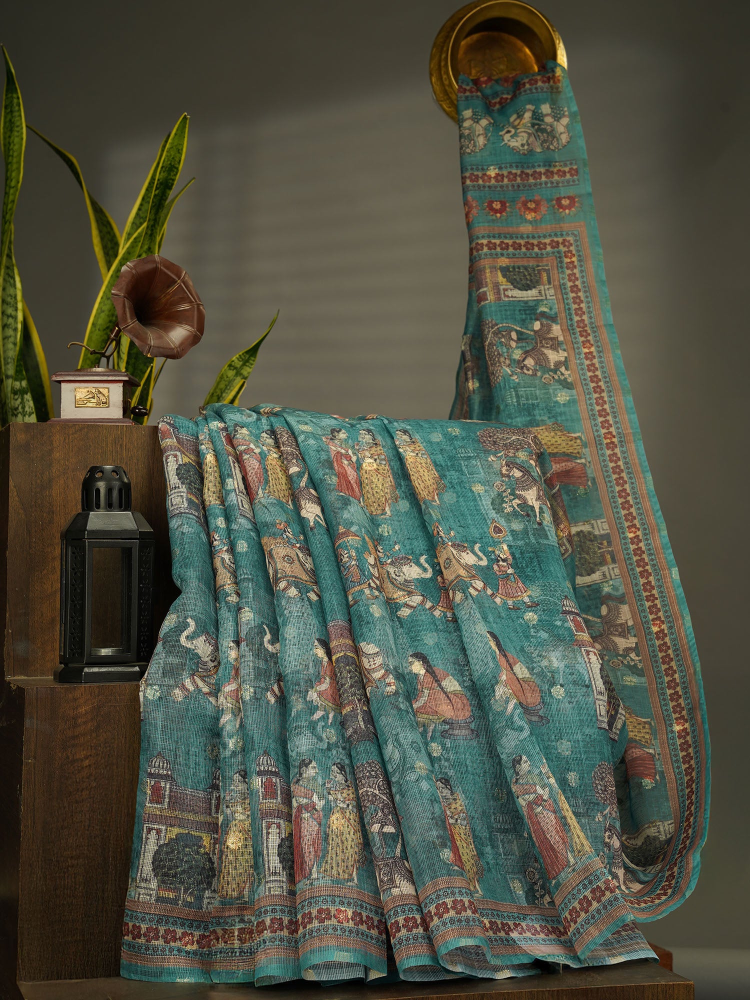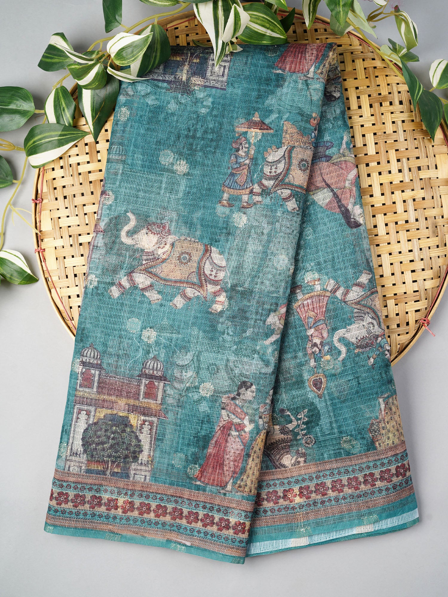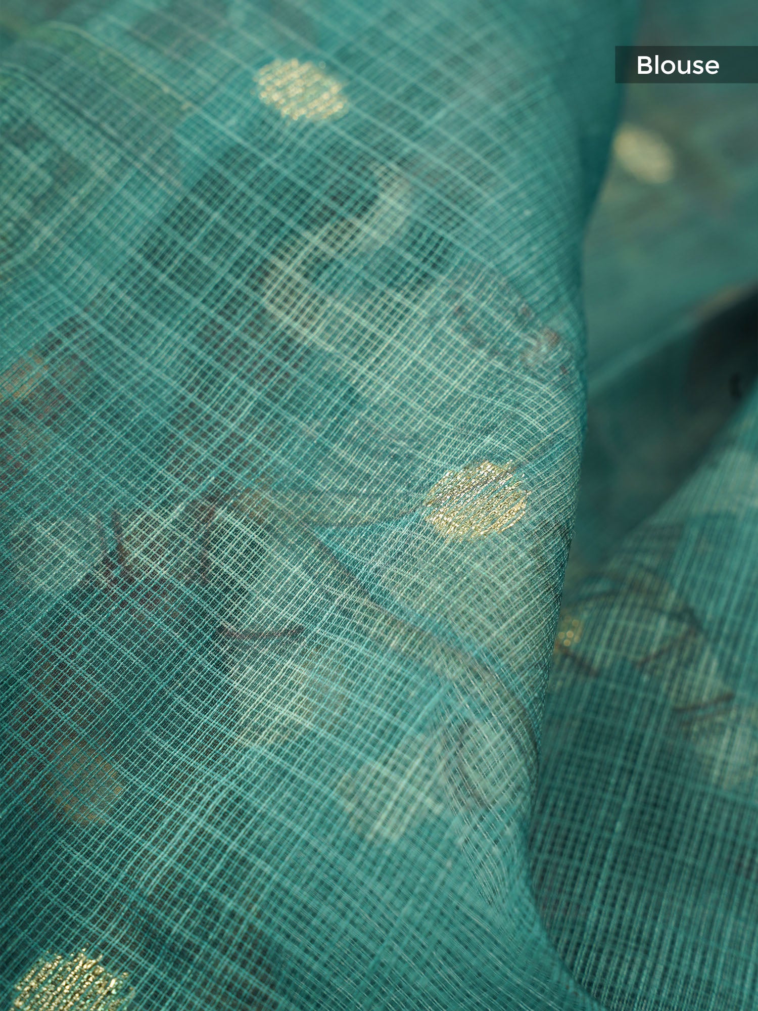 Drape yourself in elegance with this stunning Silk Kota saree that's pure magic! The rich bottle green backdrop gets a modern twist with vibrant digital prints that dance across the fabric, while delicate gold weaving butties add that perfect sparkle of traditional charm. Lightweight yet luxurious, this saree is your go-to for celebrations, festivals, or whenever you want to turn heads. The perfect blend of contemporary design and timeless sophistication—because who says you can't have the best of both worlds?