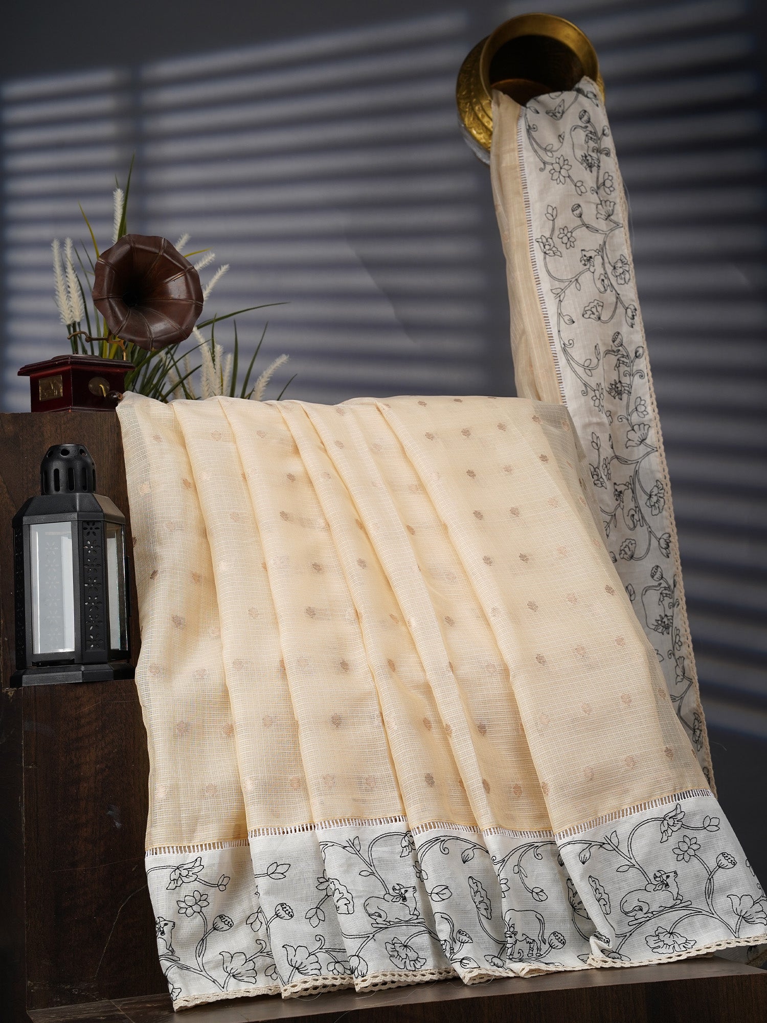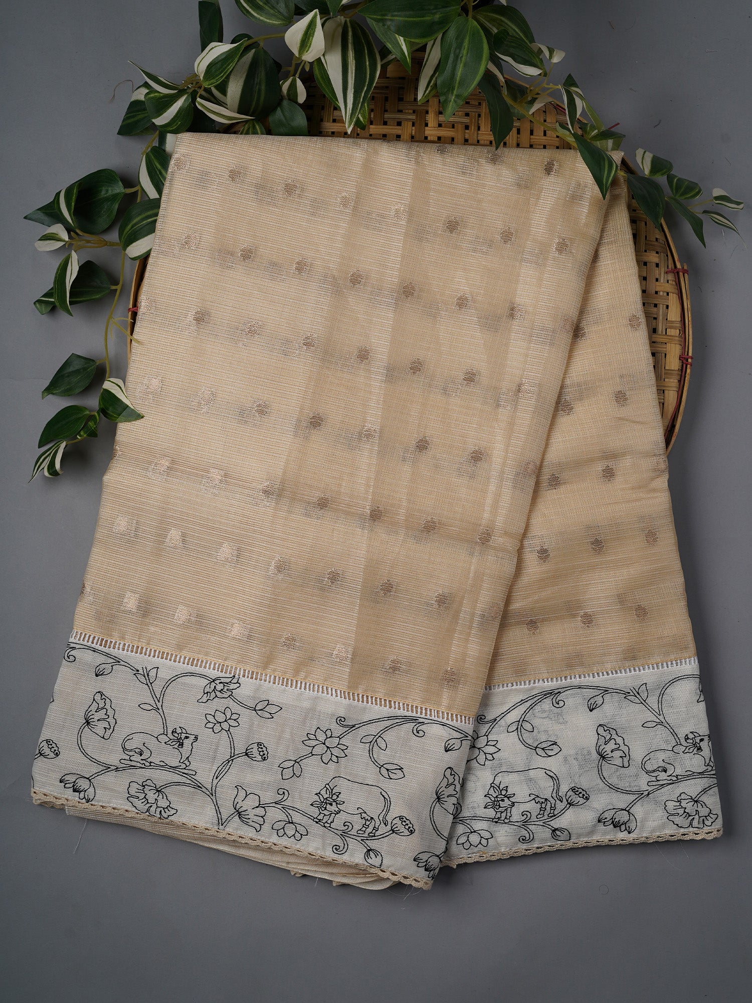 Elevate your ethnic wardrobe with this stunning Silk Kota saree that's equal parts elegance and charm. Crafted in luxurious silk, it features delicate gold butties scattered across the fabric like tiny treasures, paired with a striking contrast border that frames your look beautifully. The intricate thread work adds depth and texture, making every drape feel special. Perfect for weddings, festivals, or those moments when you want to feel absolutely radiant. The soft beige tone is versatile enough to complement any skin tone and pairs effortlessly with your favorite jewelry. Drape it, own it, shine in it.