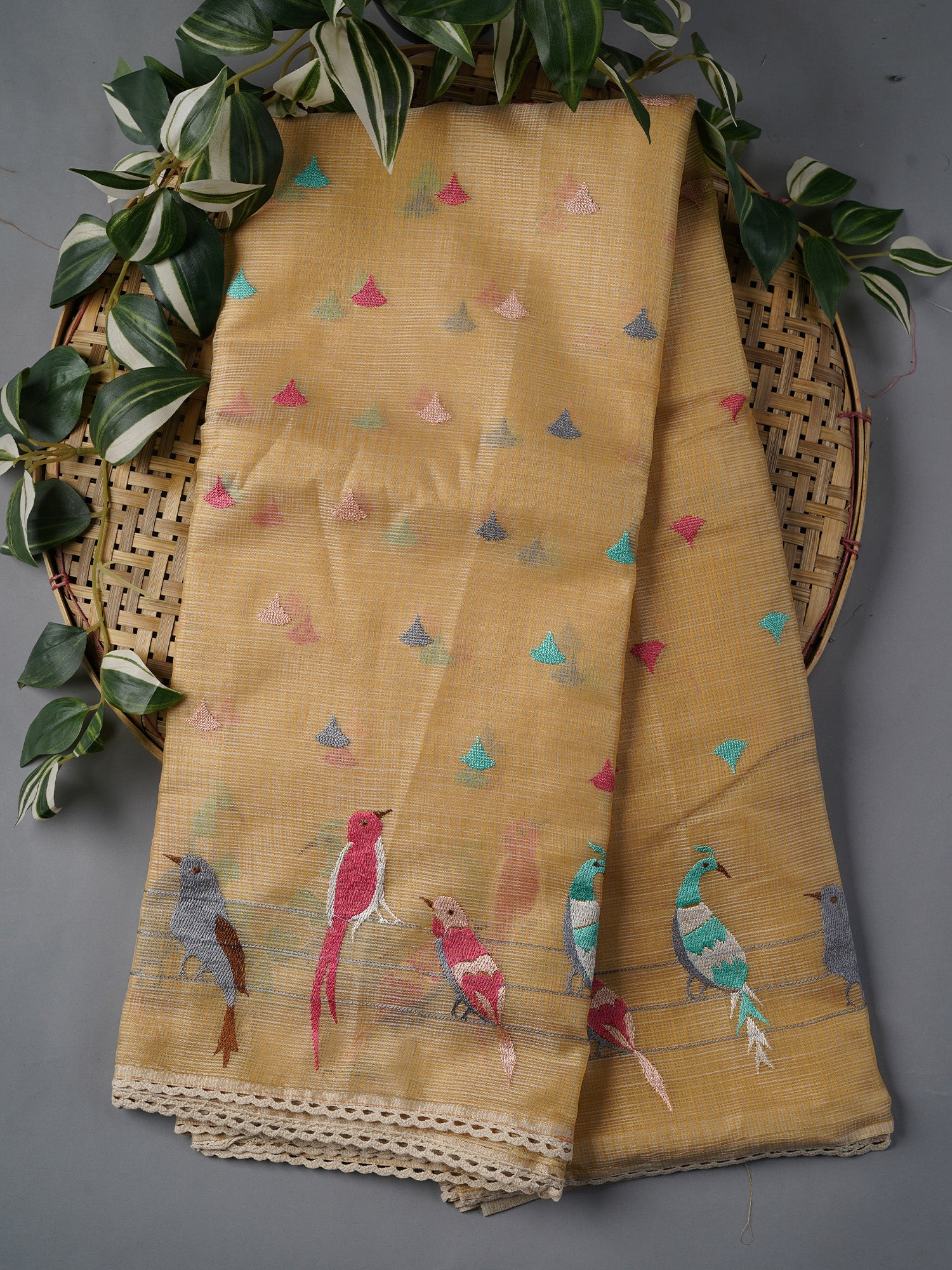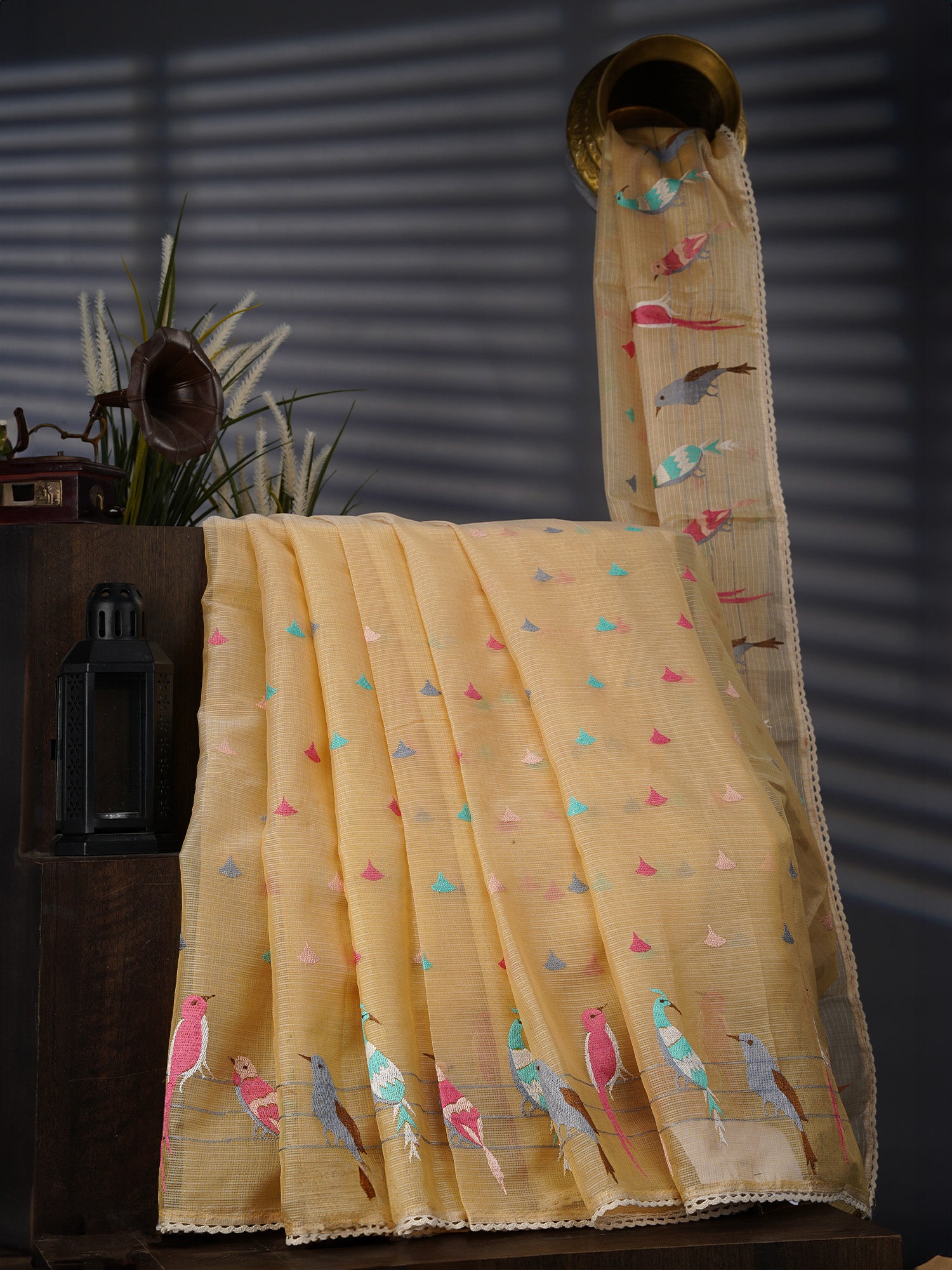 Silk Kota Saree With Thread Embroidery Butties And Lace Border - Cream