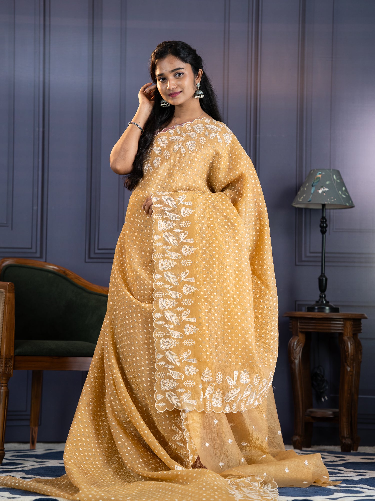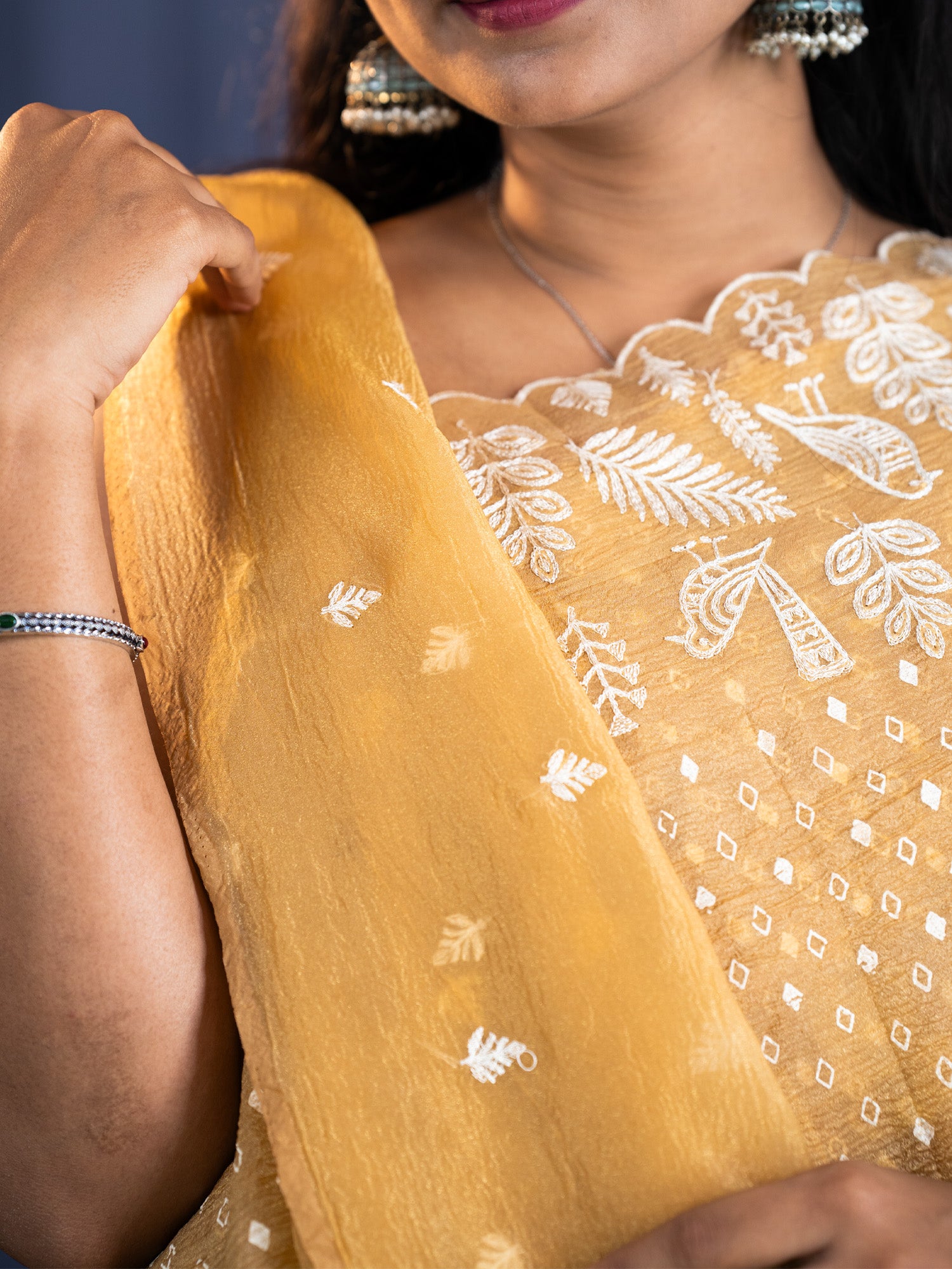 Experience understated luxury with this Soft Crush Tissue saree in a versatile tan hue. The fabric's delicate composition ensures a feather-light drape while maintaining structural integrity throughout the day. Adorned with intricate thread embroidery that demonstrates exceptional artisanal skill, each motif is carefully executed for visual impact. The decorative scallop border frames the saree with refined elegance, adding dimension without overwhelming the design. Ideal for discerning wearers who appreciate quality construction and timeless aesthetics, this piece transitions seamlessly from celebrations to formal occasions. The breathable tissue material makes it an excellent choice for warm climates and extended wear.