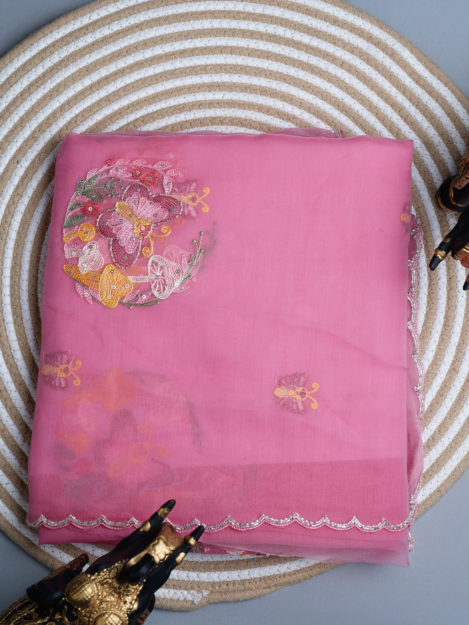 Soft organza saree with thread Embroidery butties and scallop border With sequence work - Pink