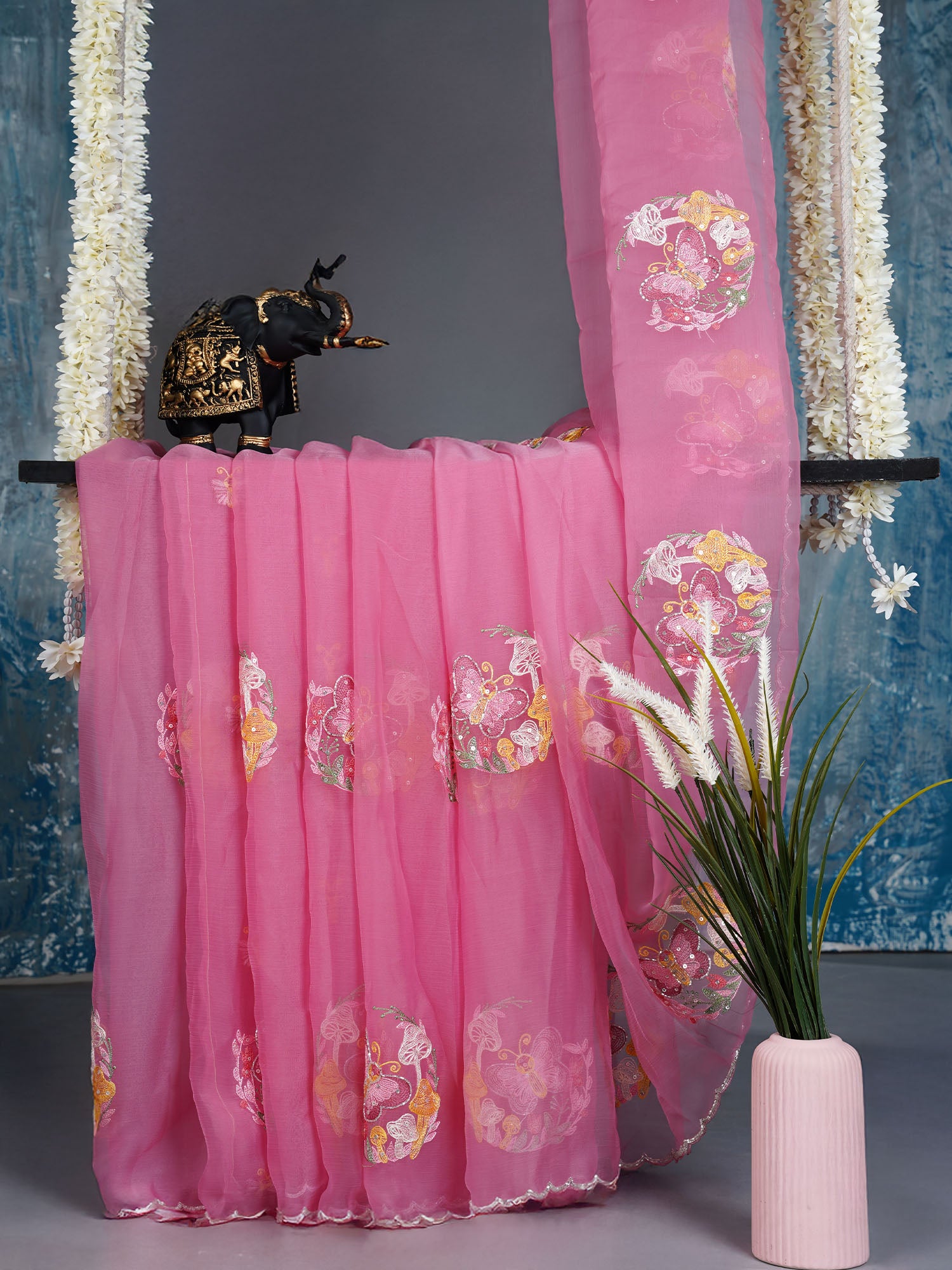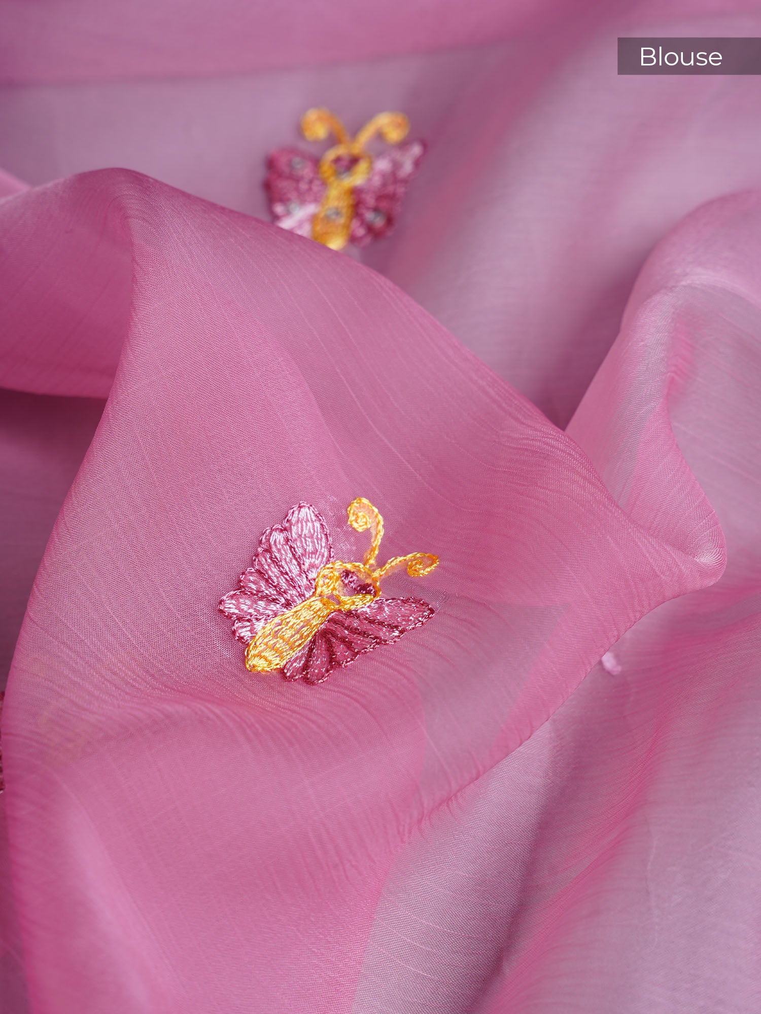Drift into elegance with this stunning pink organza saree that whispers sophistication at every turn. Delicate thread embroidery butties dance...
