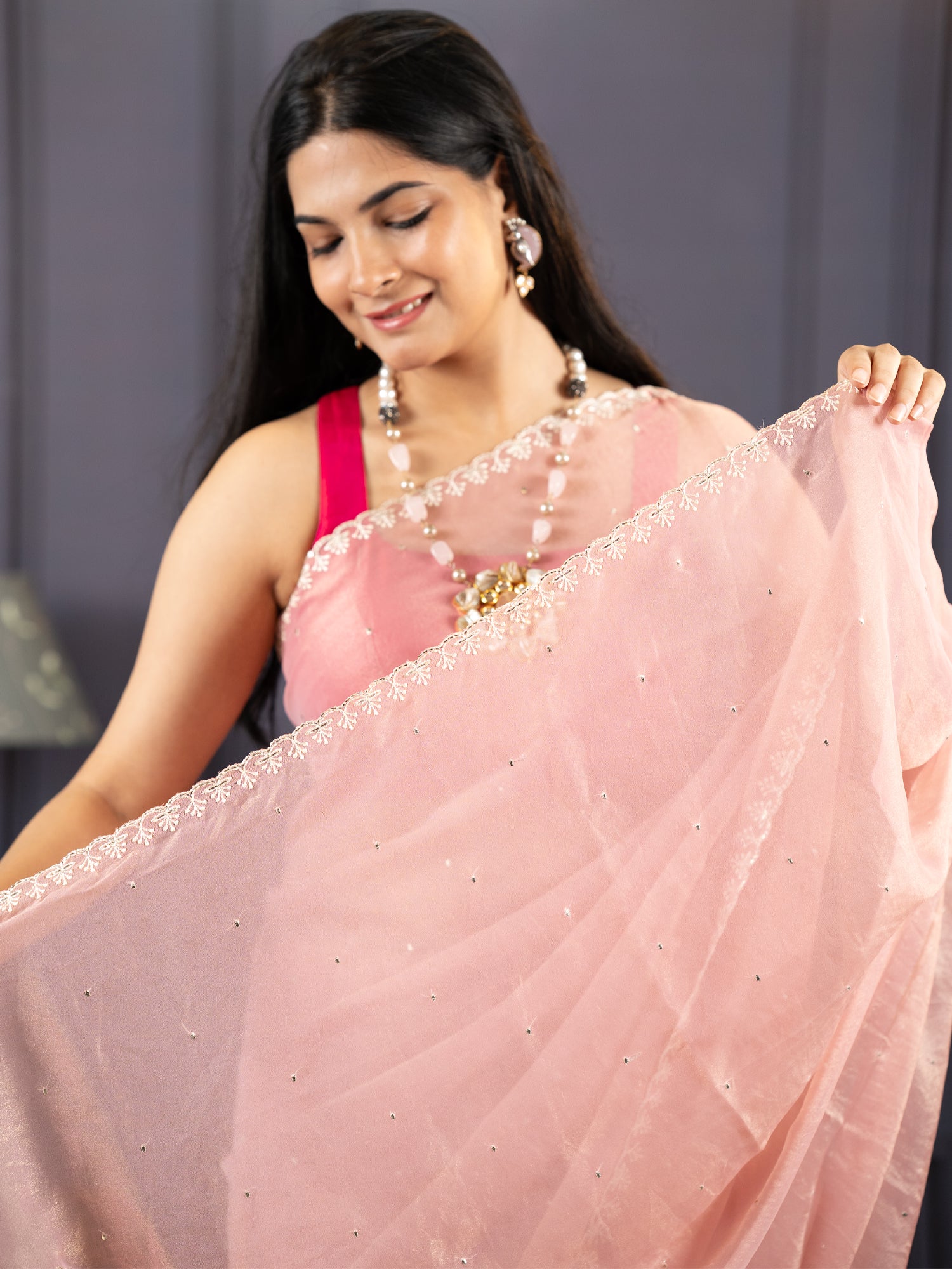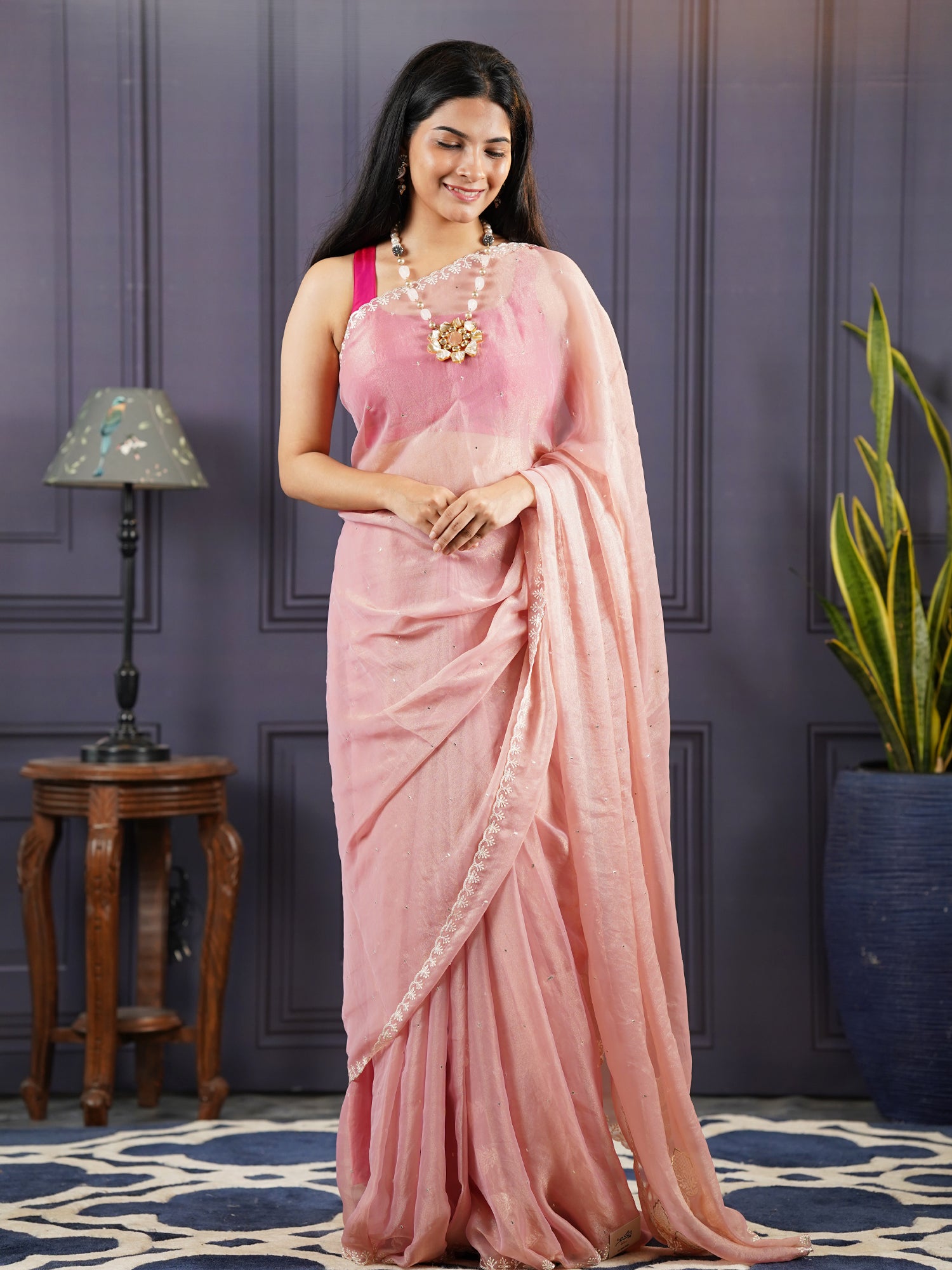 Drape yourself in ethereal elegance with this exquisite Soft Organza Tissue Saree. Crafted from premium organza tissue fabric, this saree offers a delicate, translucent quality that creates a graceful silhouette. The intricate hand work adorning the fabric showcases traditional artisanal craftsmanship, while the ornate scallop border adds a refined finishing touch. The soft light pink hue provides a versatile, sophisticated palette suitable for weddings, celebrations, and formal occasions. Perfect for those who appreciate fine textiles and timeless design, this saree combines comfort with understated luxury.