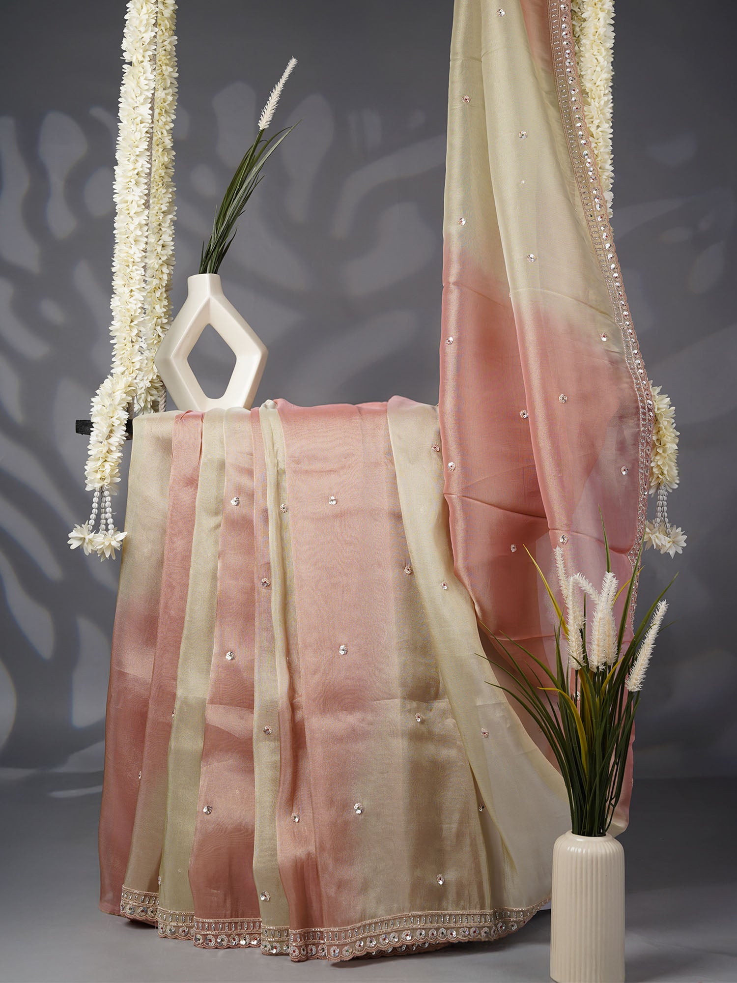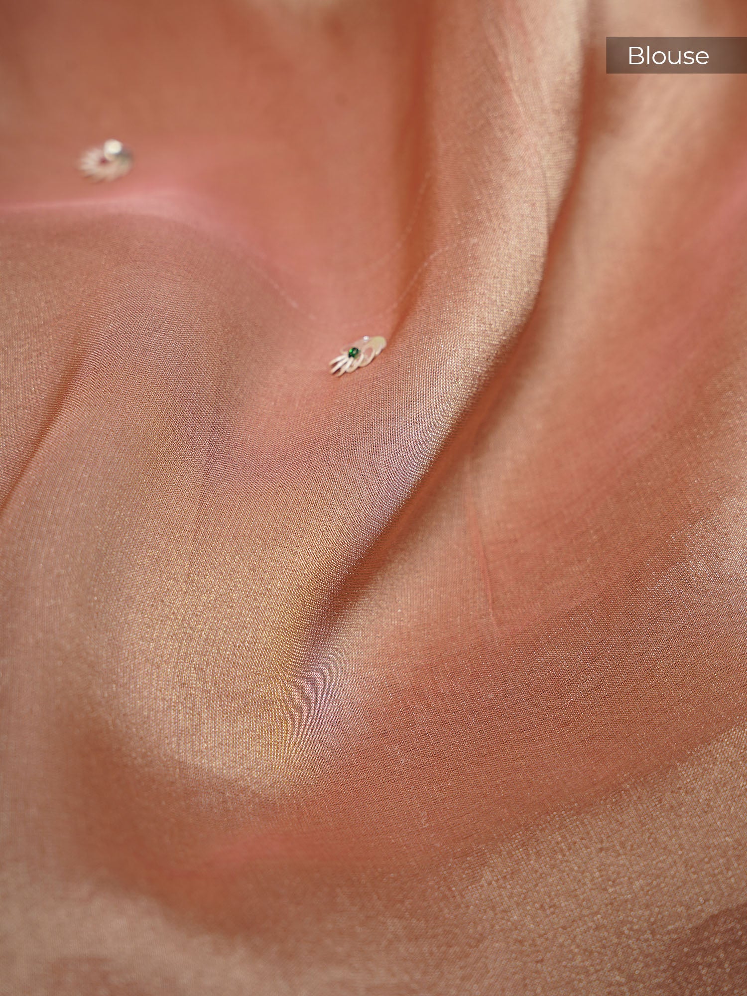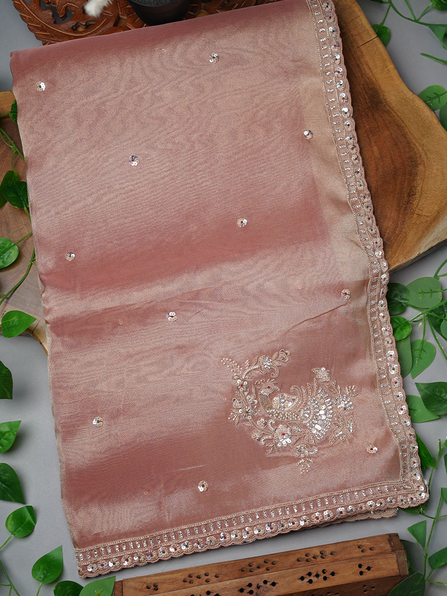 Soft Tissue Organza Saree Sequence Butties and Scallop Border and Zardoji Work- Peach