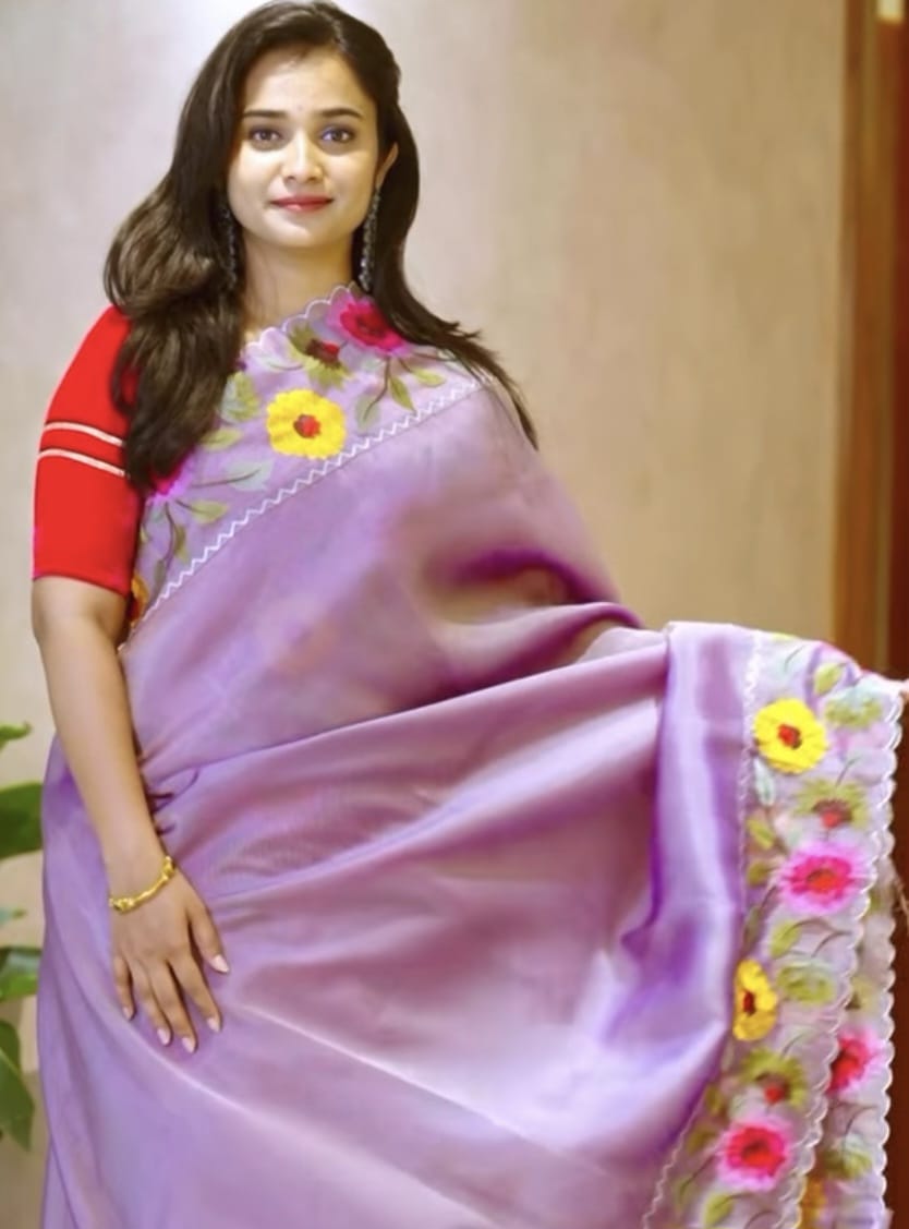 Soft tissue Organza saree with Thread work and scallop border - Lavender